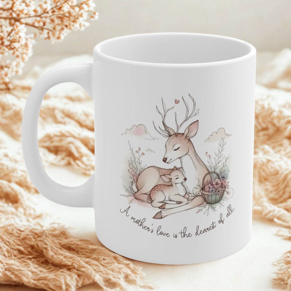 Celebrate the special bond between a mother and her child with this heartwarming “A Mother’s Love is the Dearest of All” mug. Featuring a charming illustration of a mother deer and her baby, this mug beautifully represents the love and care that only a mother can give. Made from high-quality white ceramic with a glossy finish, this mug is perfect for enjoying your morning coffee, tea, or any beverage that brings you comfort.