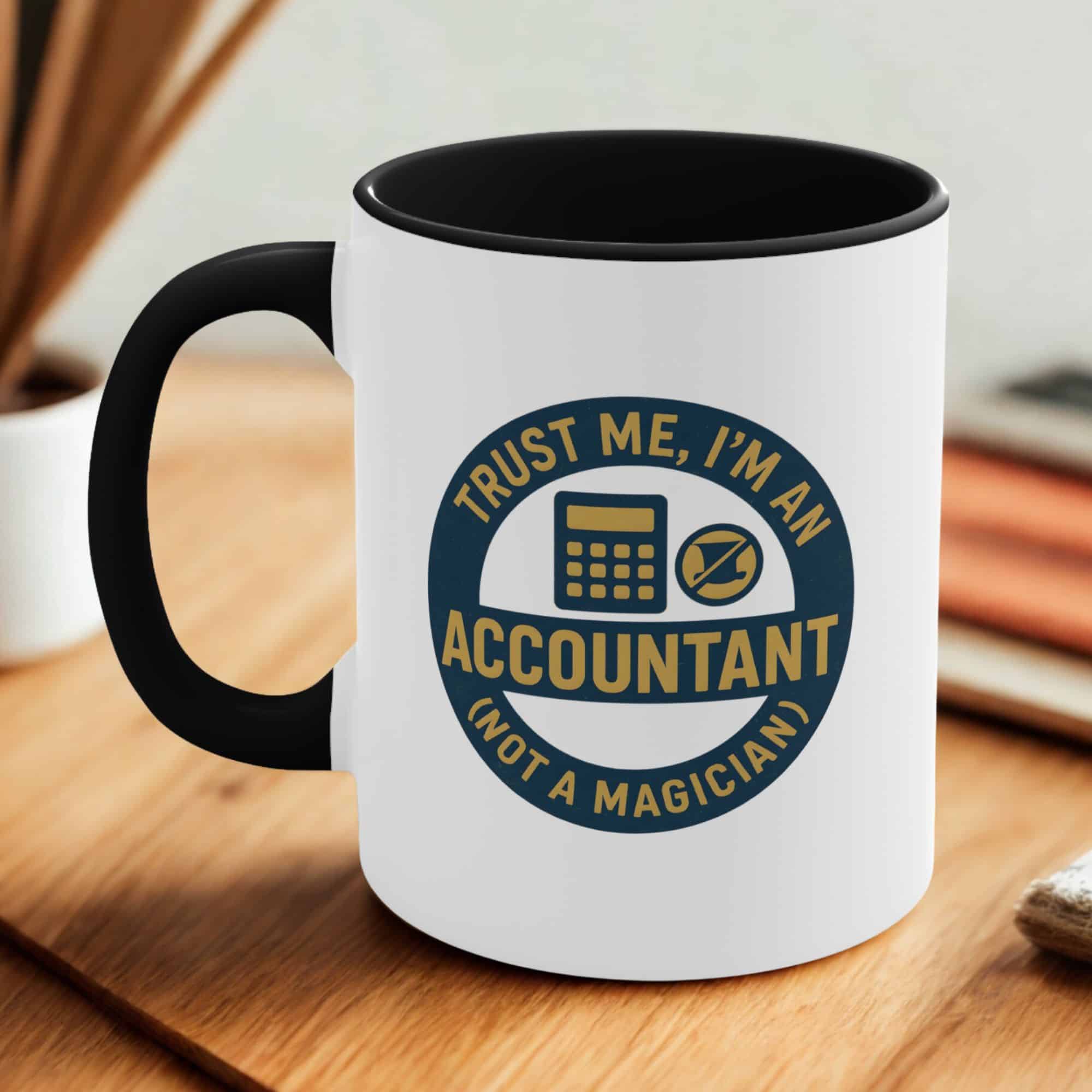Funny accountant gift mug with “Trust Me, I’m an Accountant (Not a Magician)” quote. Great for CPAs, tax professionals, and bookkeeping heroes.