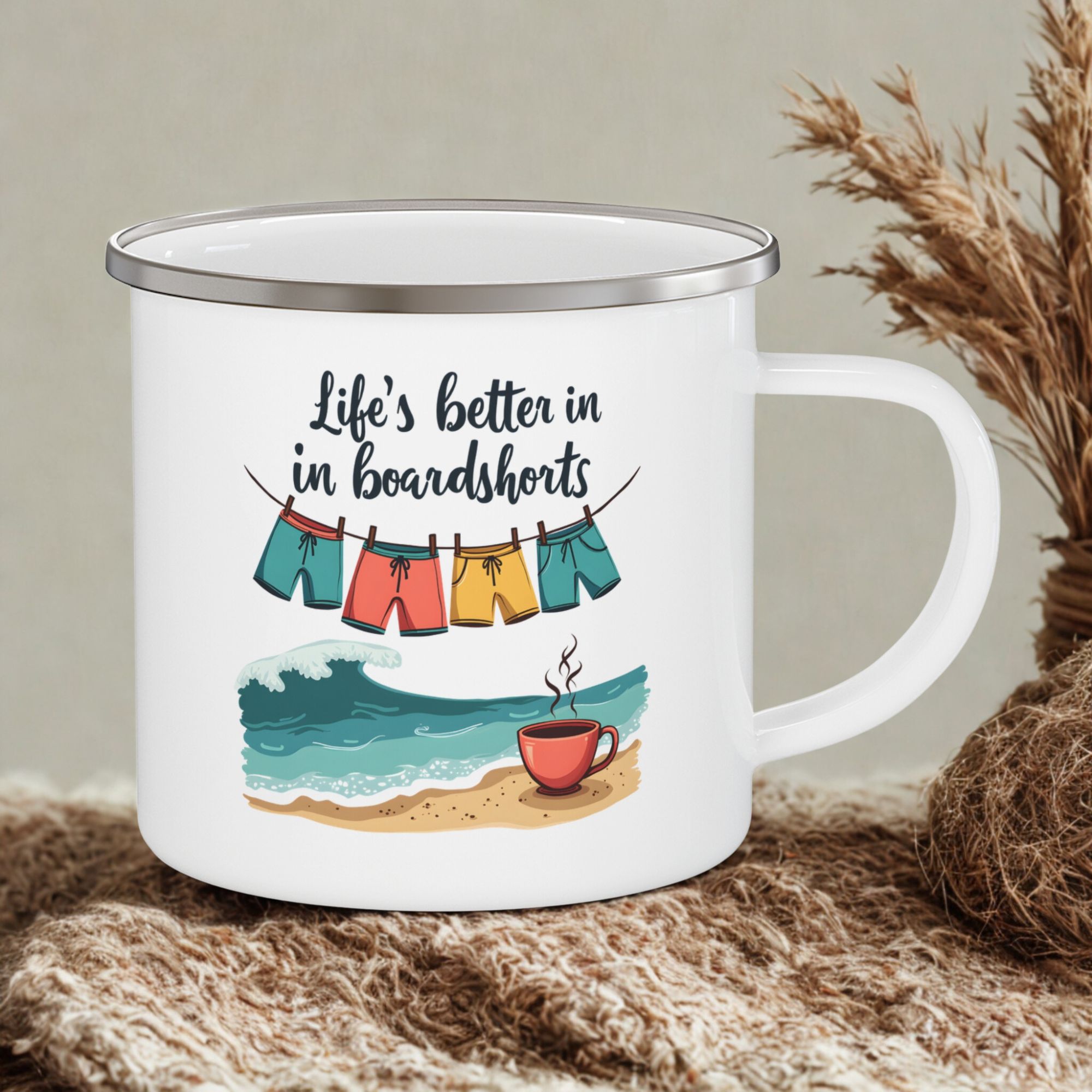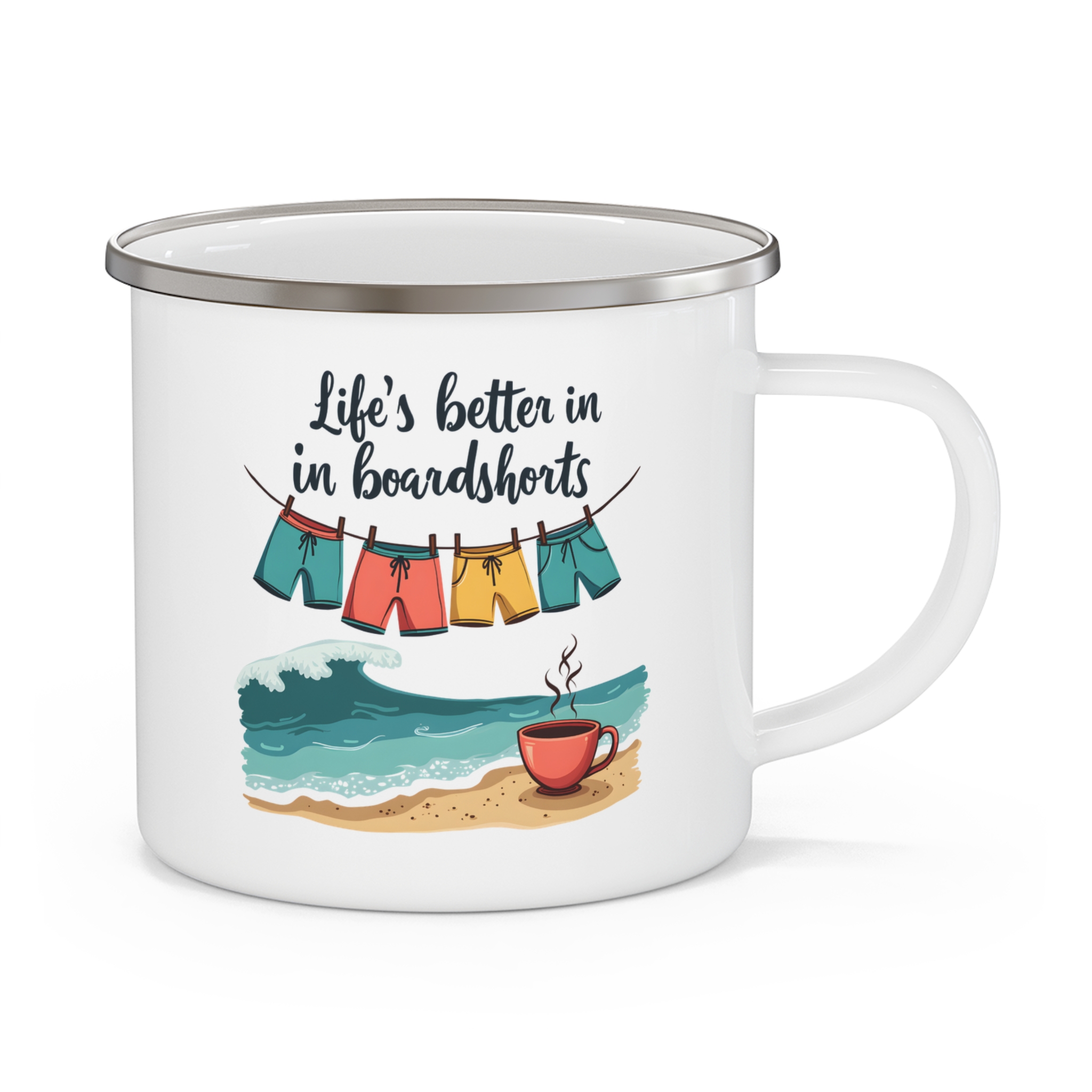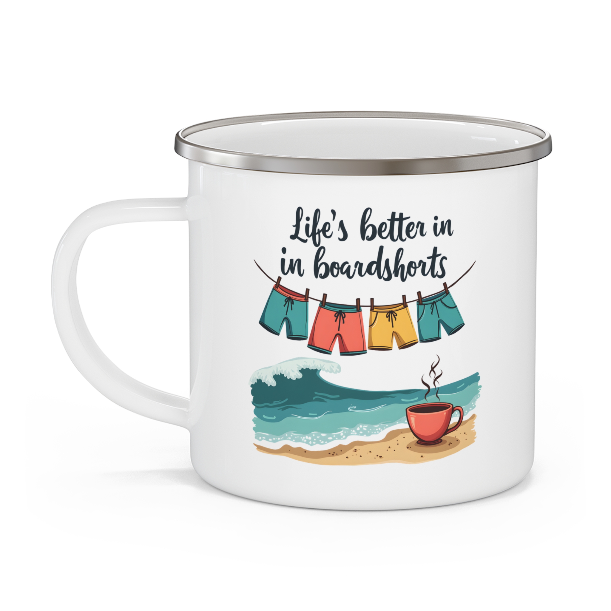 Enjoy coastal mornings with this aussie beach coffee mug. A relaxed 12oz enamel camping mug for beach lovers and coffee fans.