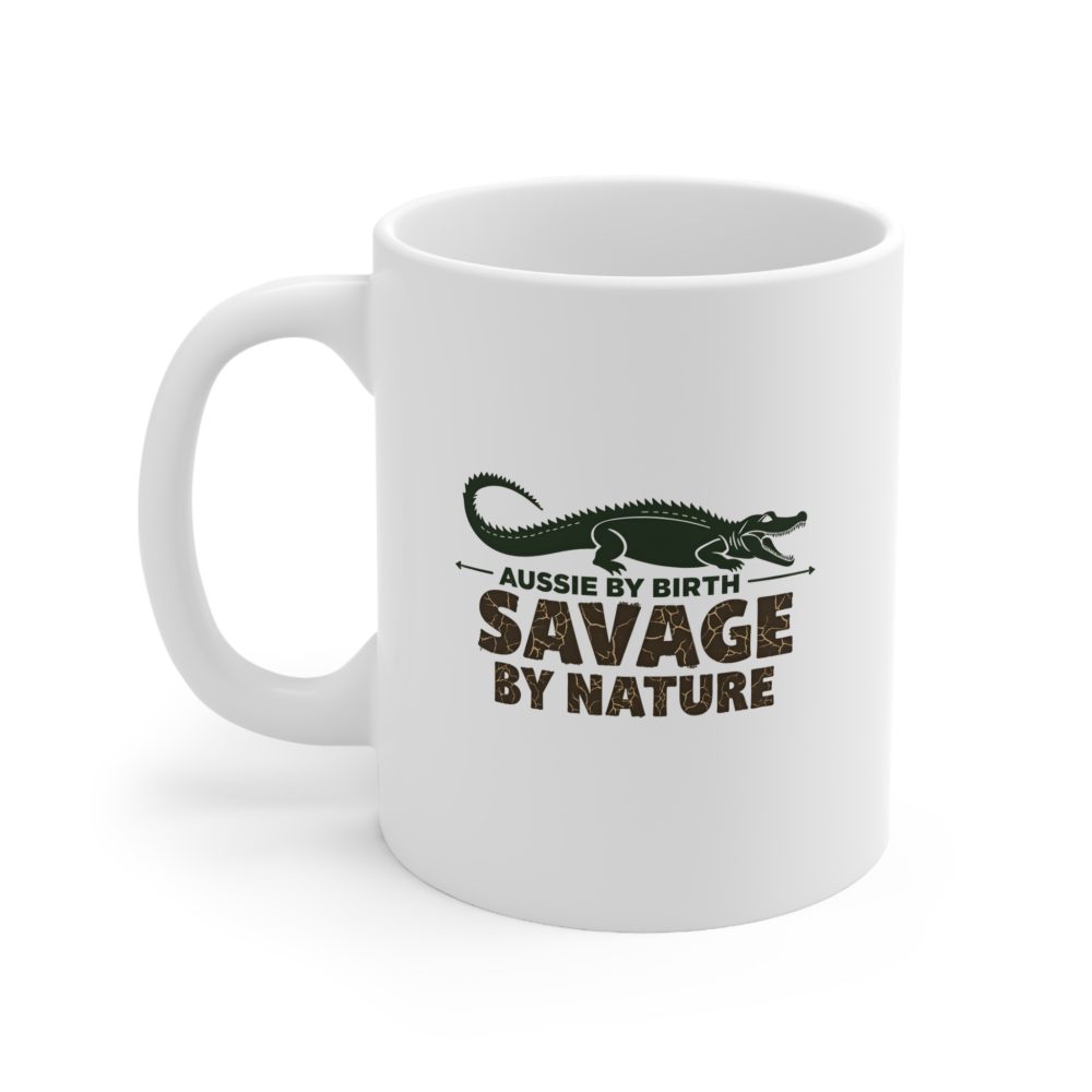 Bold crocodile mug with “Aussie By Birth, Savage by Nature” in rugged font—perfect for fans of Australian animals and fierce brews.
