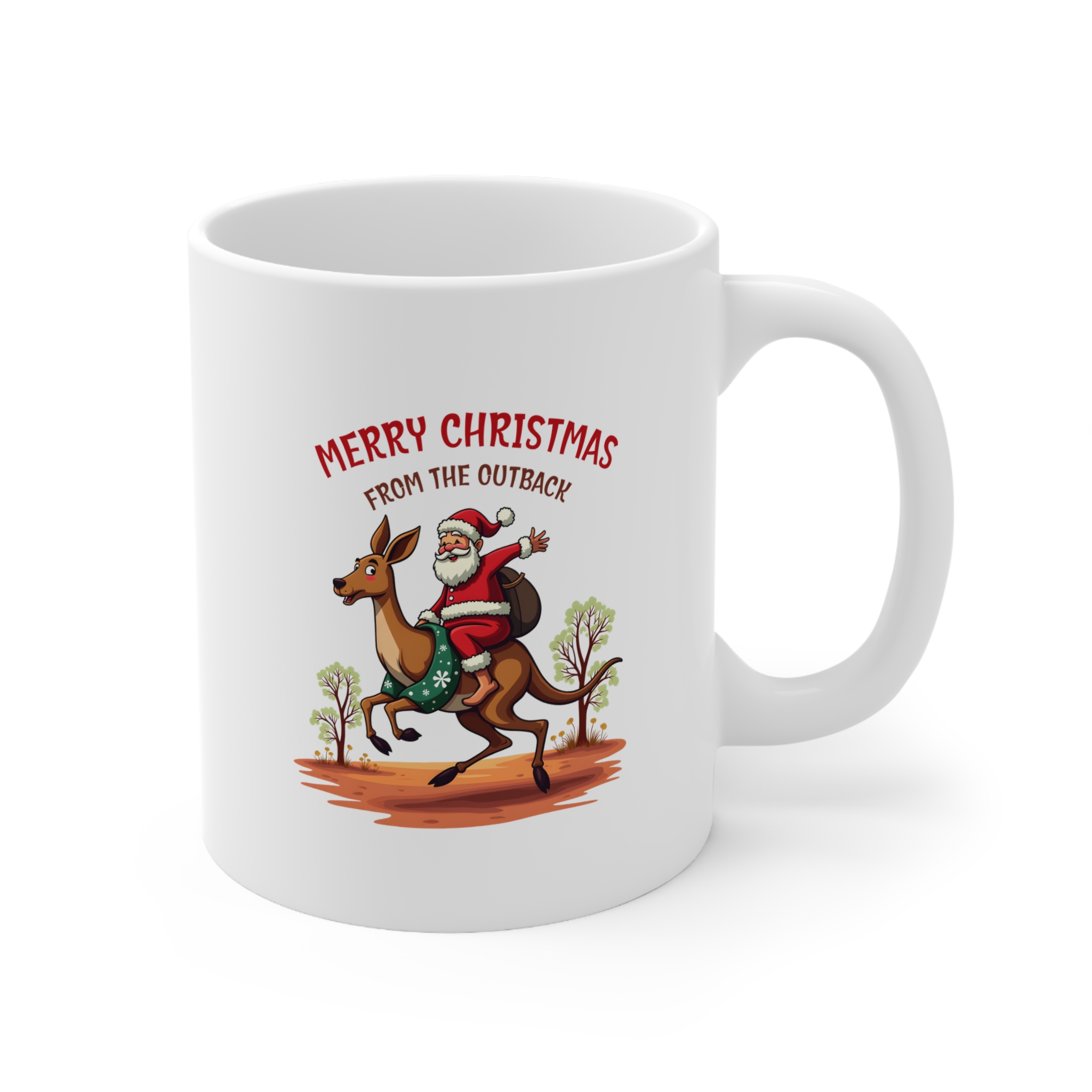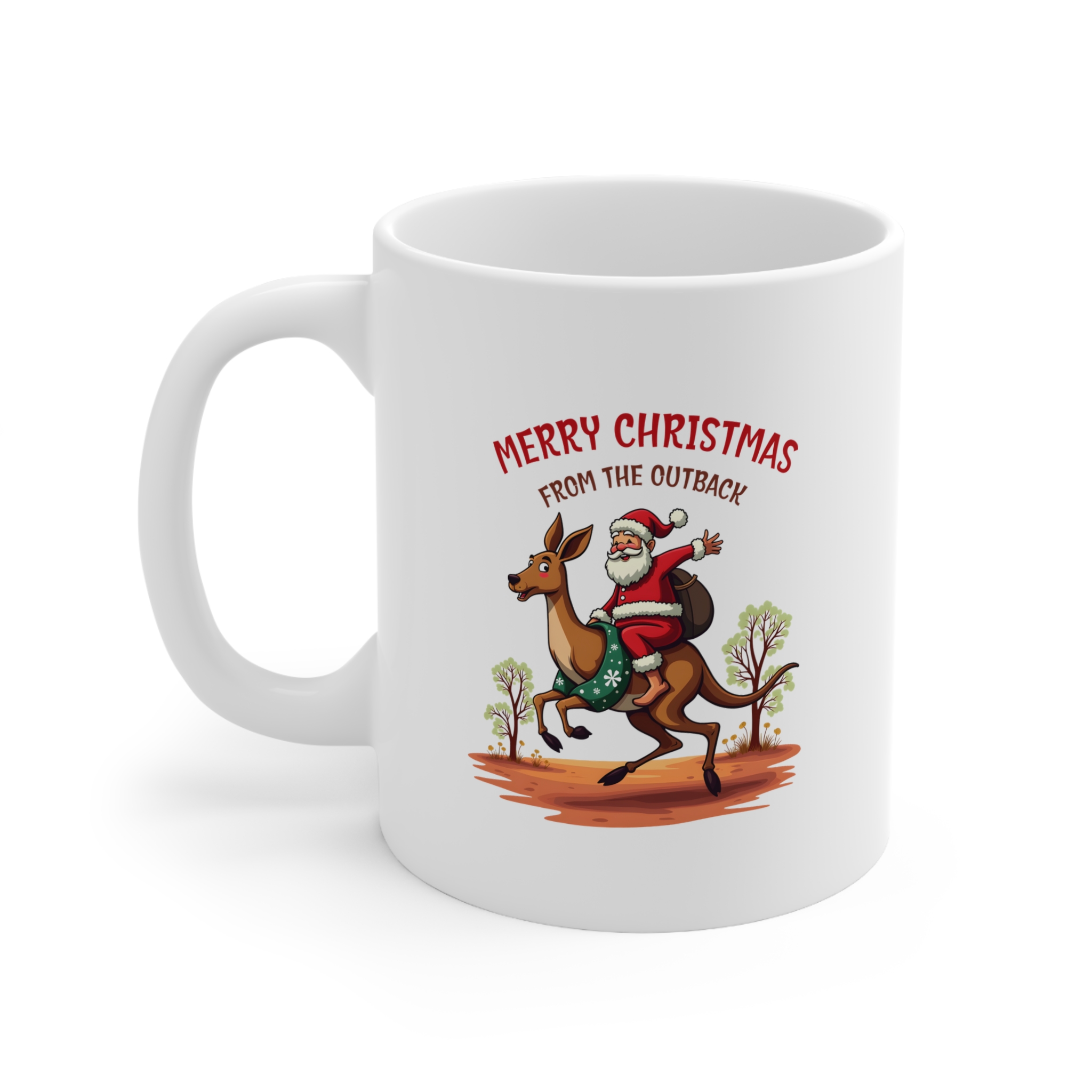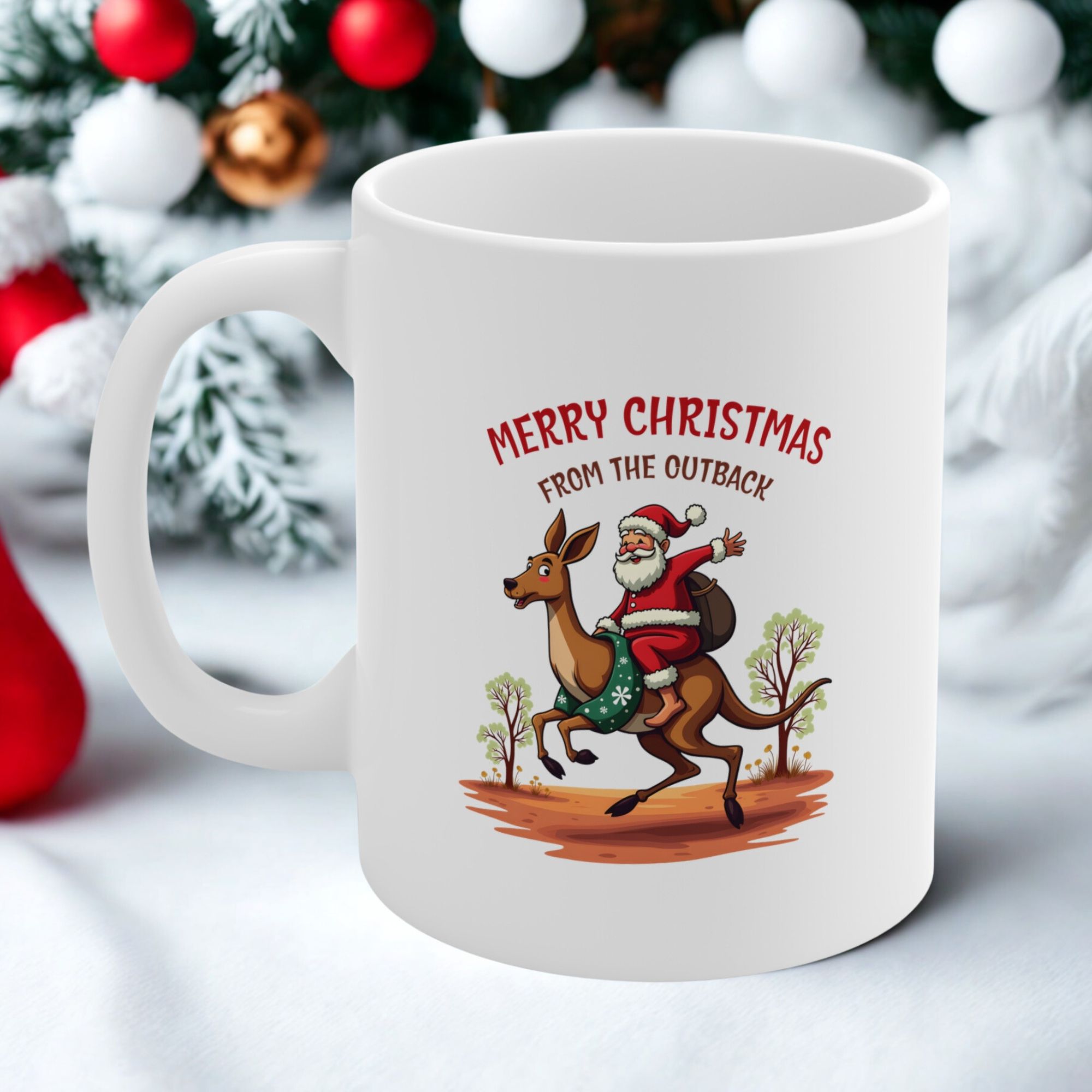 Bring festive cheer with a true-blue Aussie twist! The Merry Christmas from the Outback mug features a jolly Santa riding a kangaroo through the red dust, waving with joy as he spreads holiday spirit across the bush. With eucalyptus trees in the background and a classic Aussie landscape, this design captures everything we love about Christmas down under.