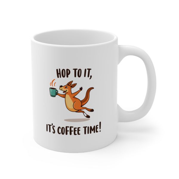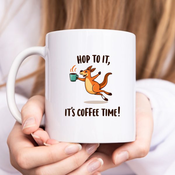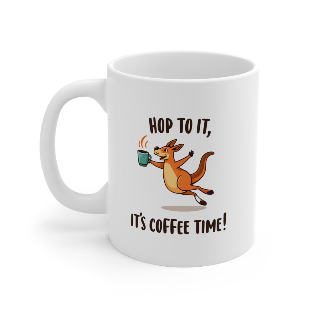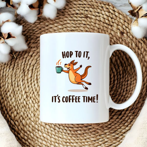 Australia Mug with playful “Hop to It, It’s Coffee Time!” text and joyful kangaroo holding coffee mid-jump — caffeine and Aussie bounce in one cup.