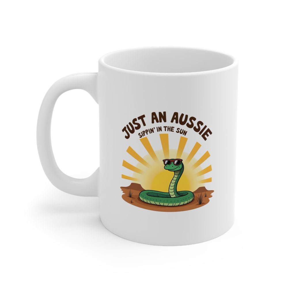 Australia Mug with lounging snake in sunnies and “Just an Aussie Sippin’ in the Sun” curved text — a sunny outback vibe in every sip.