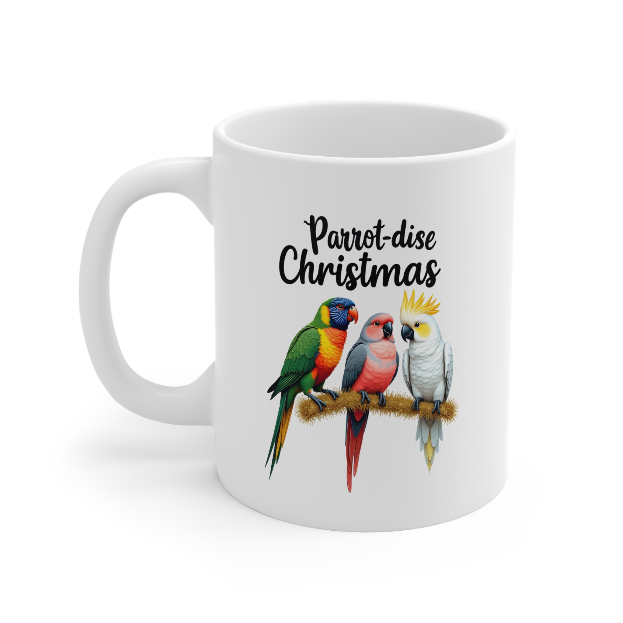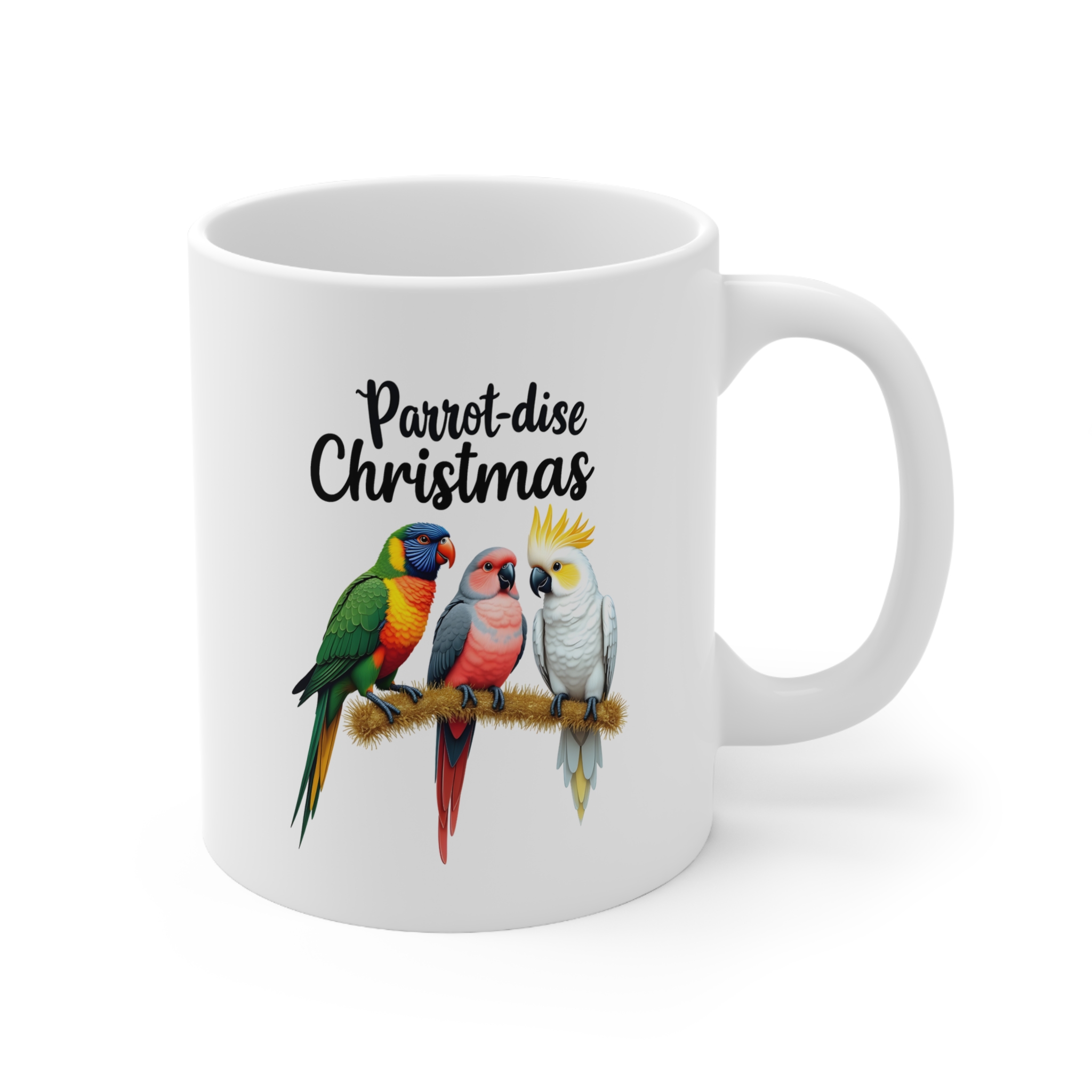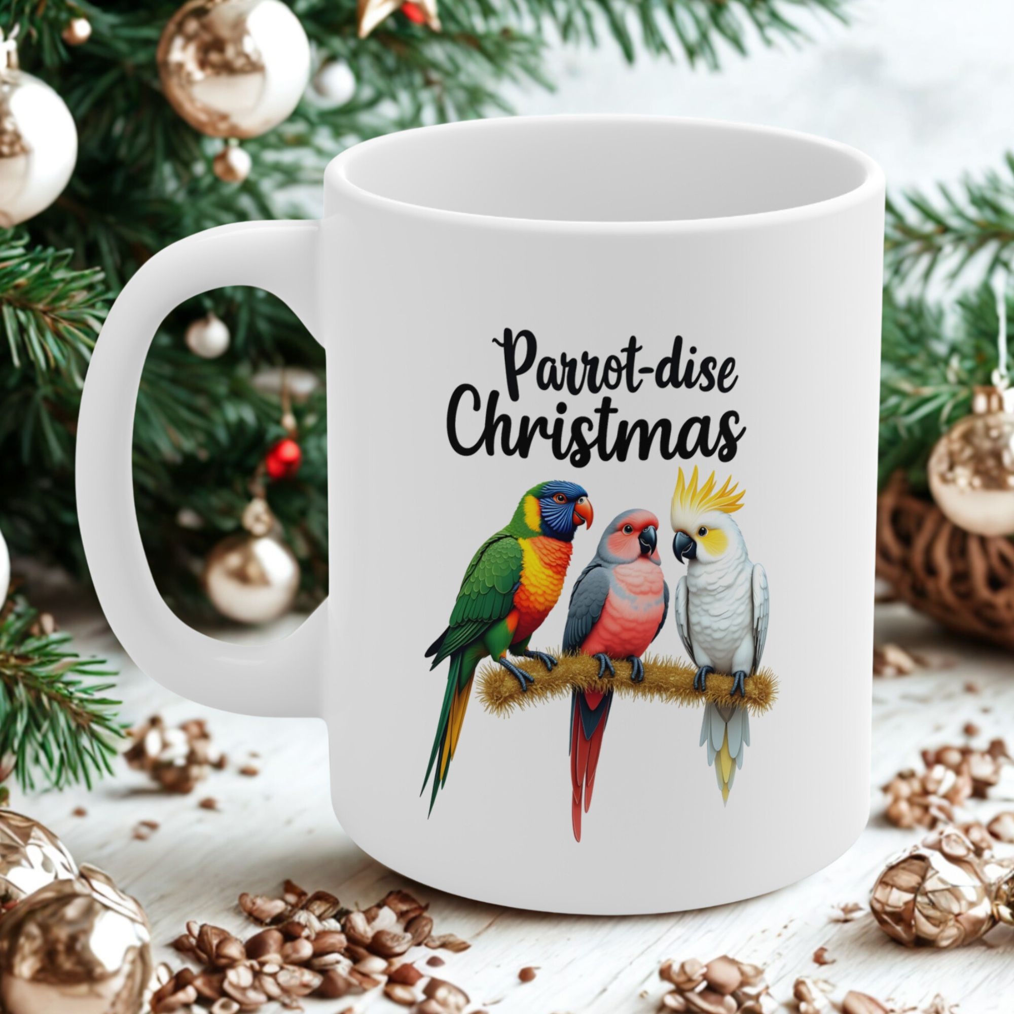 Bring a burst of feathered fun to your holiday mornings with the Parrot-dise Christmas mug! This festive design showcases three iconic Aussie parrots — a rainbow lorikeet, a galah, and a cockatoo — perched proudly on a rustic branch, all ready to squawk in the season with style.