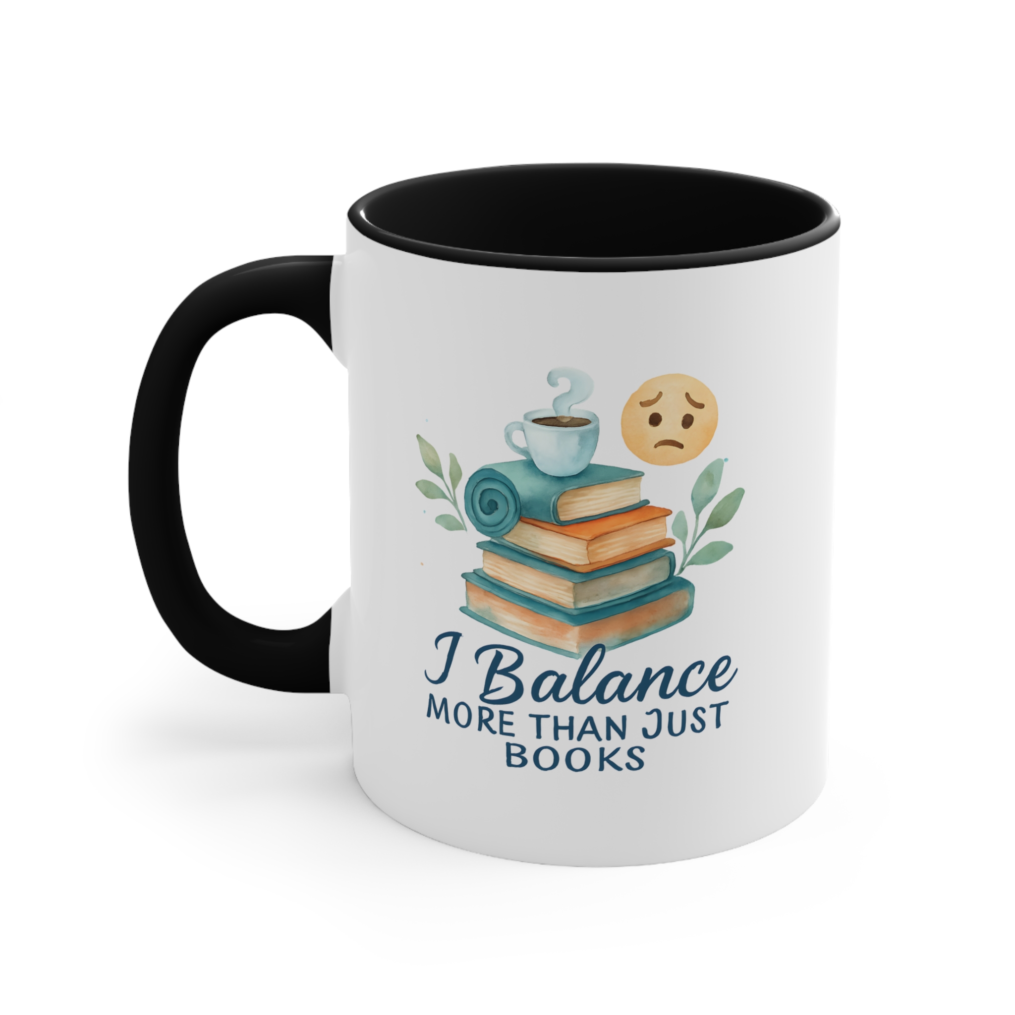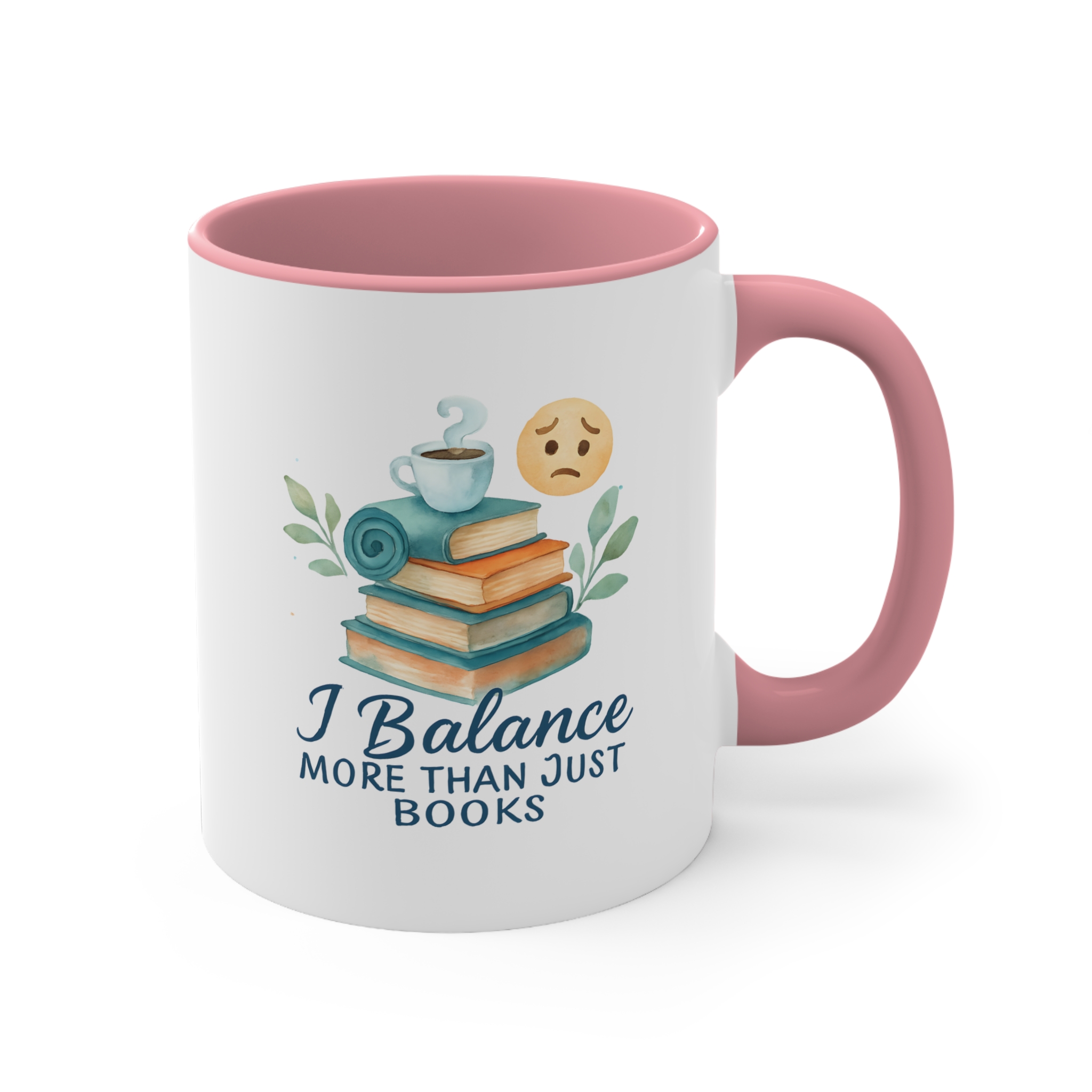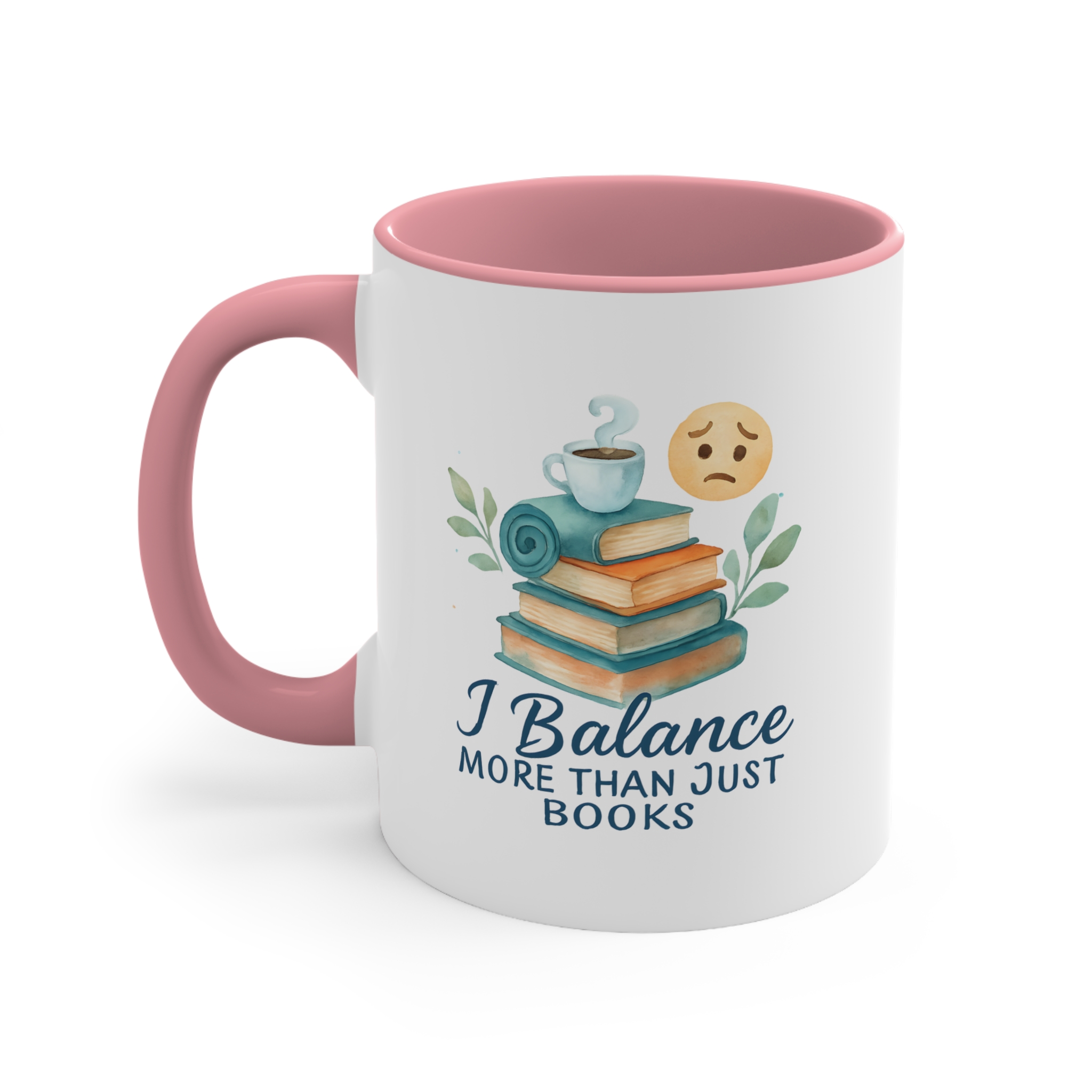 Watercolor-style “I Balance More Than Just Books” mug with books, coffee, and emotional balance icons. A calming gift for multitaskers.