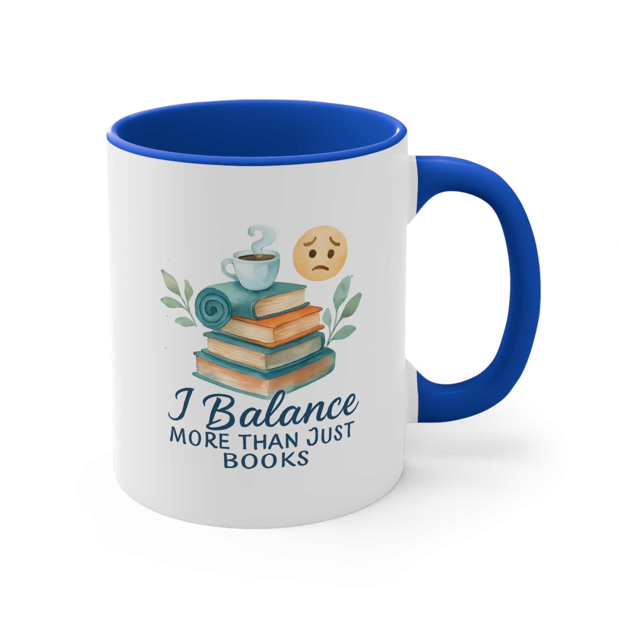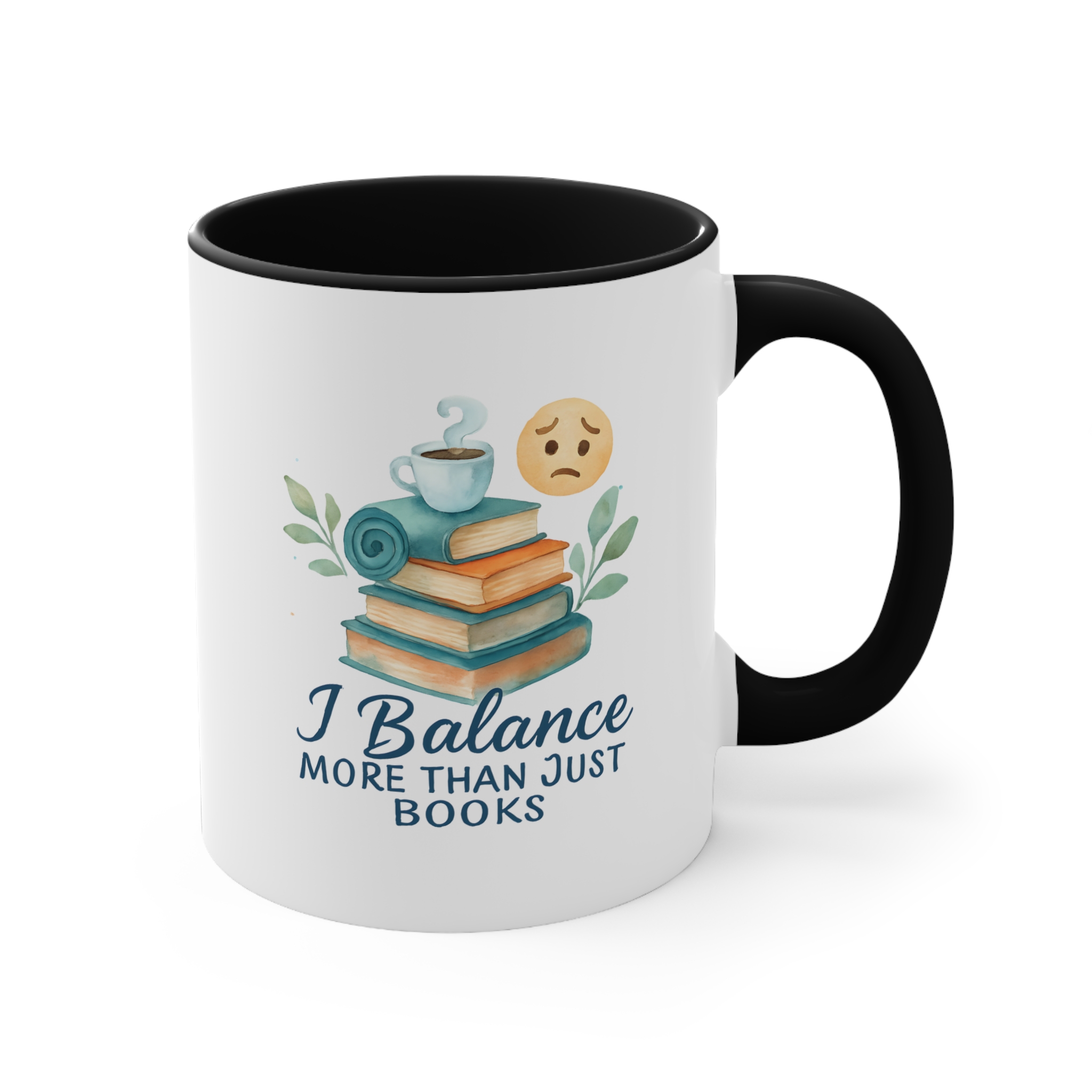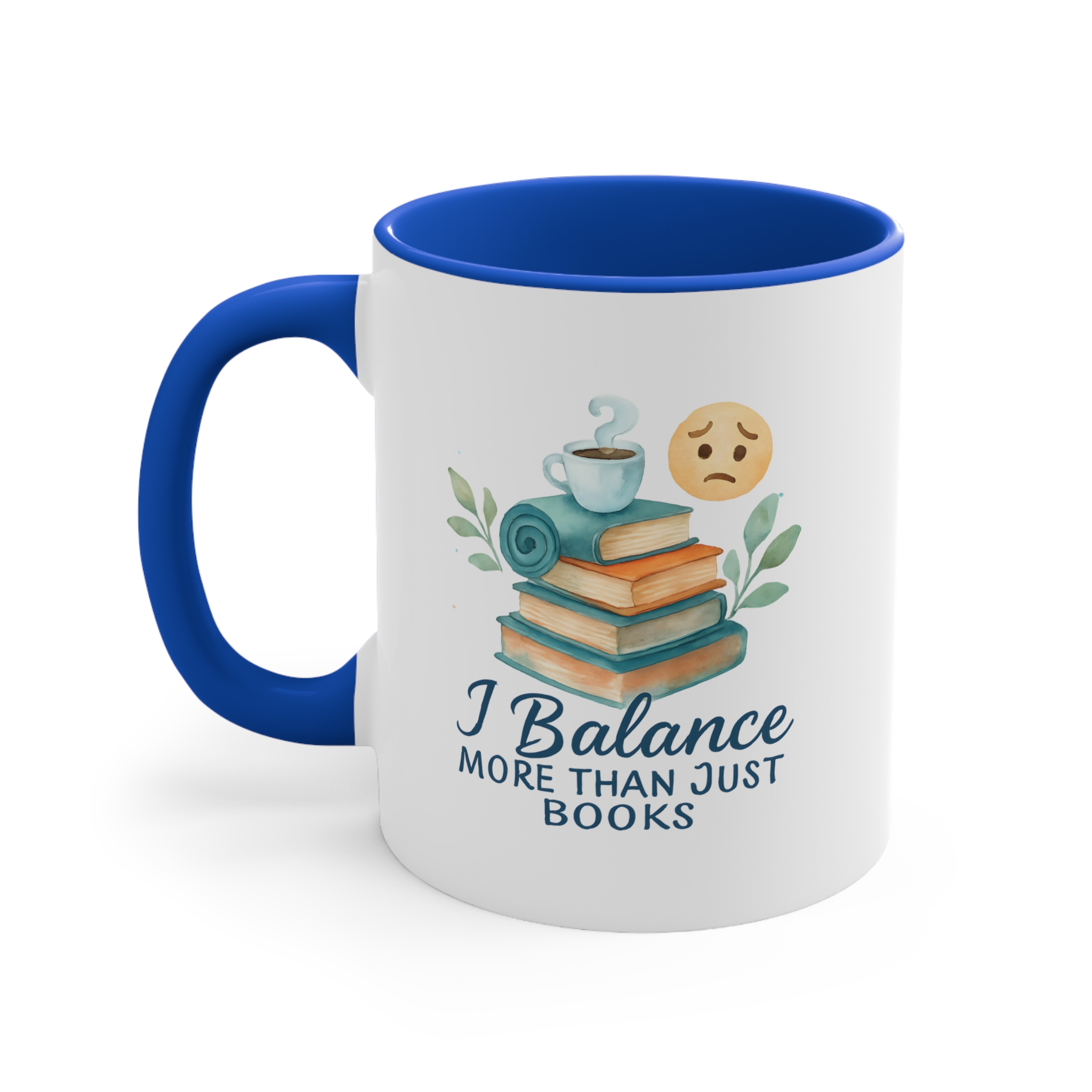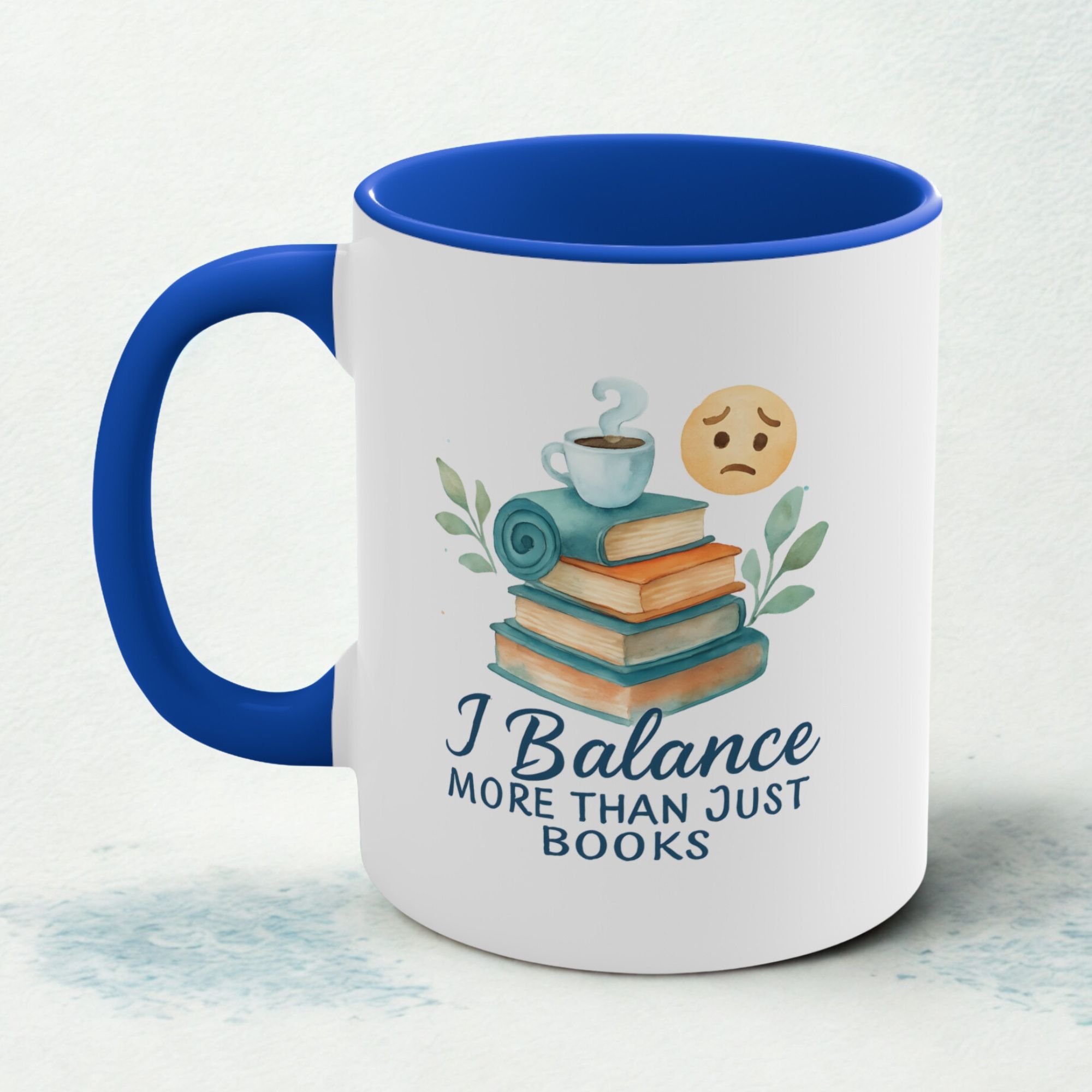 Watercolor-style “I Balance More Than Just Books” mug with books, coffee, and emotional balance icons. A calming gift for multitaskers.