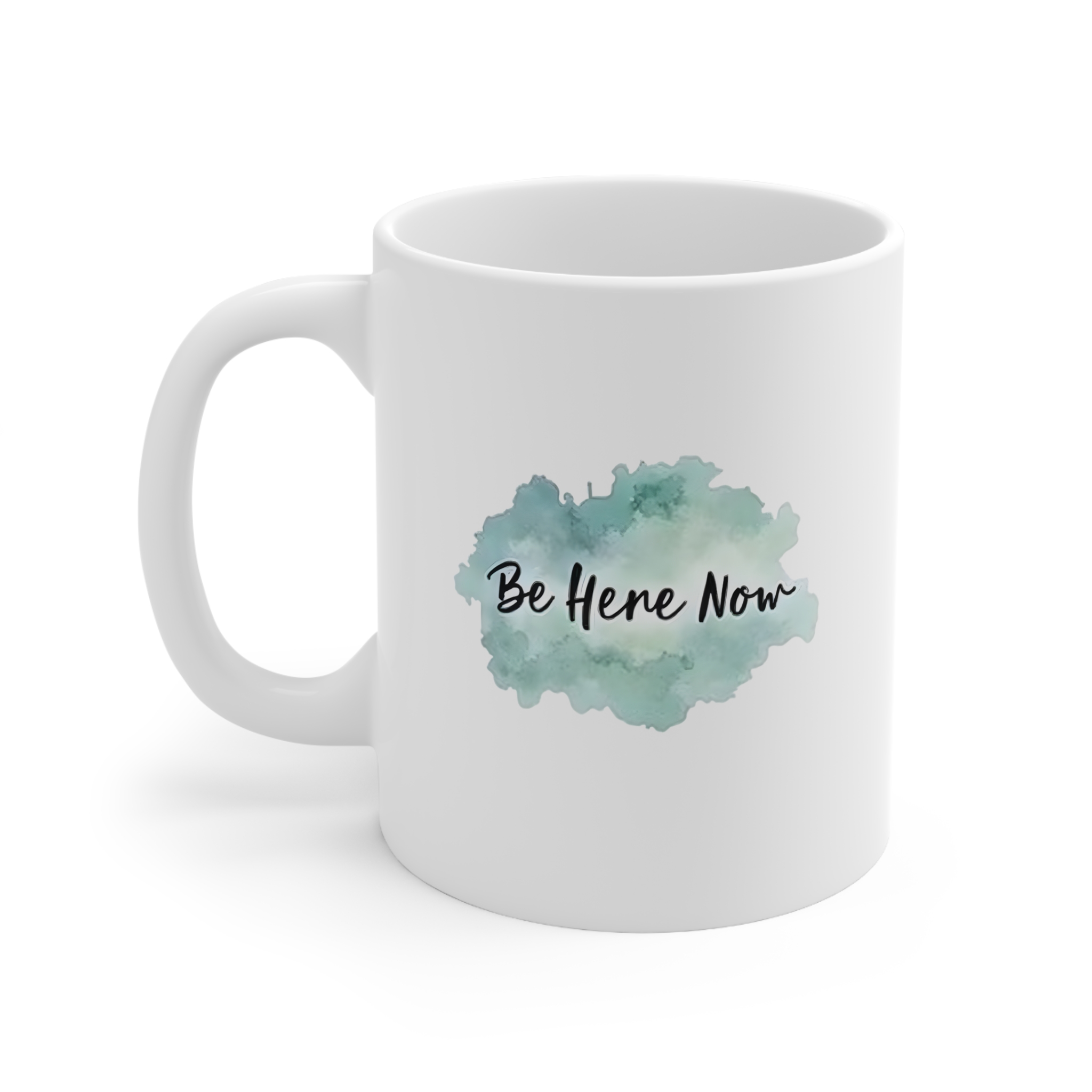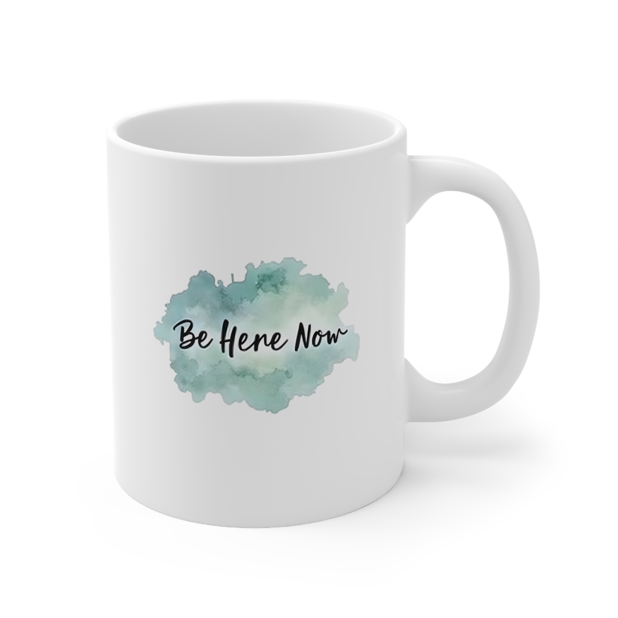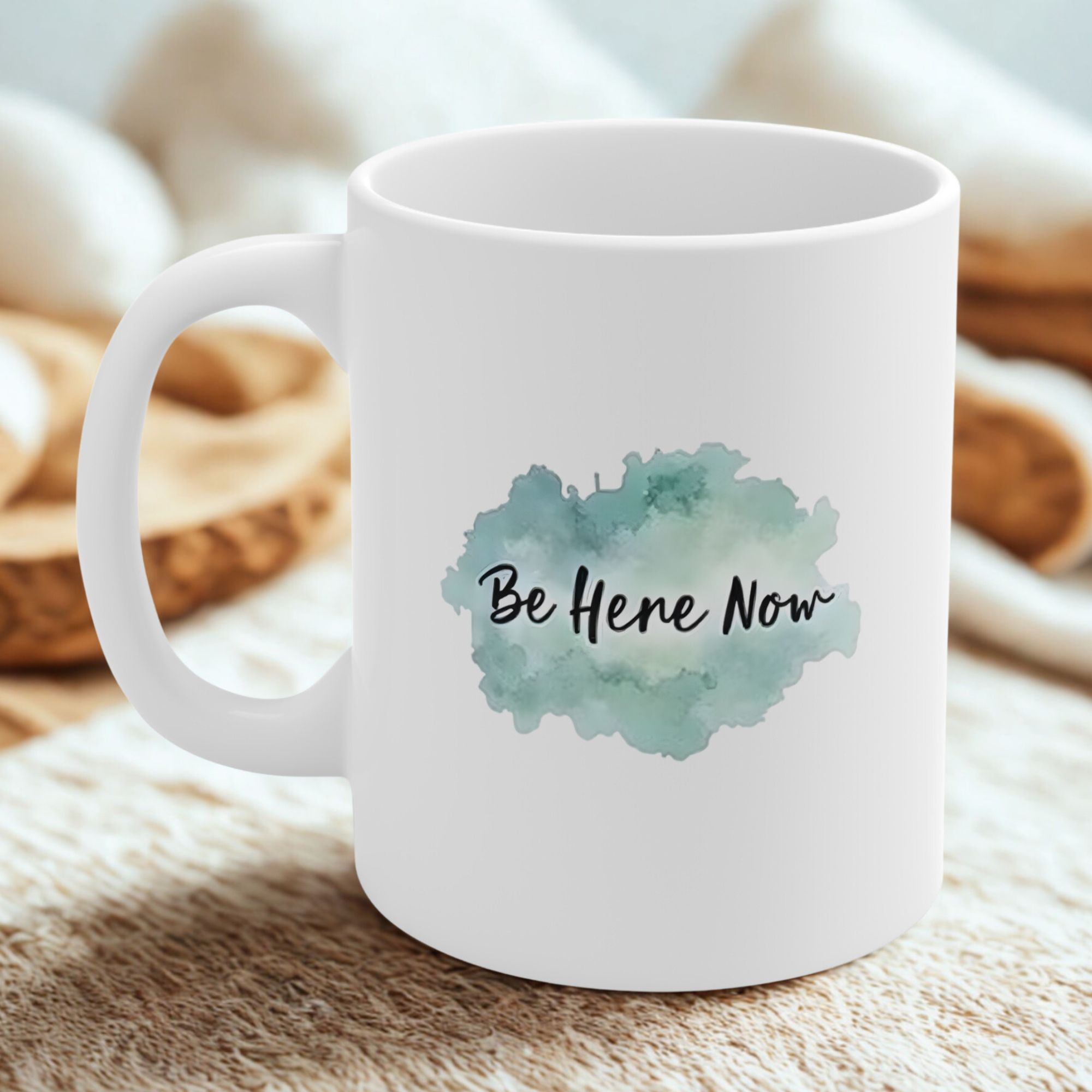 Mindfulness mug with “Be Here Now” script and calming watercolor brush strokes—perfect for peaceful, intentional moments.