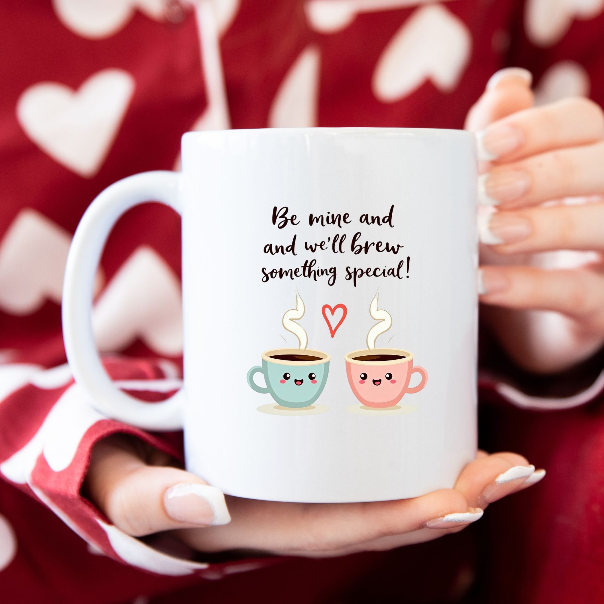 💞 Design: Two coffee cups (pink and light blue) with a heart in the middle, paired with the phrase “Be Mine and We’ll Brew Something Special”