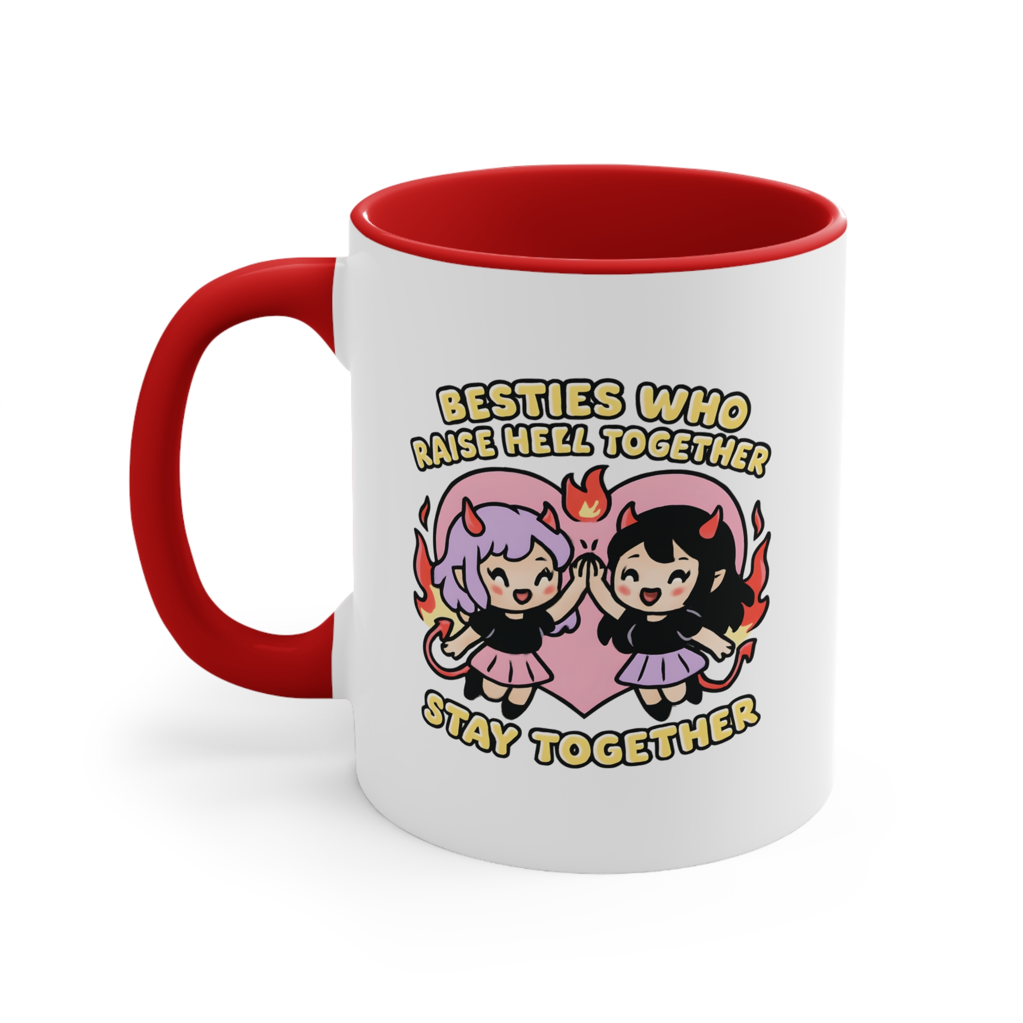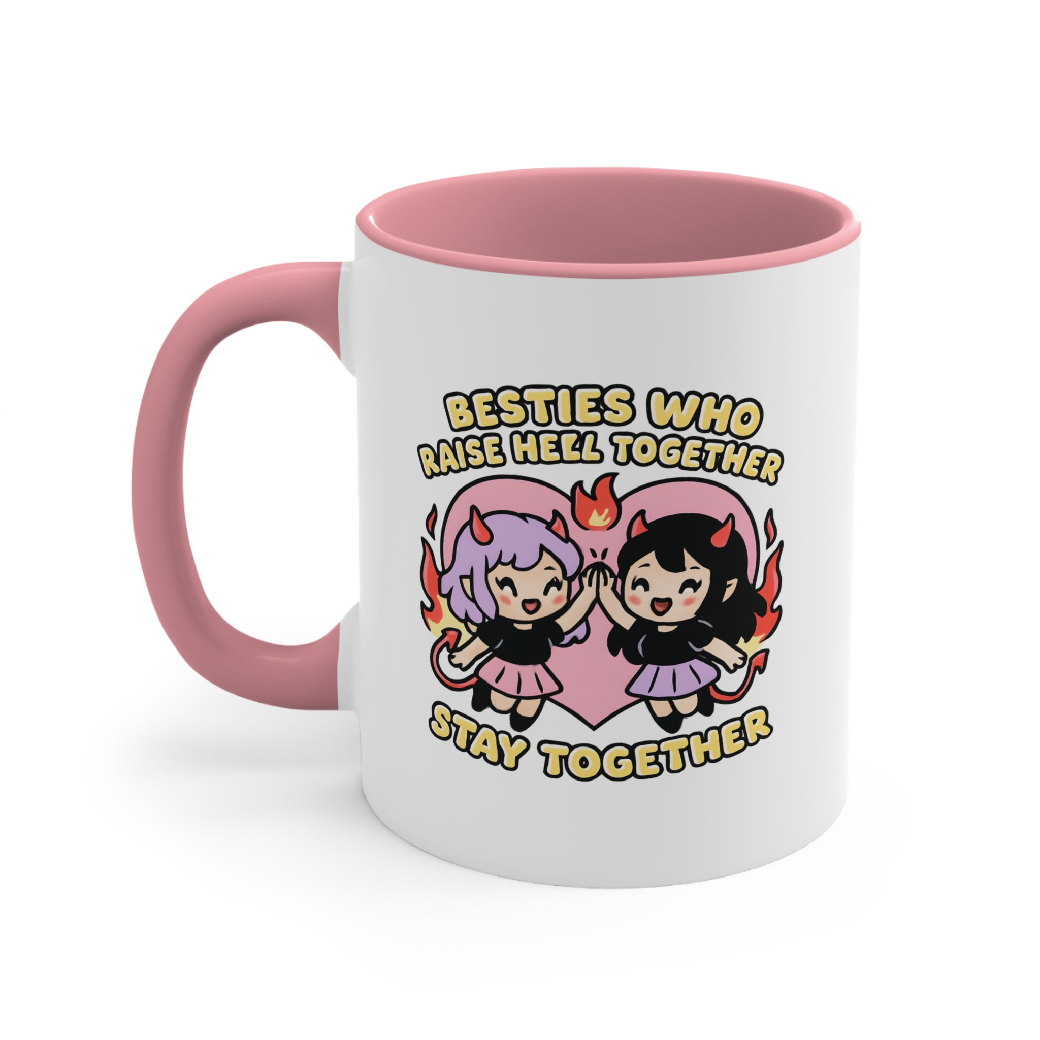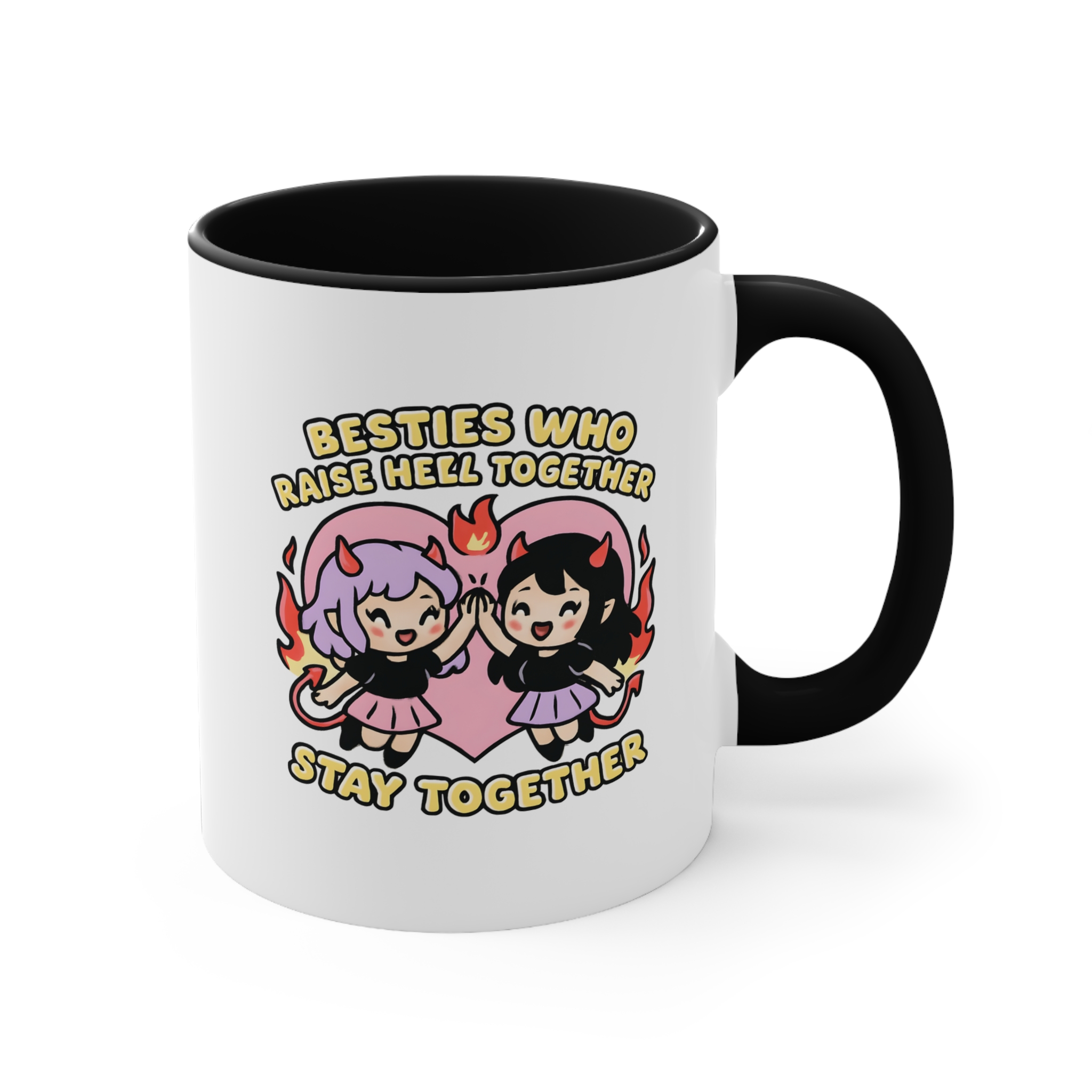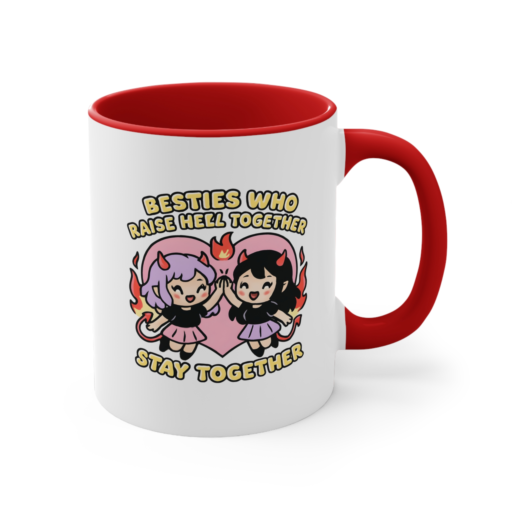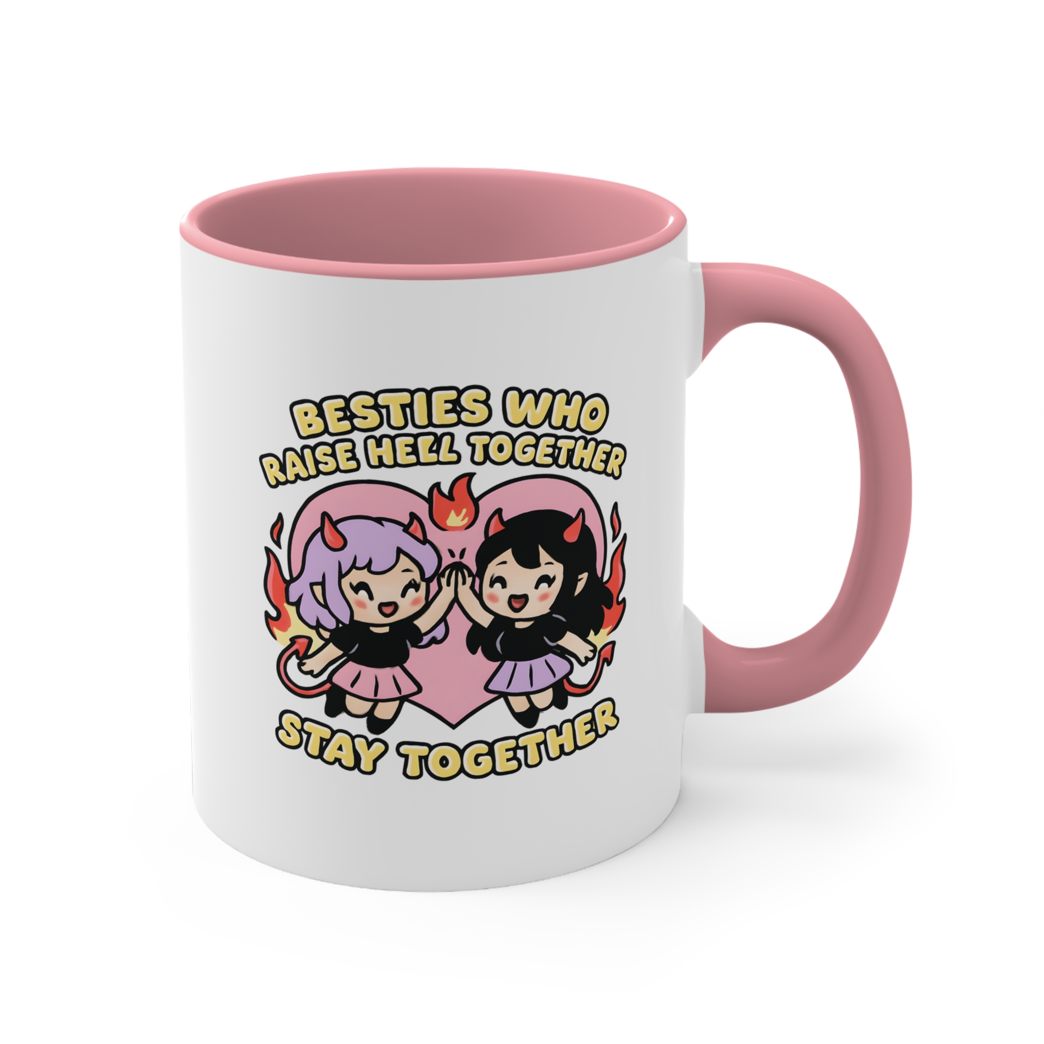 Cute, chaotic, and 100% ride-or-die. This bestie mug funny edition features two devilish girls high-fiving with fire and flair, proving that the strongest friendships are forged in flames (and a little mischief).