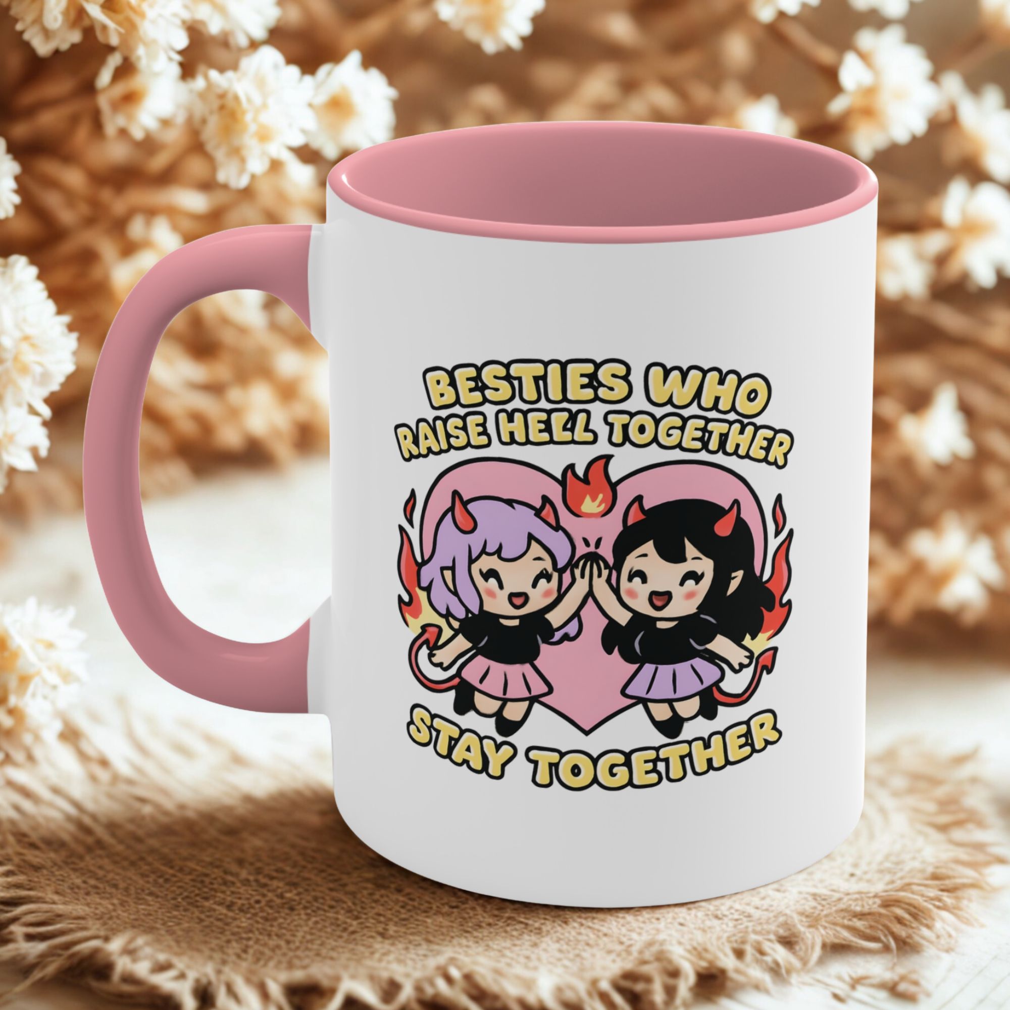 A cute and fiery bestie mug for chaotic duos who raise hell together and always have each other’s backs. Fun, bold, and built for best friend goals.
