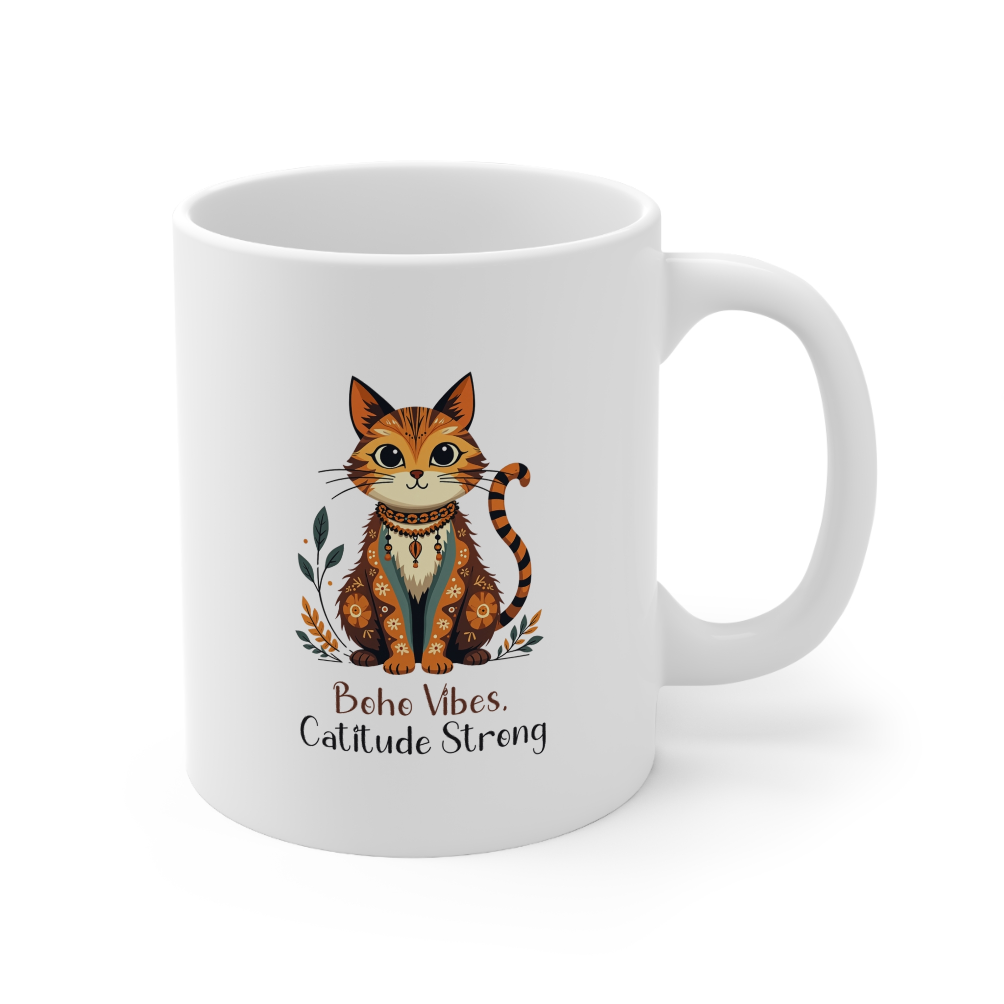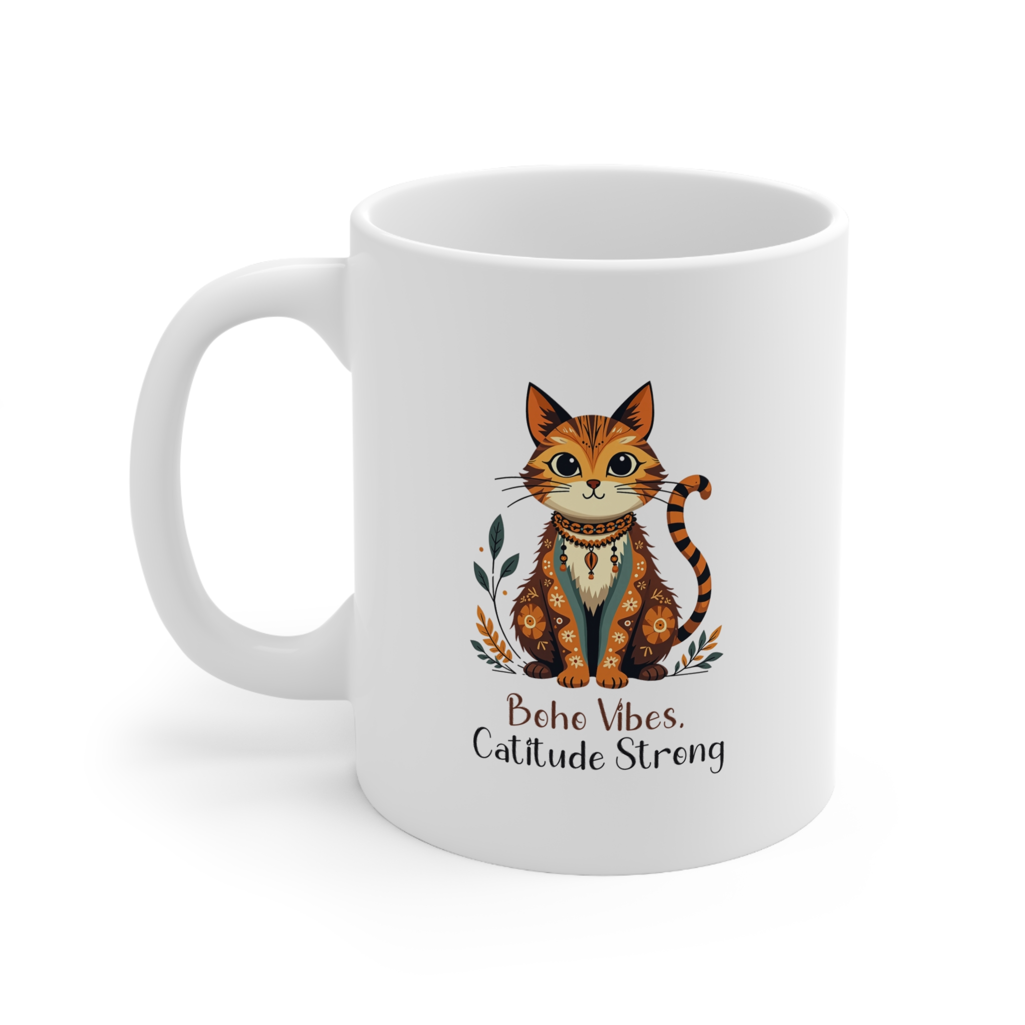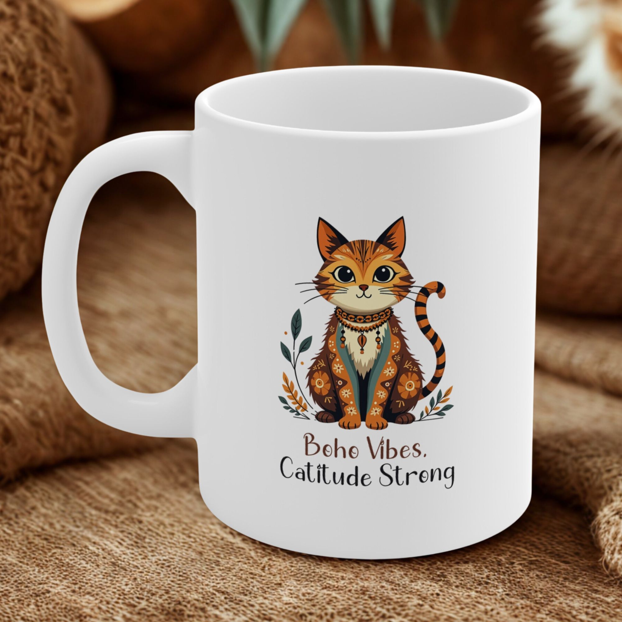 Bring the purr-fect mix of sass and soul to your sip routine with this charming boho cat mug. Featuring a beautifully illustrated feline in vibrant bohemian patterns and the quote “Boho Vibes. Catitude Strong,” this mug is a must-have for free spirits and proud cat lovers alike.