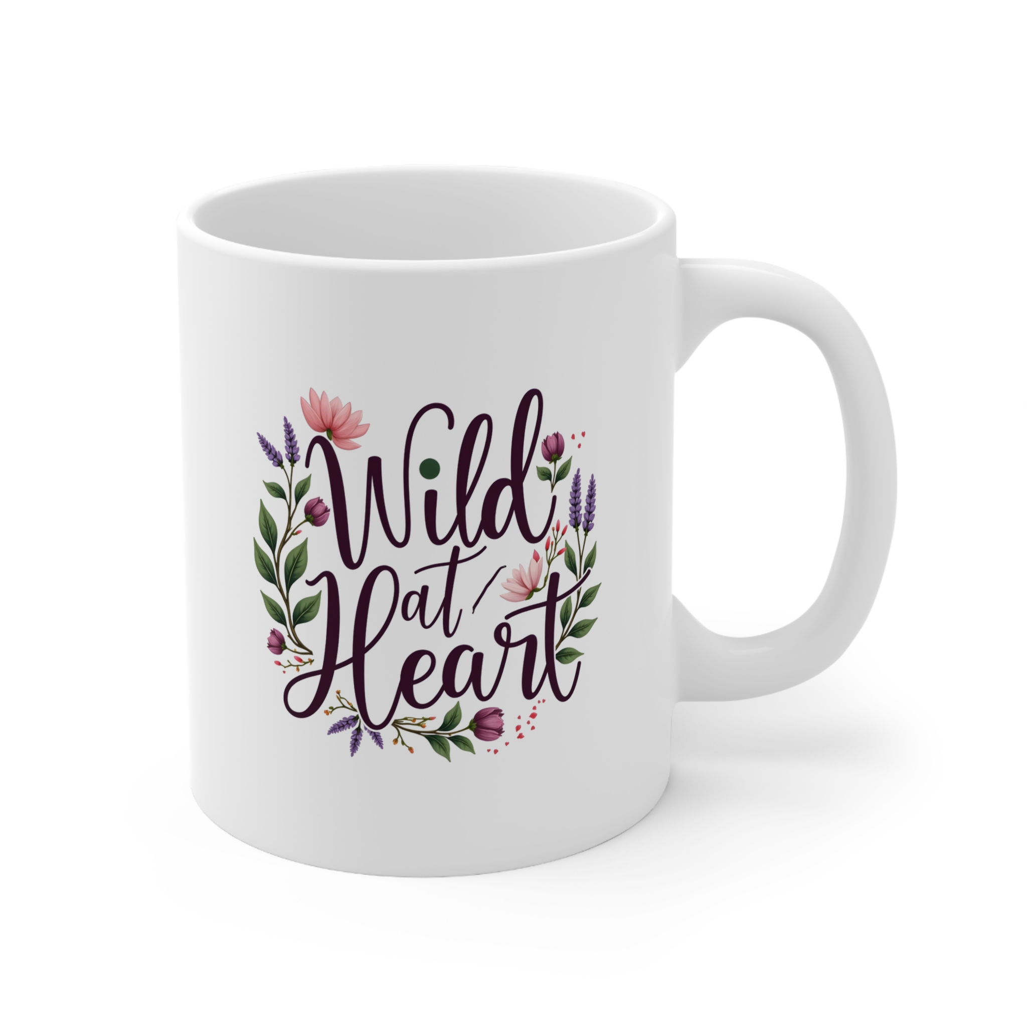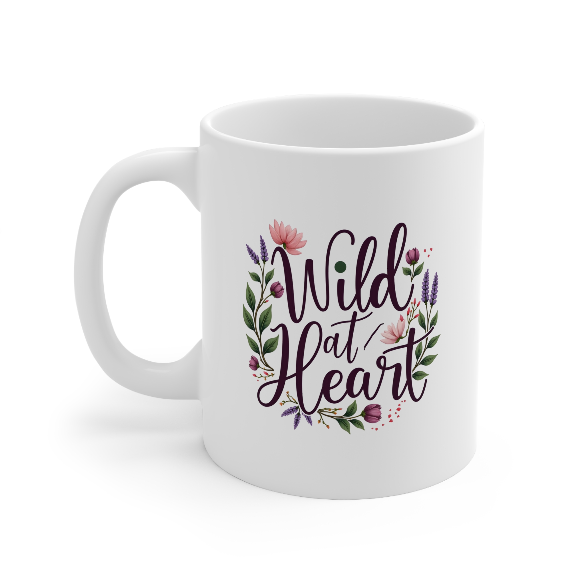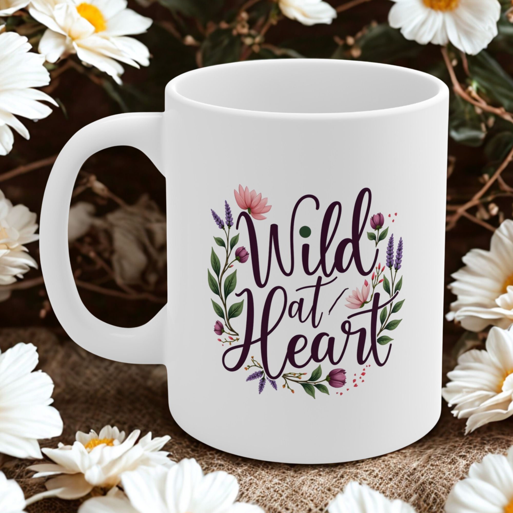 Celebrate your wild spirit with this Boho Floral Mug. Featuring a “Wild at Heart” quote and colorful botanical blooms, this 11oz mug adds charm to every sip.