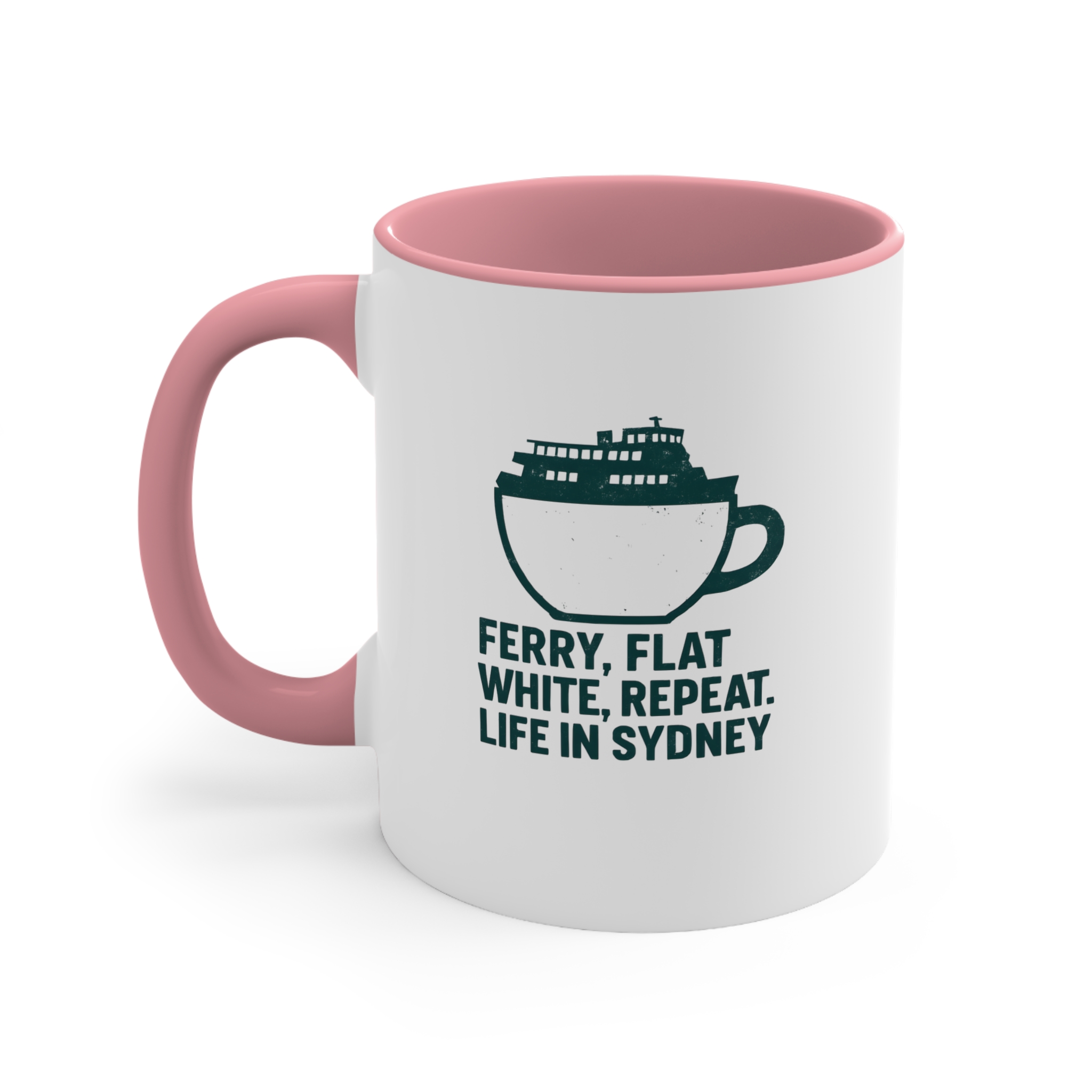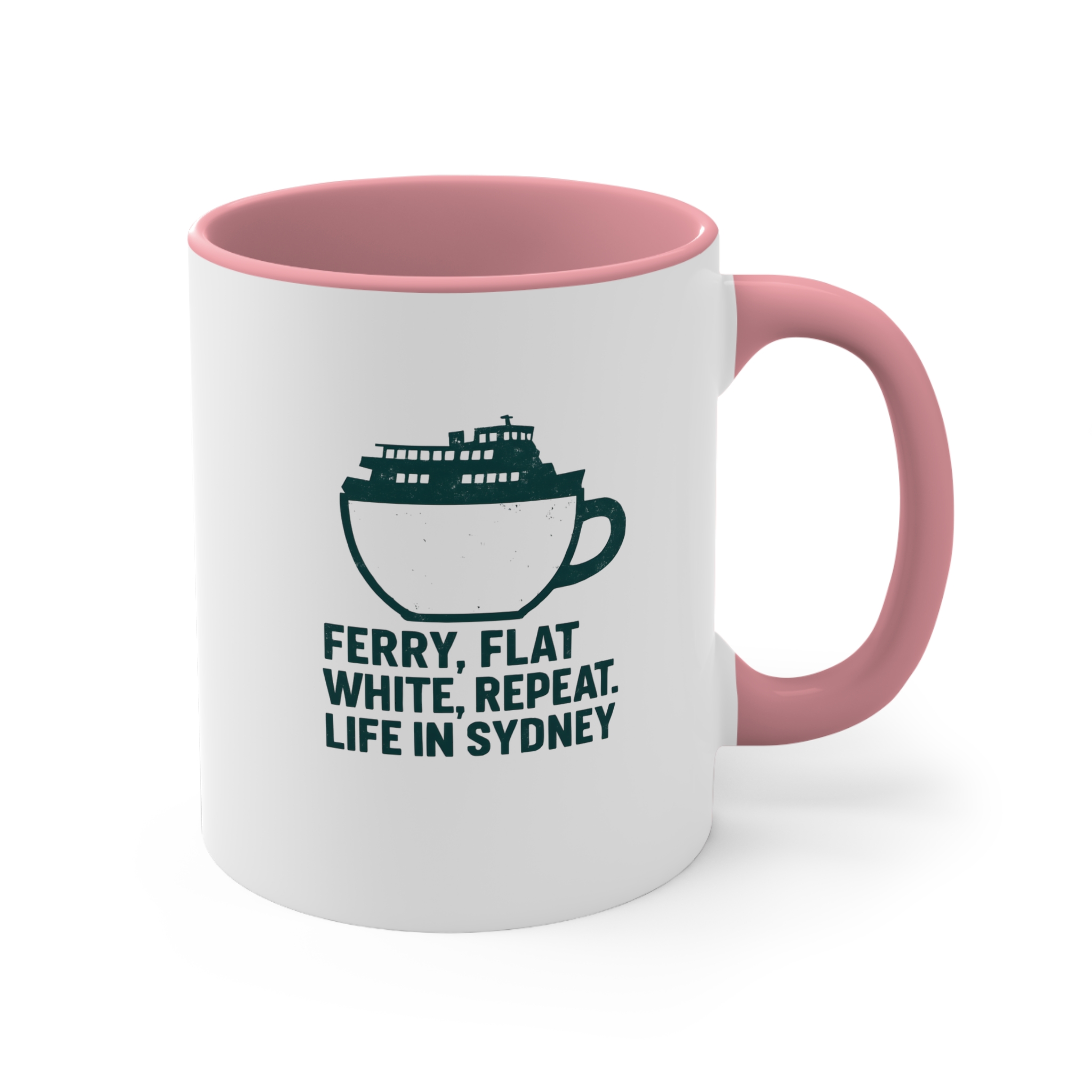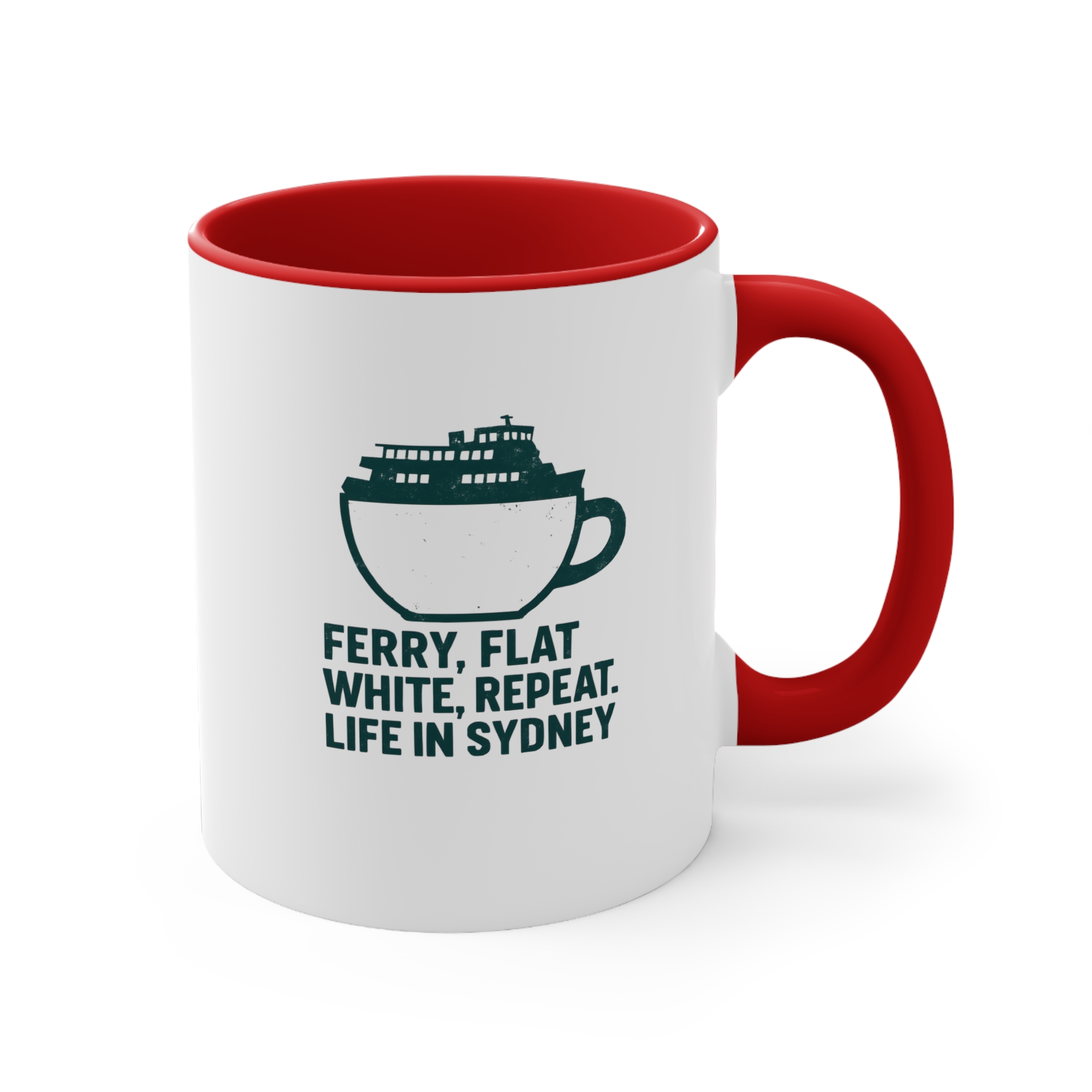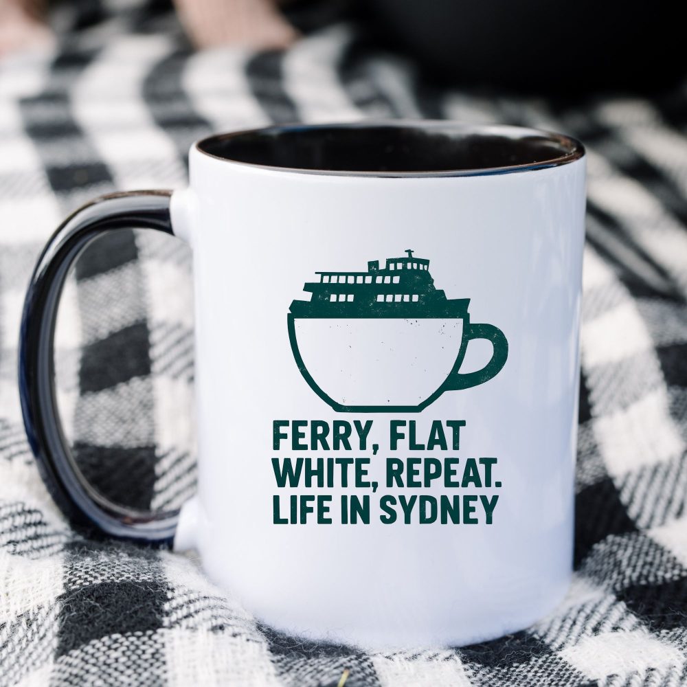 Make a bold statement with this uniquely designed Sydney coffee mug. The graphic illustration merges a ferry silhouette within a classic flat white coffee cup, paired with the iconic phrase: “Ferry, Flat White, Repeat. Life in Sydney.” Perfect for lovers of harbor life and strong brews, this modern mug captures the pulse of Sydney mornings. Crafted with a sleek black interior and handle, this 11oz ceramic mug brings your coastal routine to life with a stylish twist.