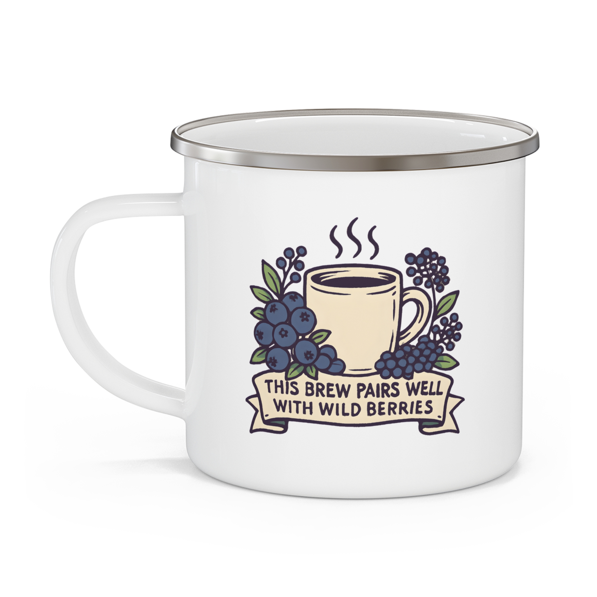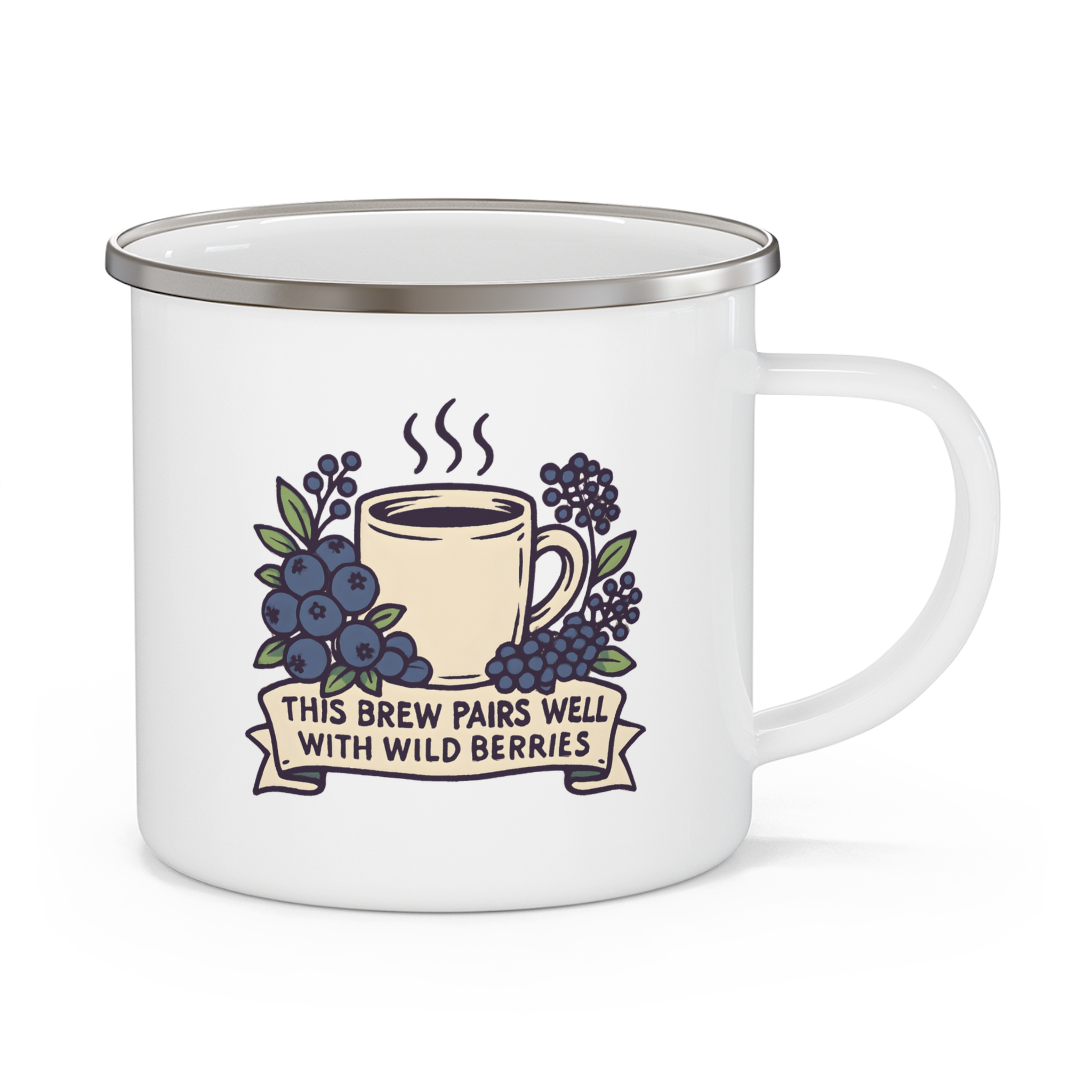 Bush coffee mug featuring the phrase “This Brew Pairs Well With Wild Berries” with illustrated berries and a steaming coffee cup. A charming enamel camping mug made for nature lovers, foragers, and outdoor coffee drinkers.