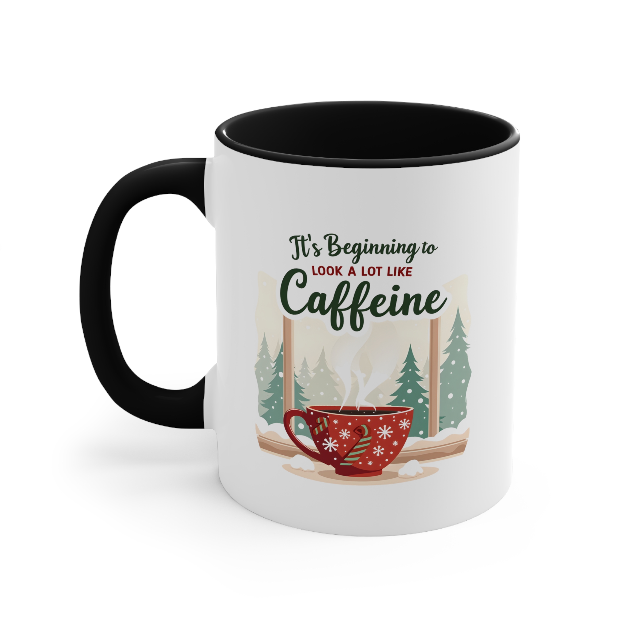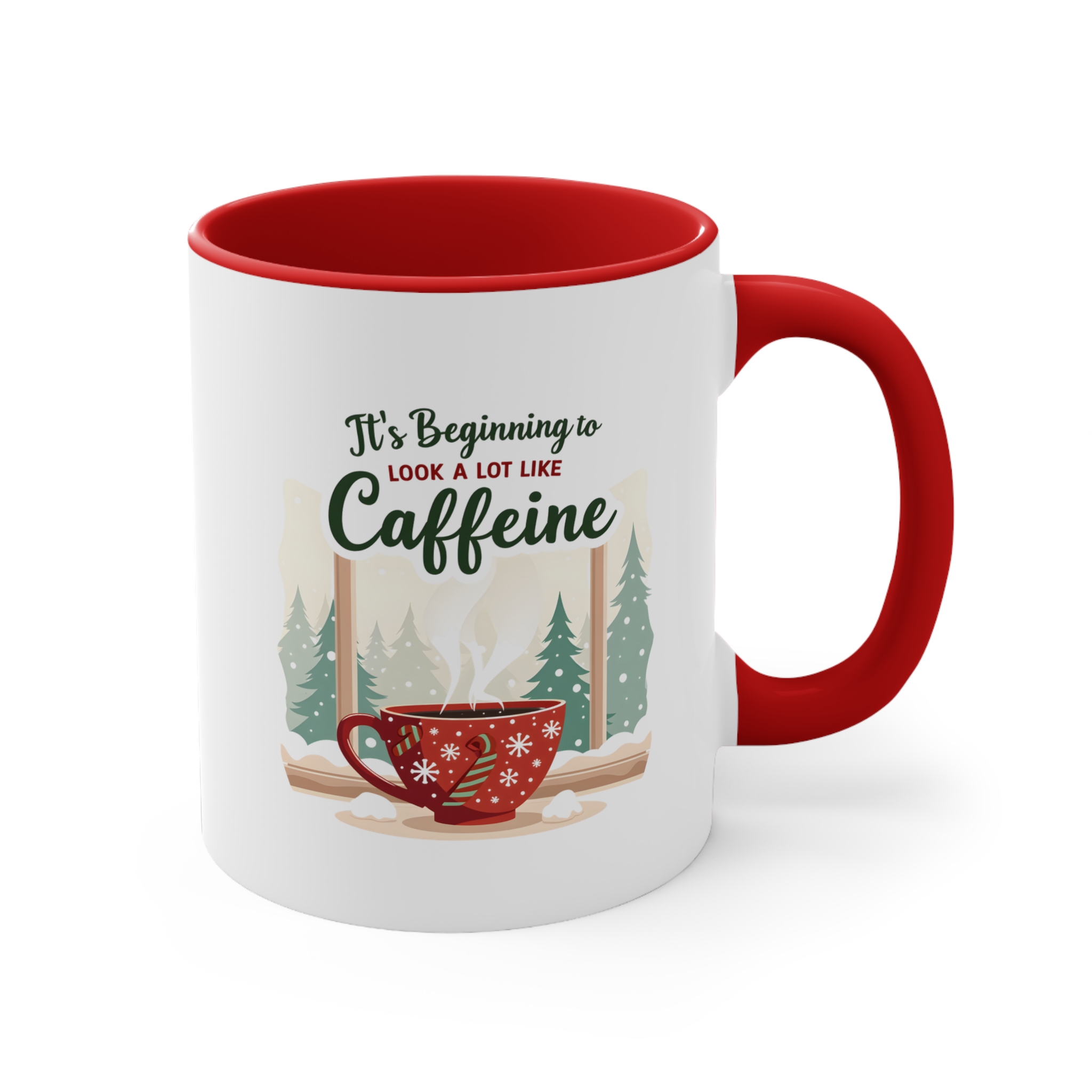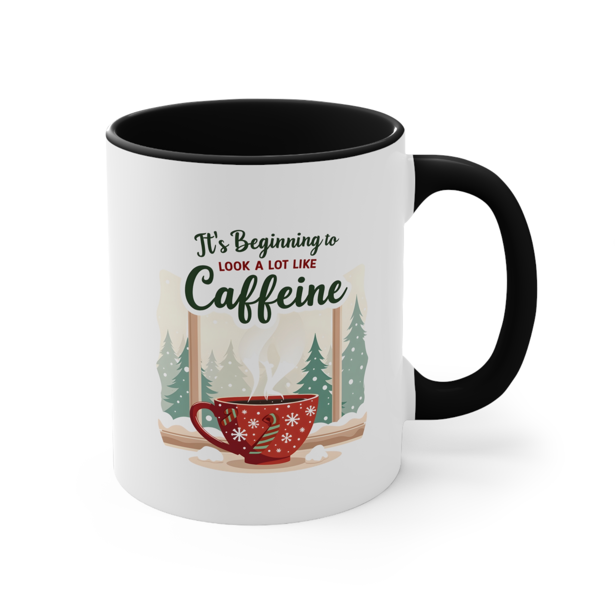 Skip the carols, bring the caffeine. This It’s Beginning to Look a Lot Like Caffeine mug blends festive charm with serious coffee vibes. Featuring a red snowflake cup, candy cane handle, and a snowy pine forest backdrop, it’s a holiday scene that every caffeine lover can relate to.