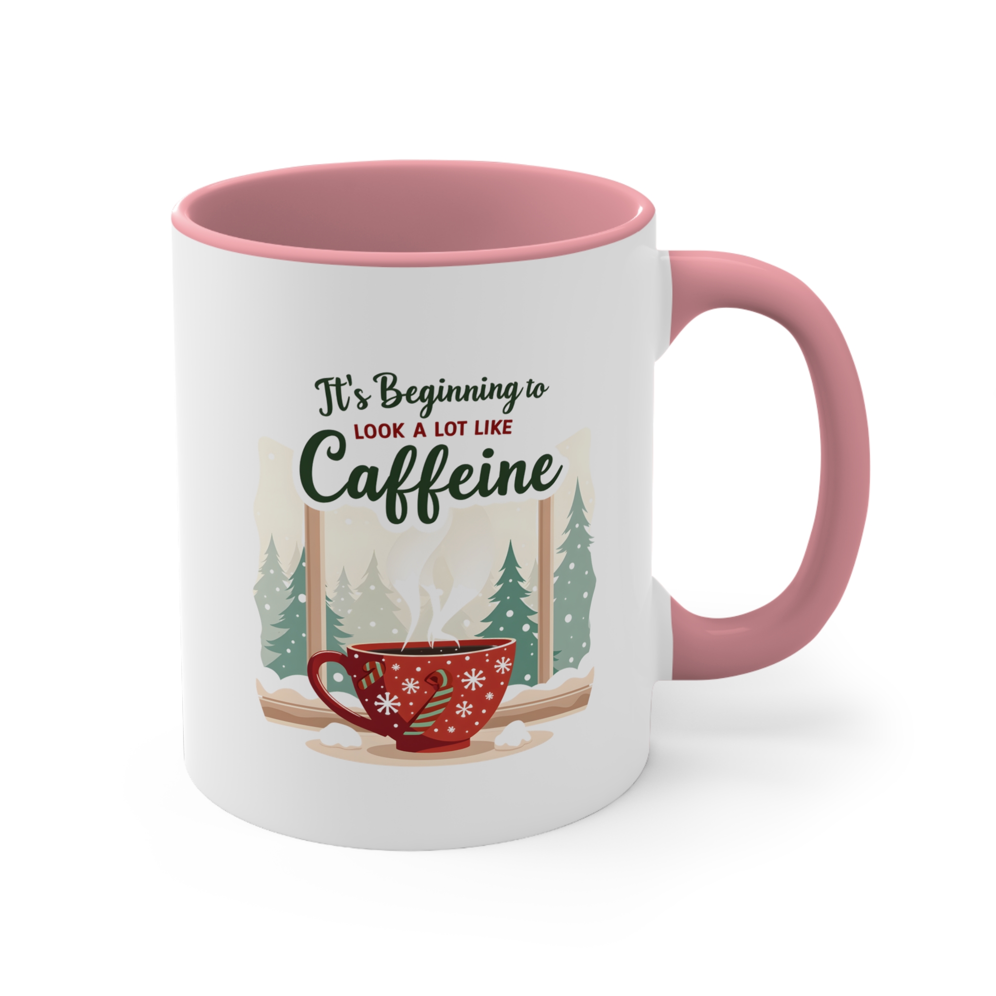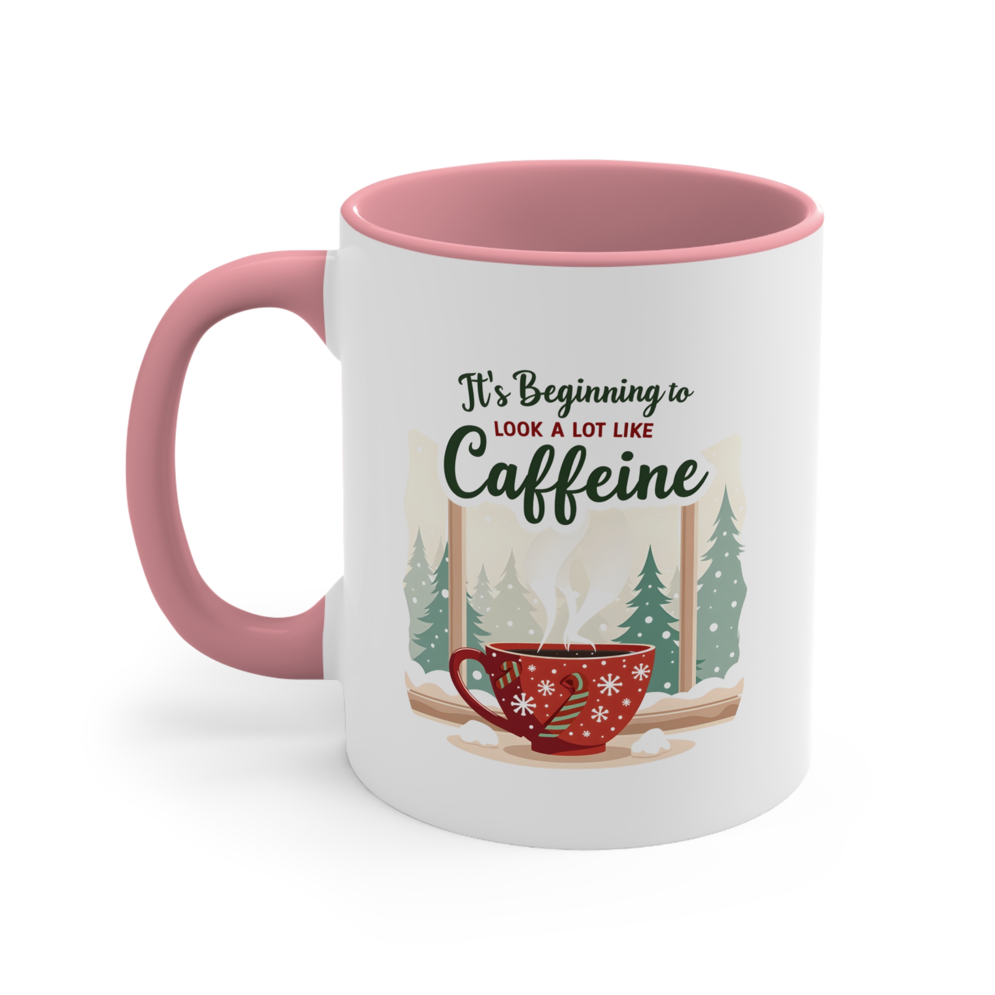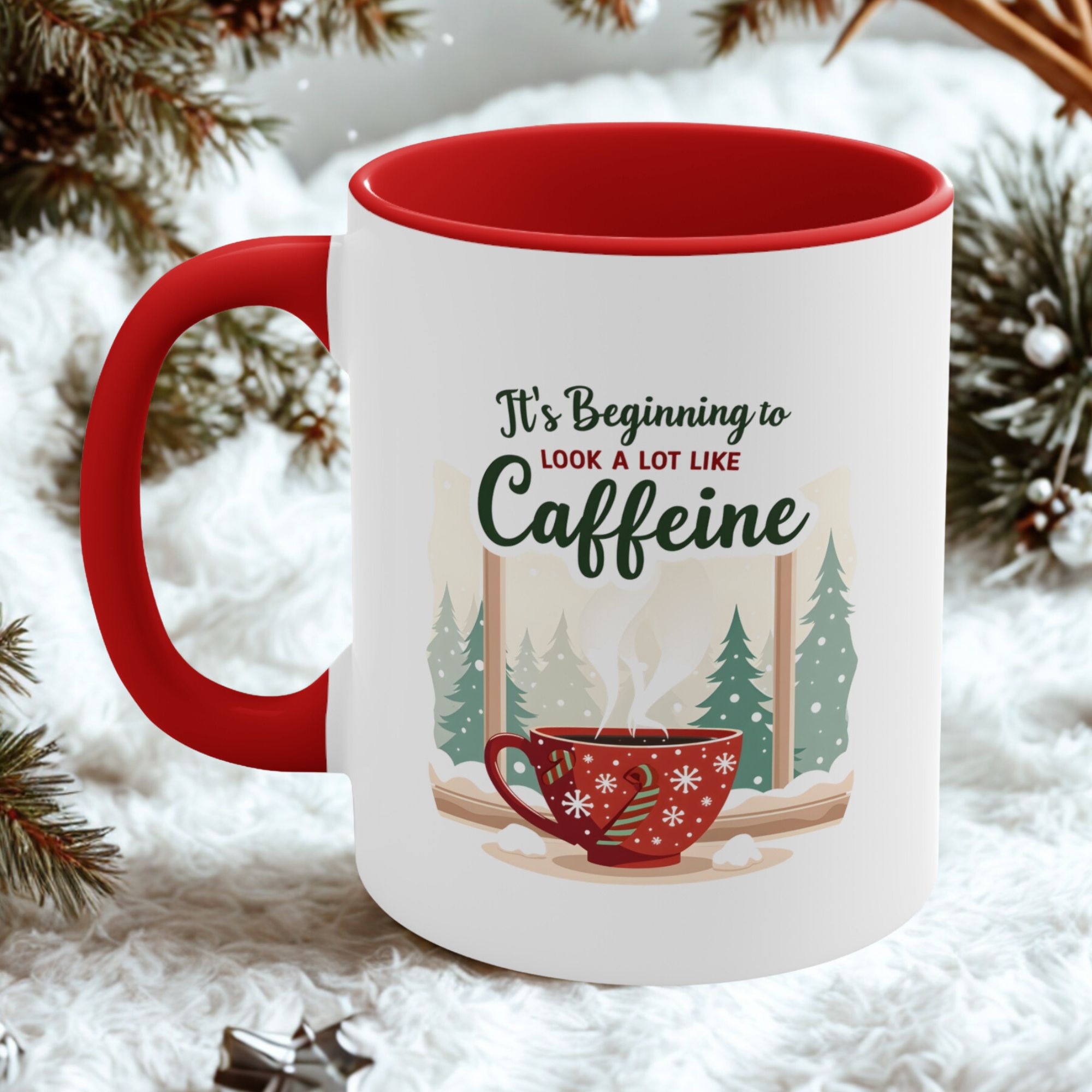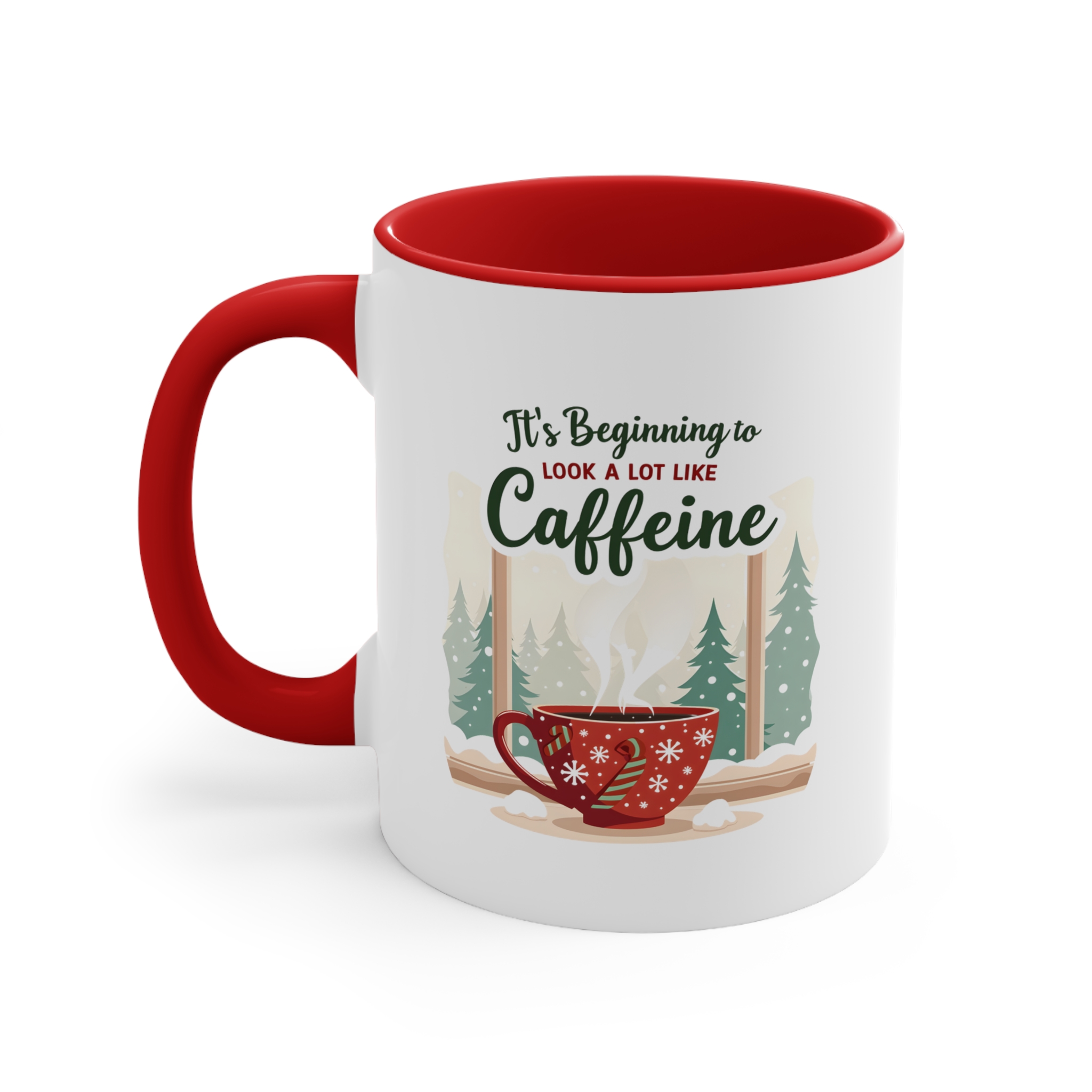Skip the carols, bring the caffeine. This It’s Beginning to Look a Lot Like Caffeine mug blends festive charm with serious coffee vibes. Featuring a red snowflake cup, candy cane handle, and a snowy pine forest backdrop, it’s a holiday scene that every caffeine lover can relate to.