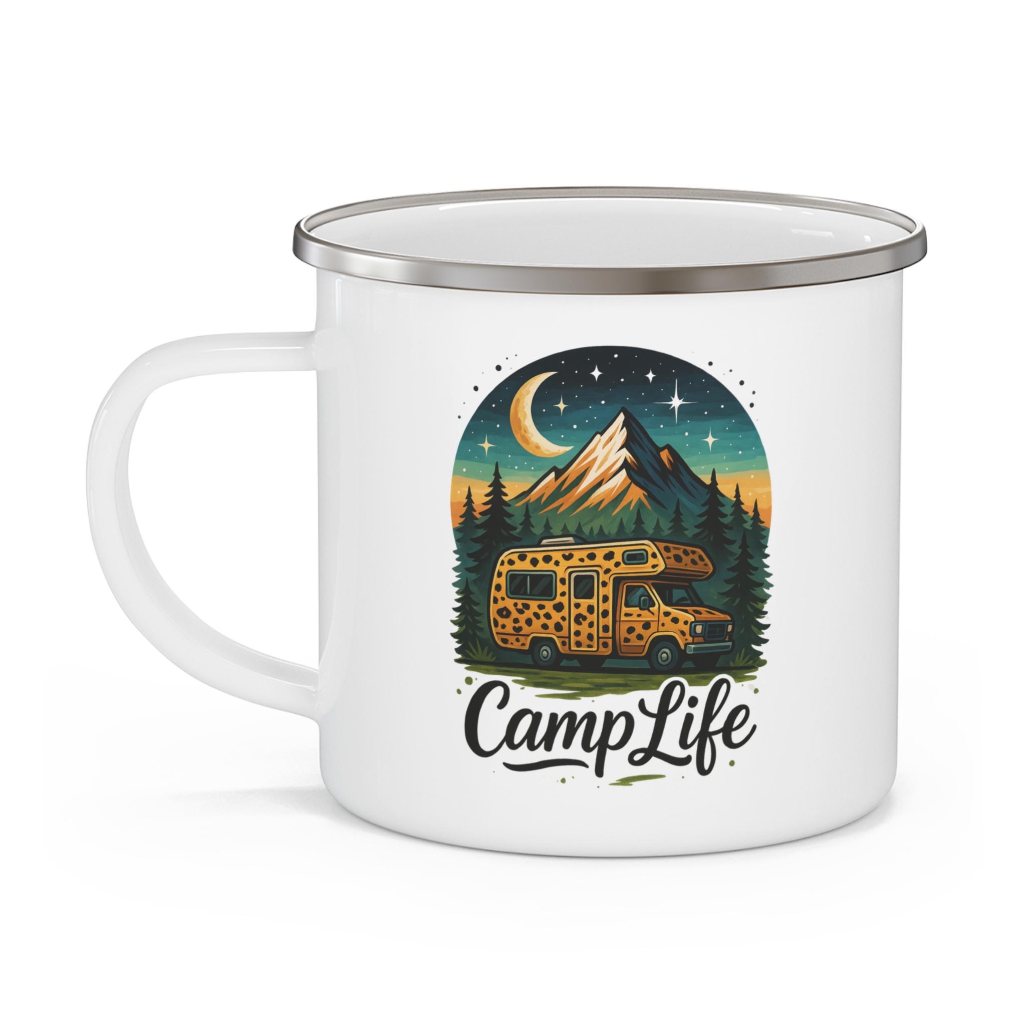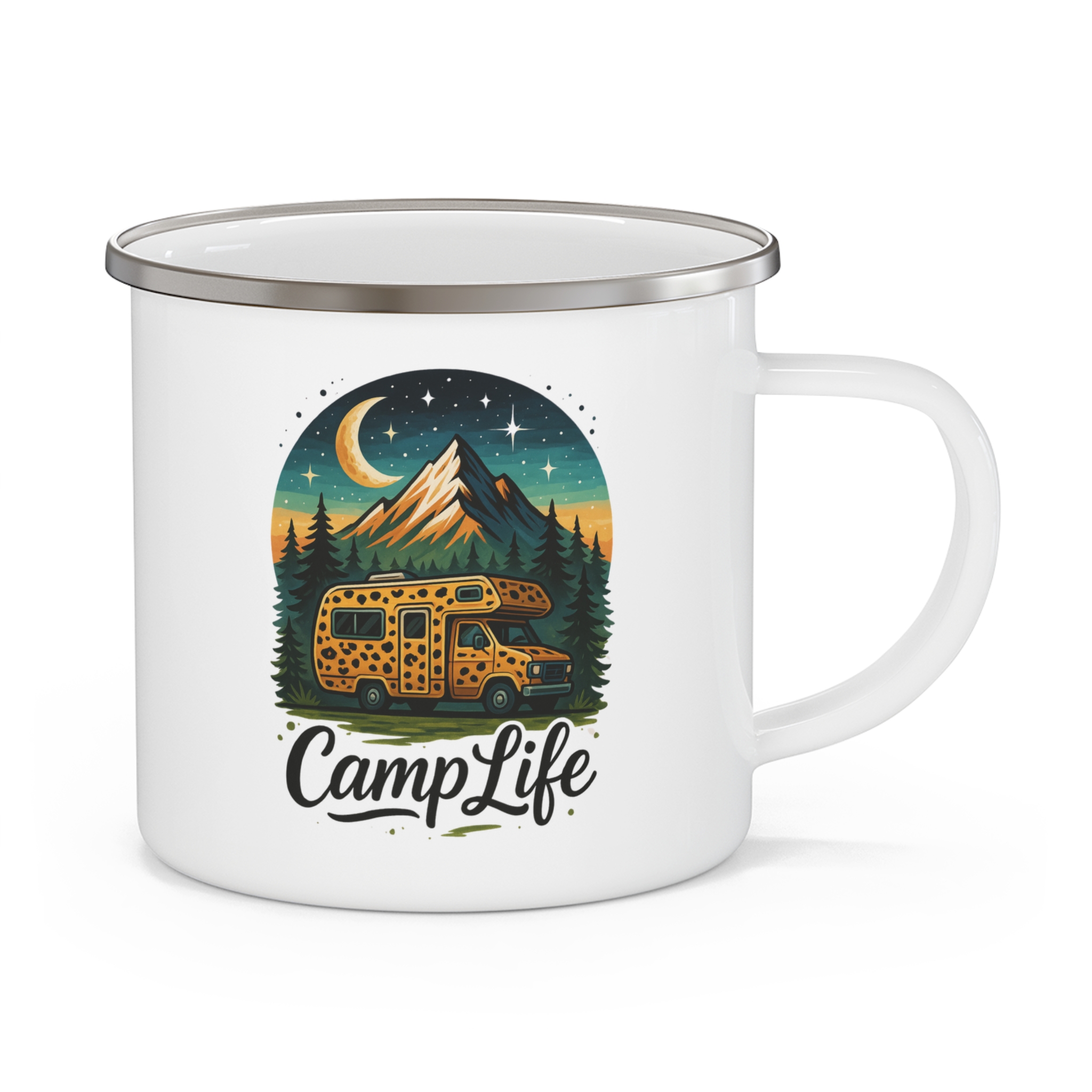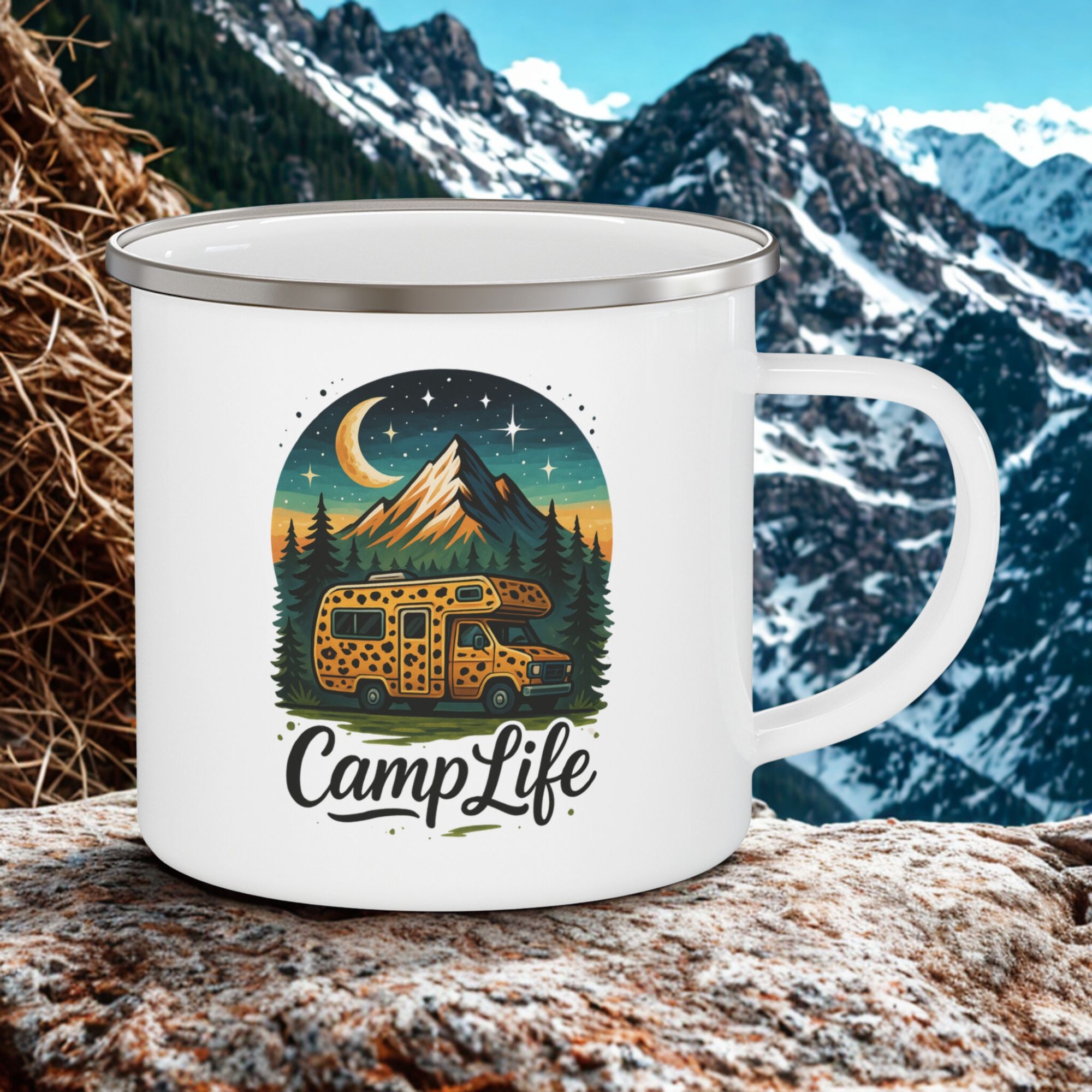 Camp life enamel mug — a campervan-inspired enamel mug for outdoor lovers and van life adventures. Perfect for campsite coffee. 12oz enamel mug.