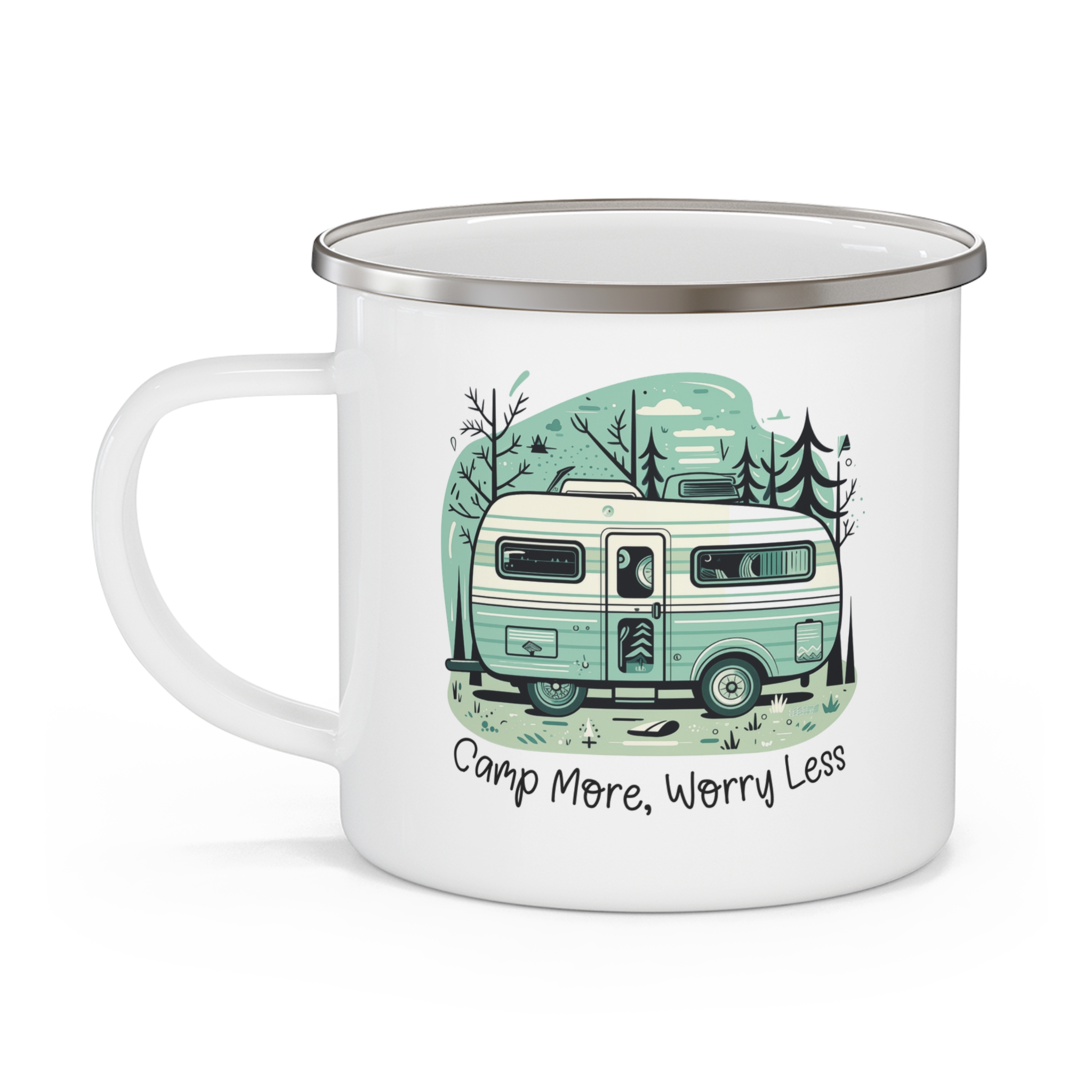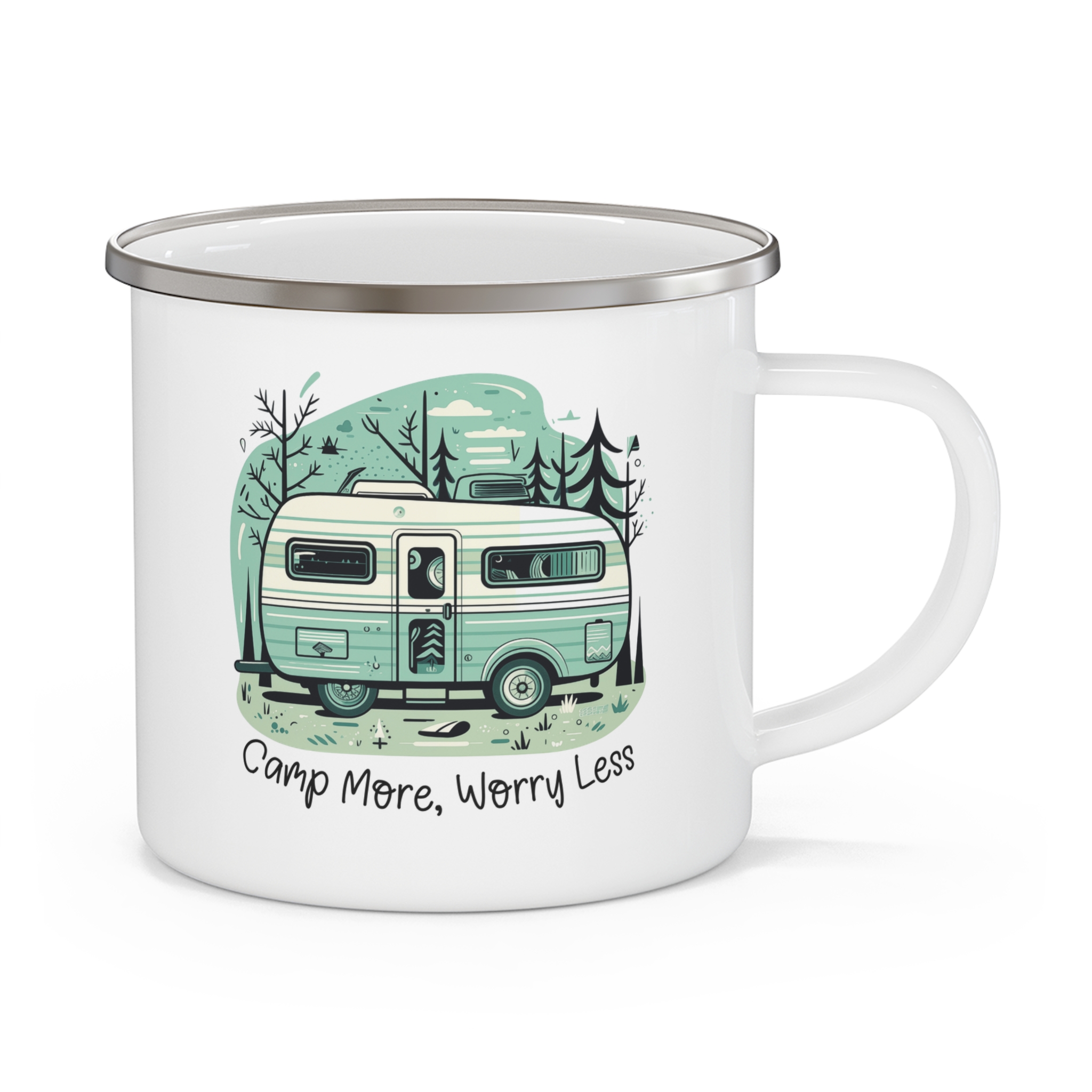 Camp more worry less mug — a relaxed caravan-inspired design for campers and outdoor lovers. Perfect for camping trips and slow mornings. 12oz enamel mug made for outdoor coffee.
