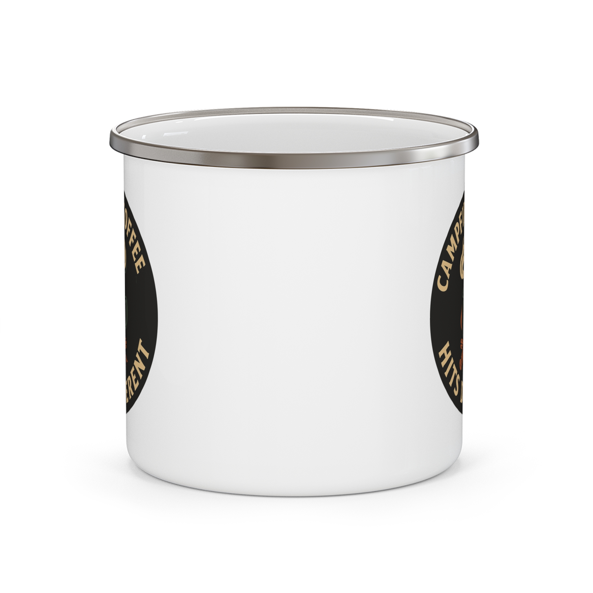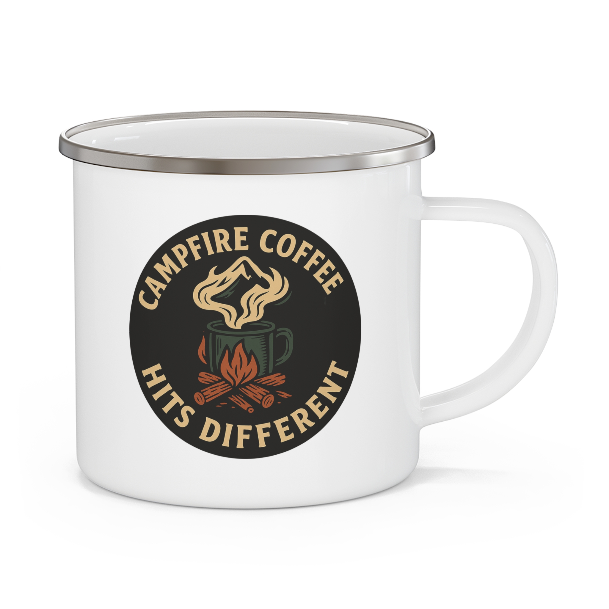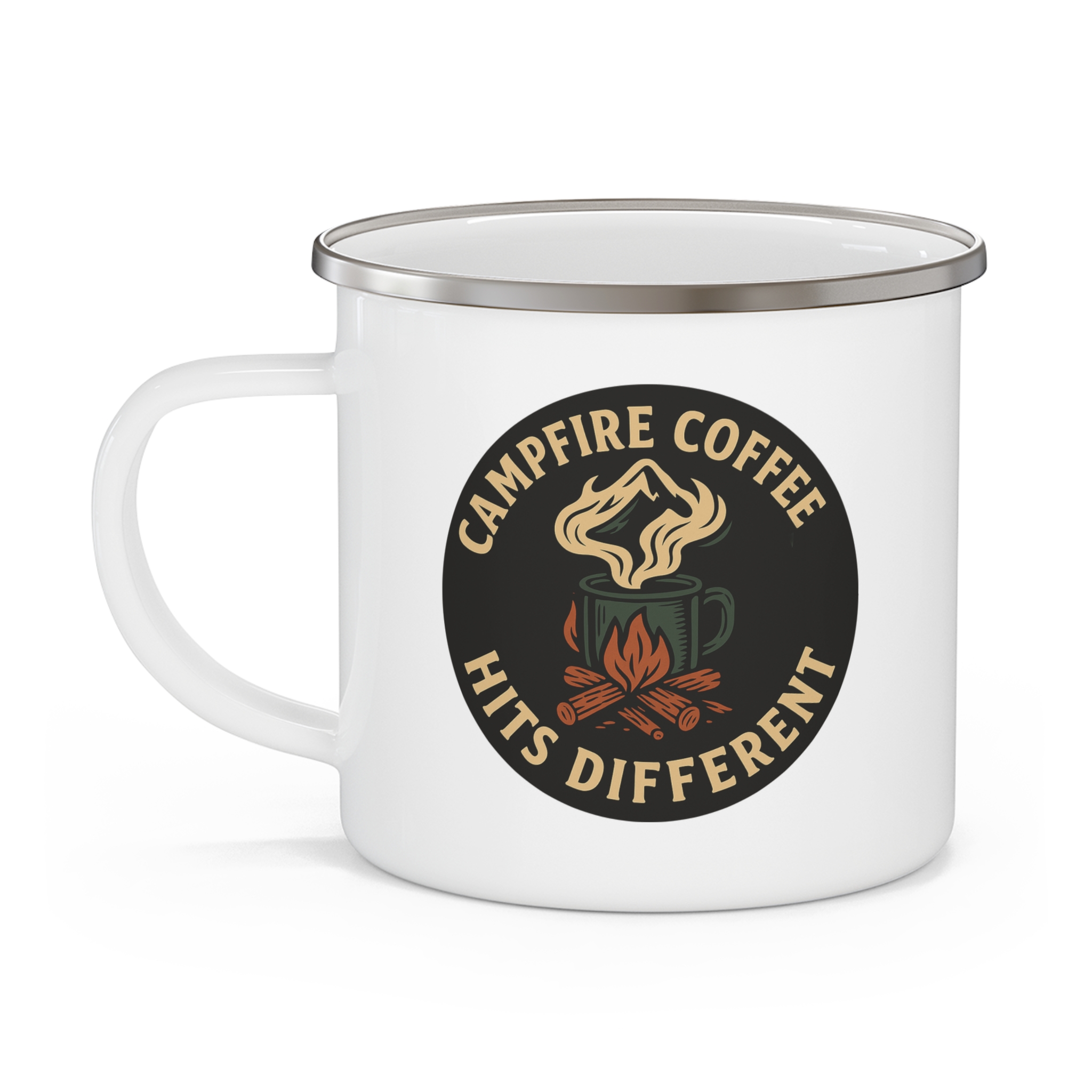 Campfire coffee mug enamel — a bold camping-inspired design featuring a steaming coffee cup over a campfire with the phrase “Campfire Coffee Hits Different.” Perfect for camping mornings, outdoor adventures, and a fun gift for coffee-loving campers.