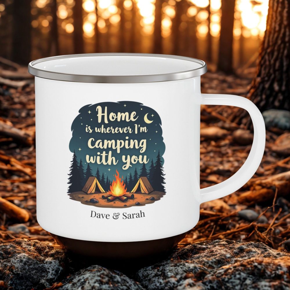 Camping with you mug — a romantic camping-themed design featuring a cosy campfire, tents under the night sky, and the heartfelt quote “Home is wherever I’m camping with you.” Custom names are printed below the design, making it a meaningful personalised gift for couples and camping partners.