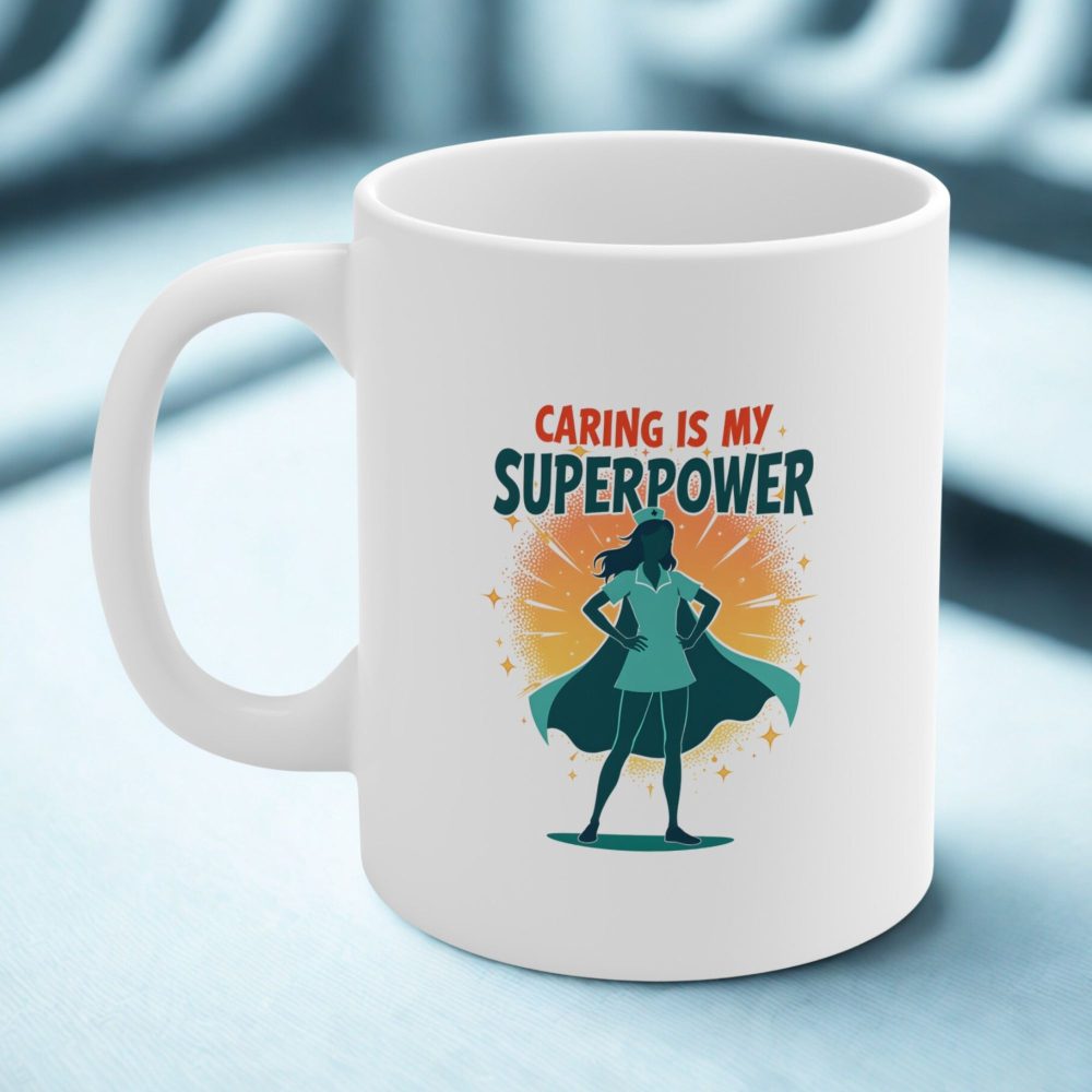 Celebrate everyday heroes with this caring superhero mug—perfect for nurses, mums, and anyone who leads with heart.