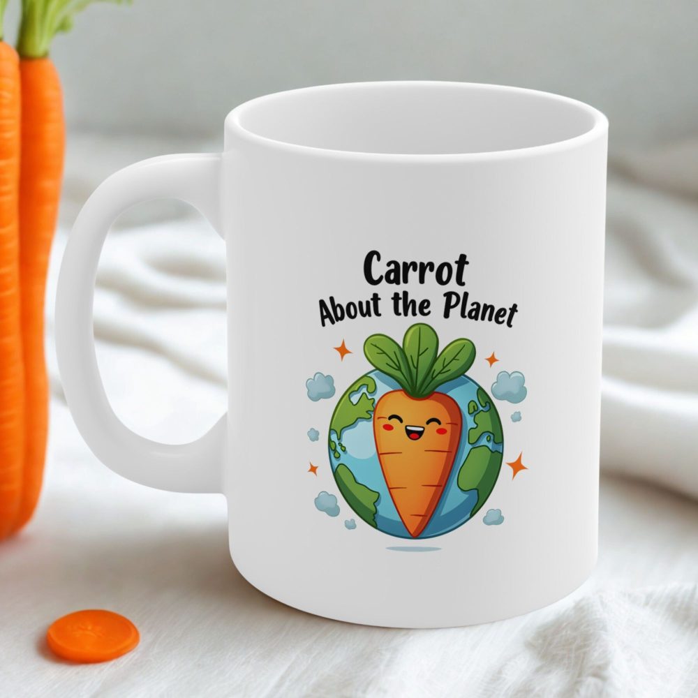 Funny vegan coffee mug with Earth and carrot design—“Carrot About the Planet” pun perfect for eco-friendly sipping.