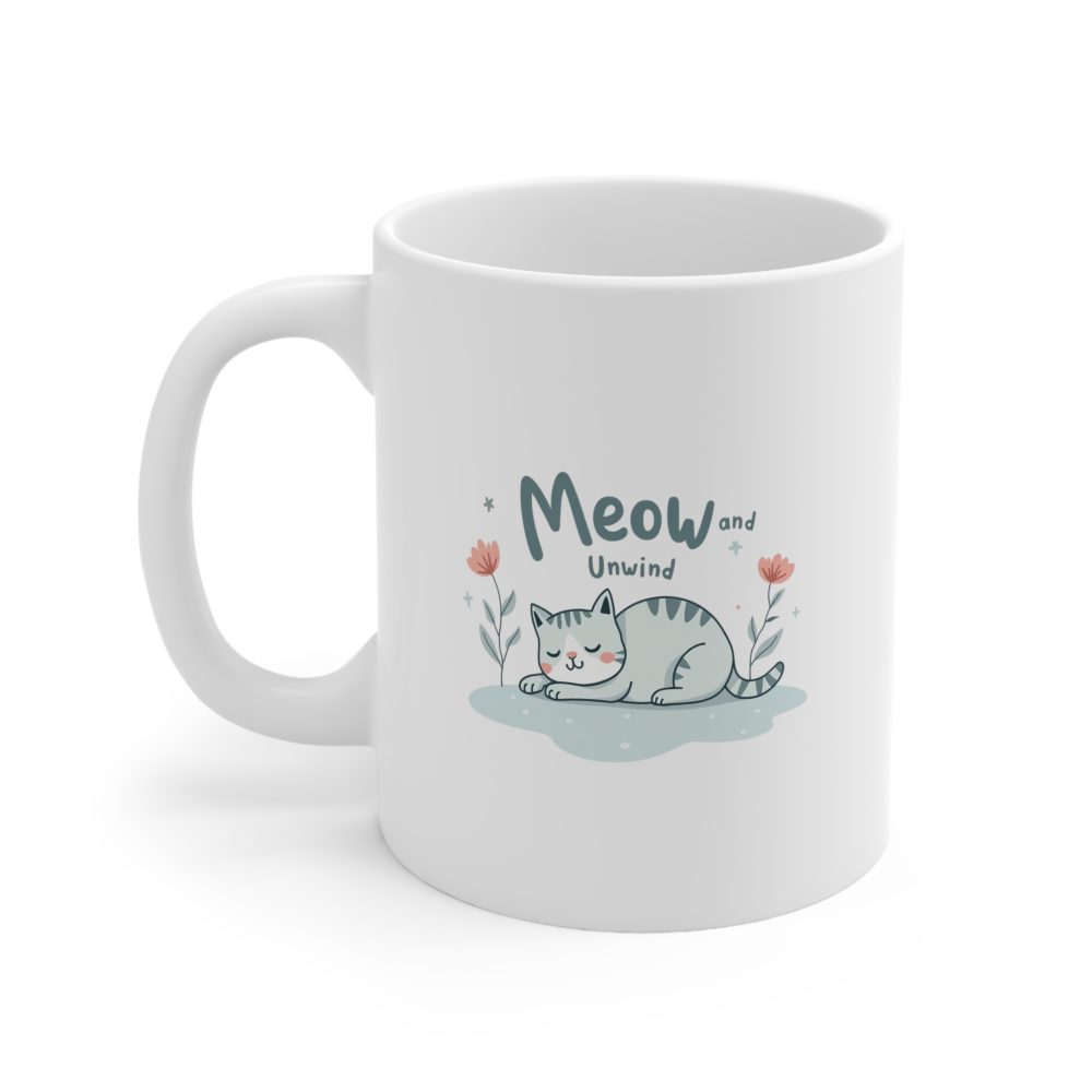 Kick back with this “Meow and Unwind” 11oz ceramic mug, featuring a relaxed cat illustration and calming message. Microwave- and dishwasher-safe — the purr-fect cup for peaceful sips.