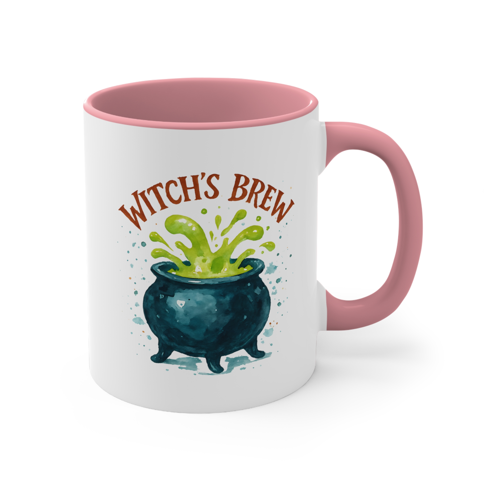 Cauldron Halloween mug with bubbling “Witch’s Brew” design, 11oz ceramic, microwave safe, hand wash recommended, available in 4 accent colours.