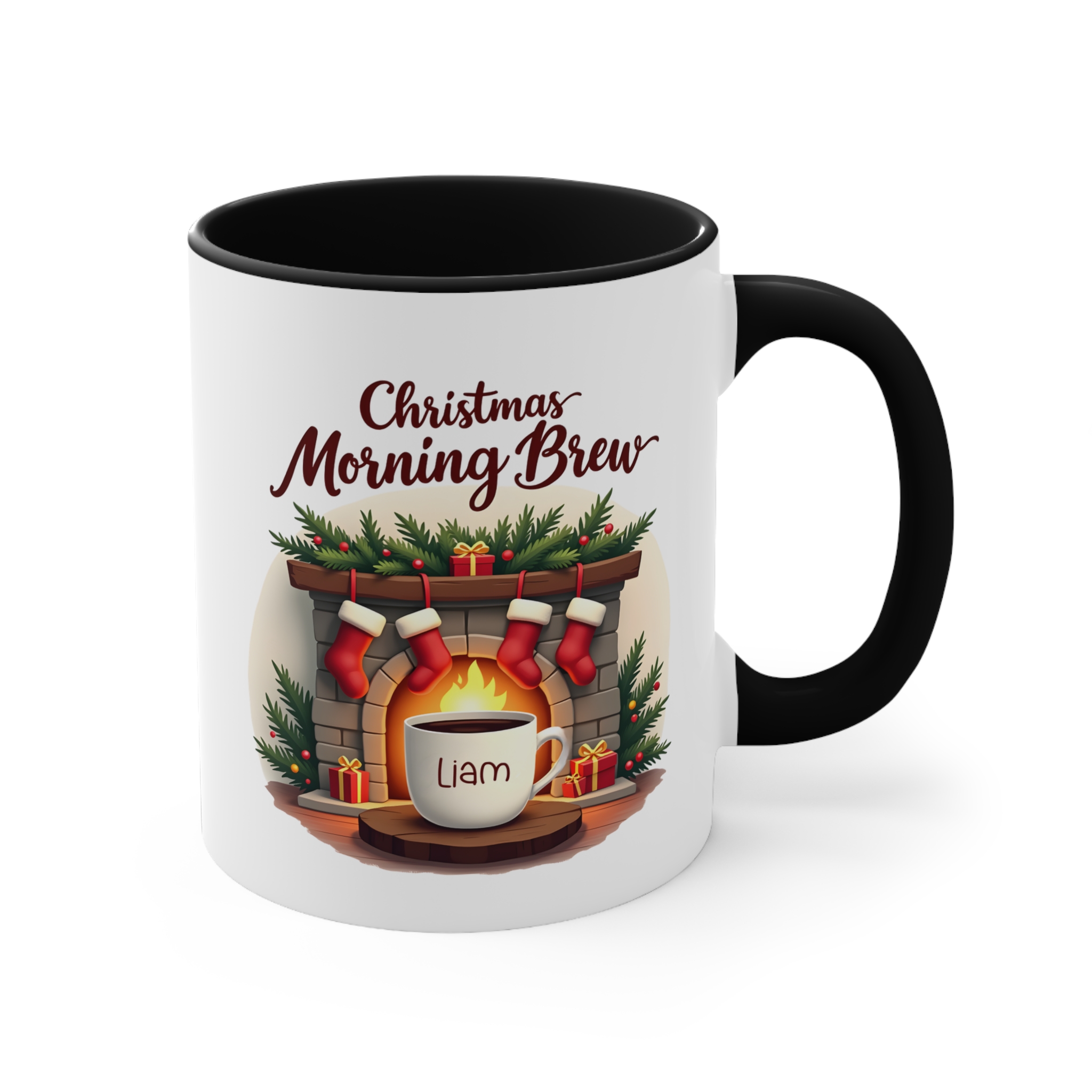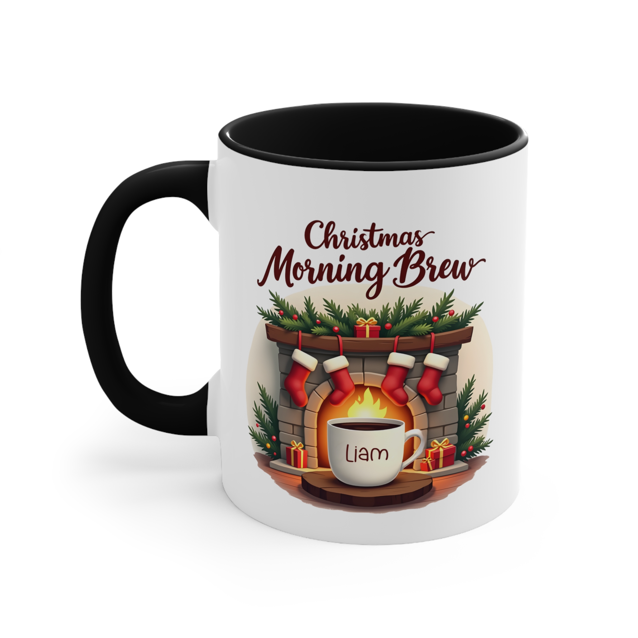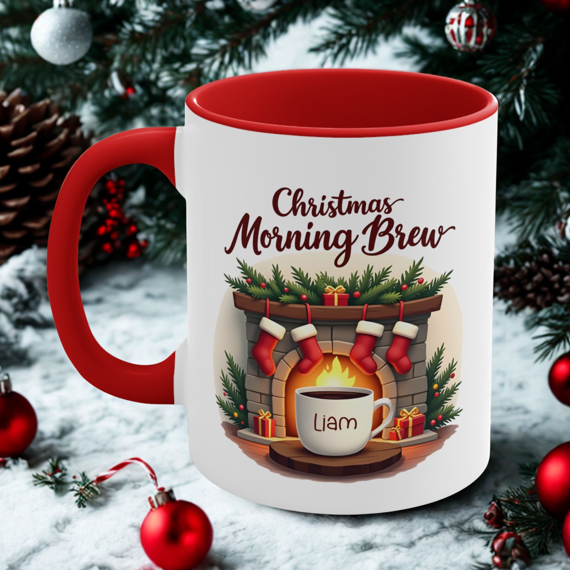 Christmas Morning Brew mug custom name design on 11oz ceramic, microwave safe, hand wash recommended, available in 4 accent colours.