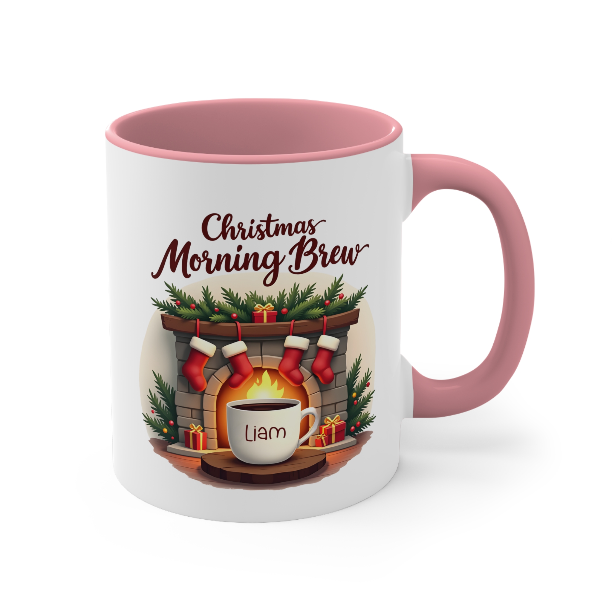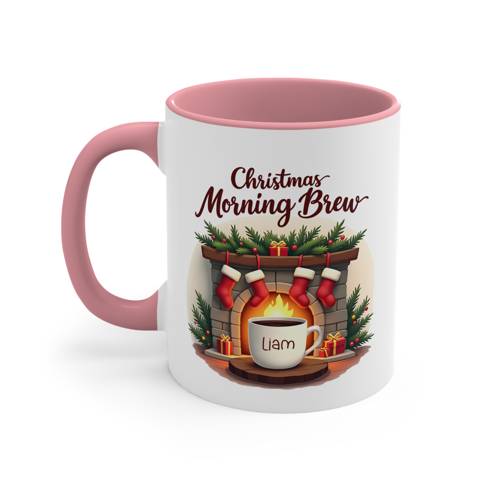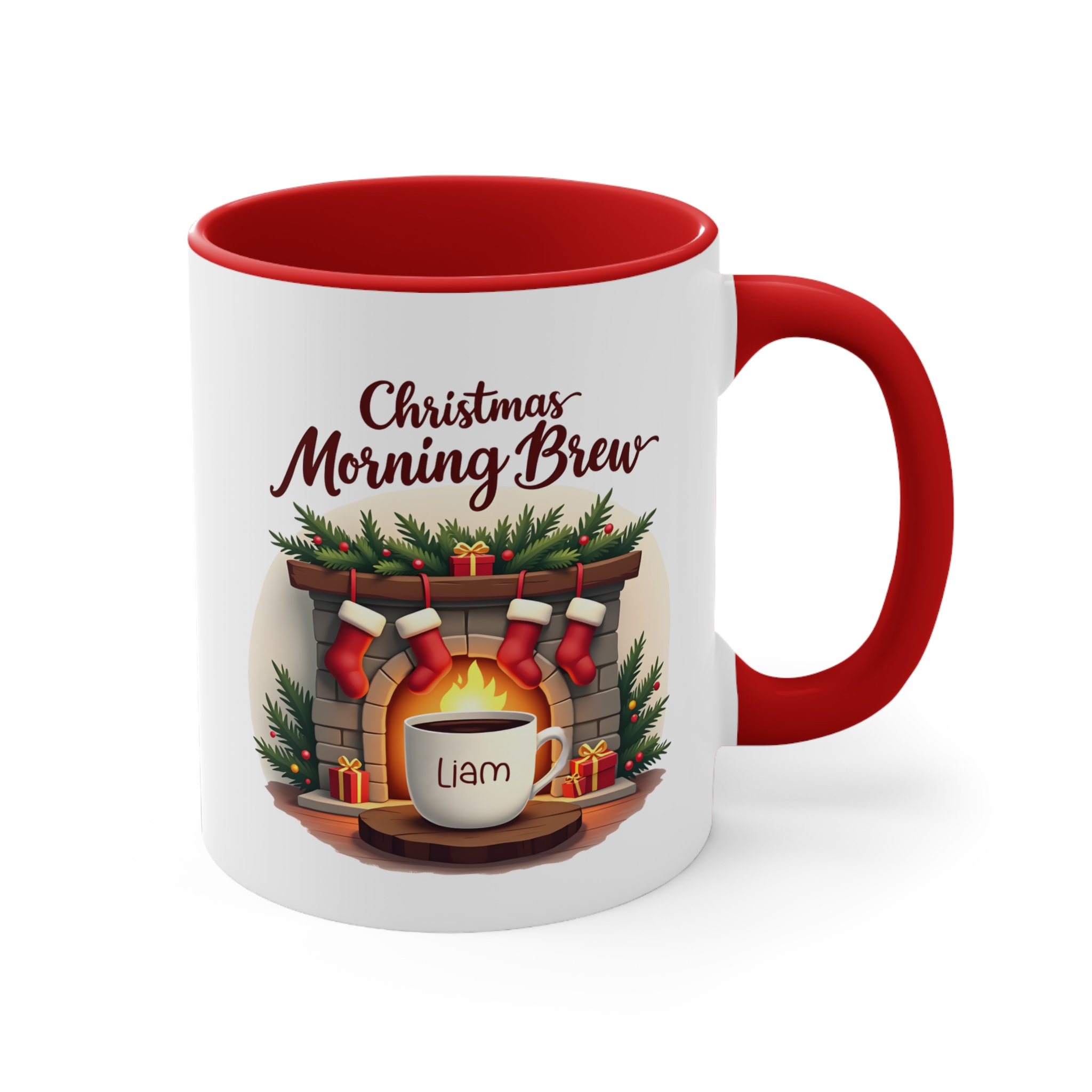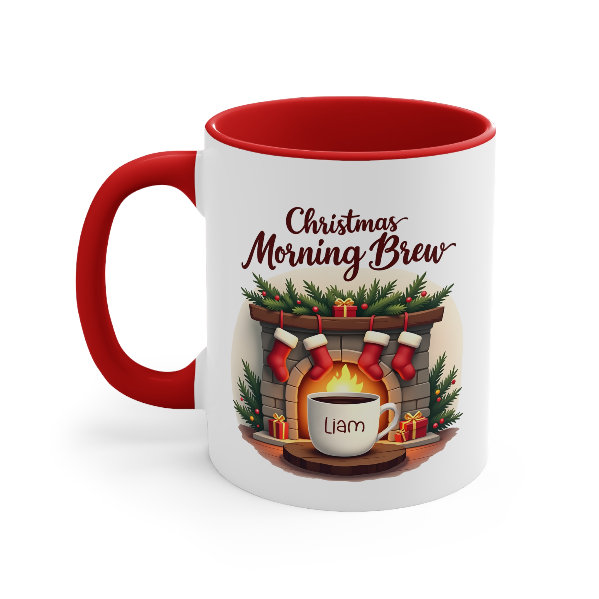 Christmas Morning Brew mug custom name design on 11oz ceramic, microwave safe, hand wash recommended, available in 4 accent colours.