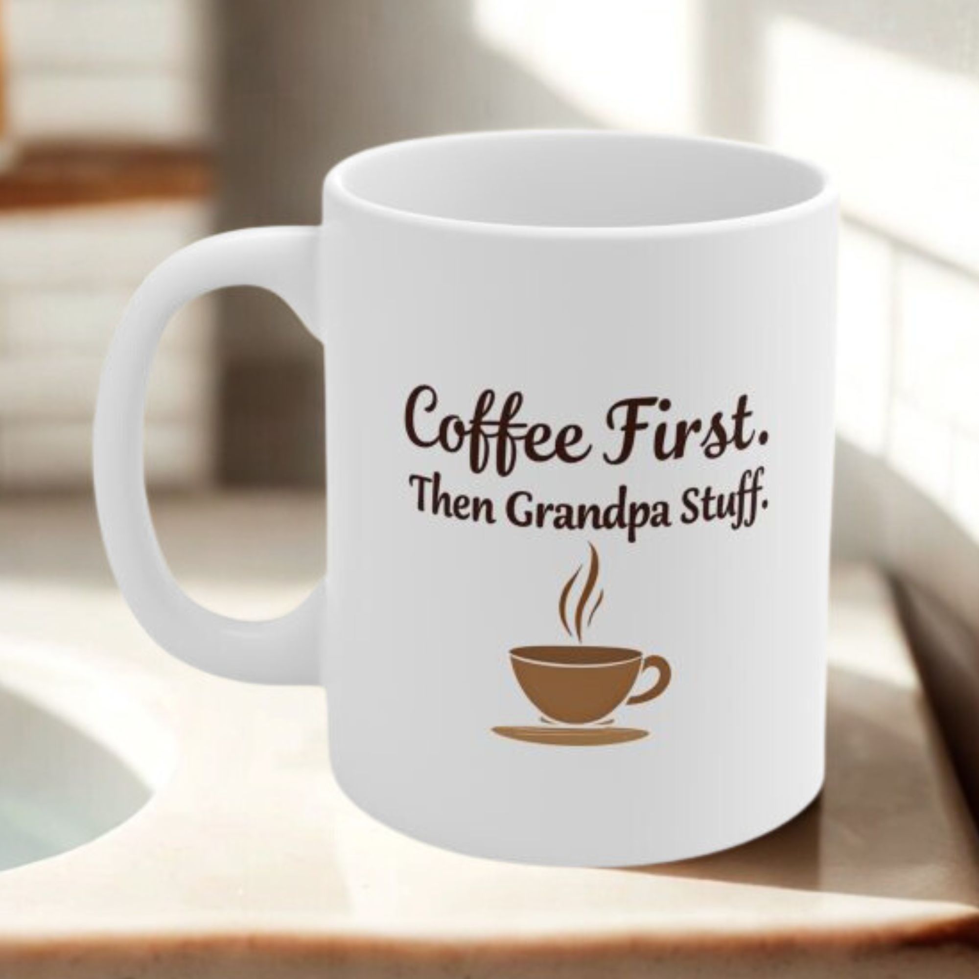 Coffee First. Then Grandpa Stuff.”—a sleek, minimalist mug with a coffee cup icon for modern granddads who sip before they serve.