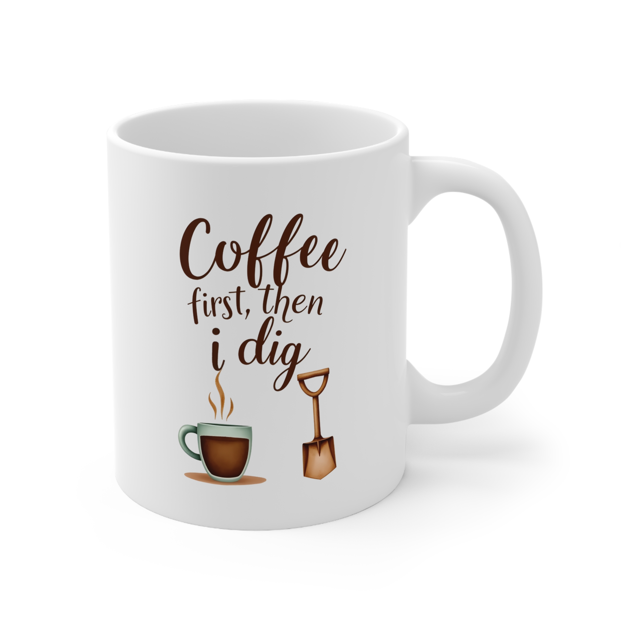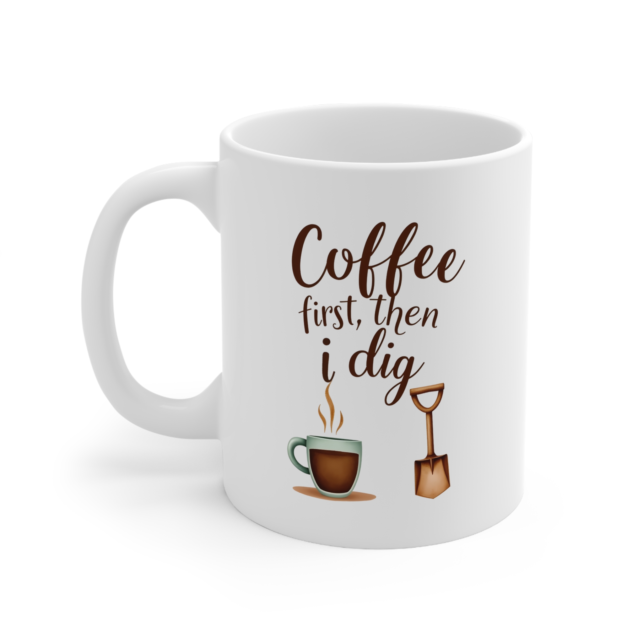 “Coffee First, Then I Dig”—a cozy watercolor mug with earthy garden tools and caffeine-fueled charm.