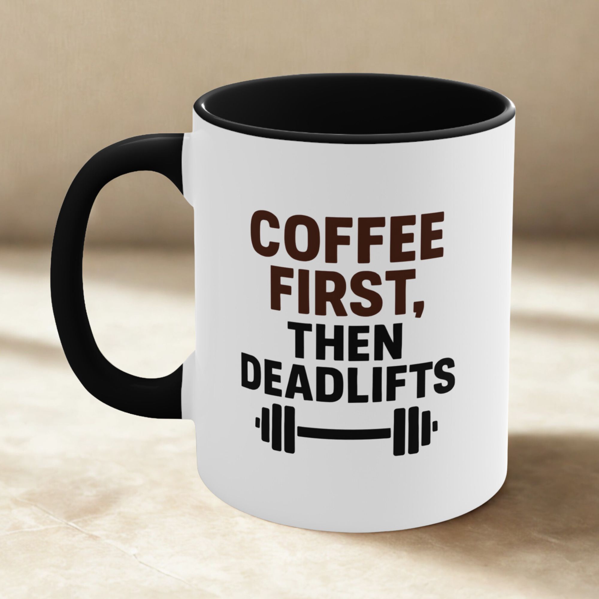 Bold gym coffee mug with “Coffee First, Then Deadlifts” text and barbell icon. Ideal for weightlifters, fitness buffs, and caffeine lovers.