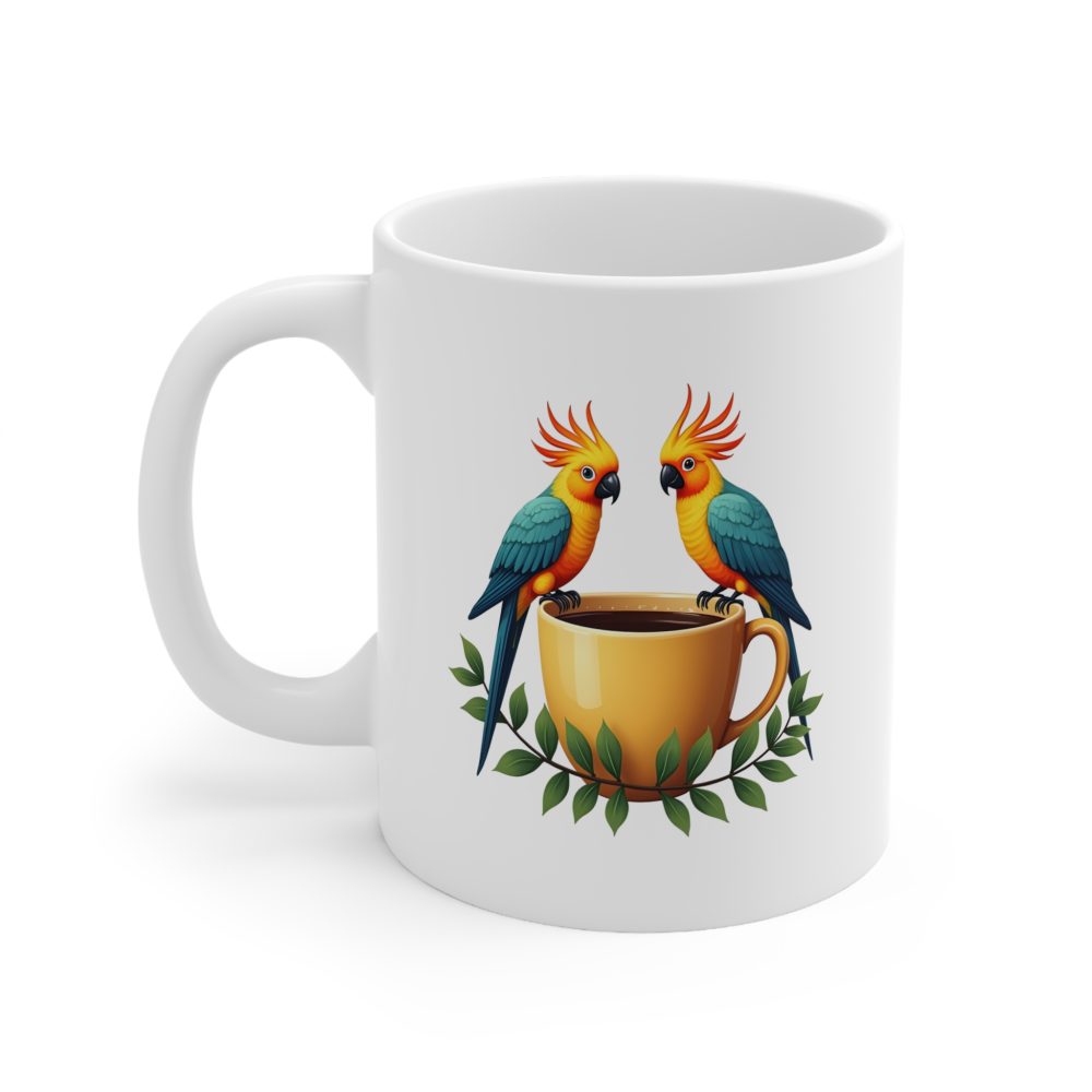 Vibrant cockatoos meet eucalyptus charm in this joyful Australian bird mug—perfect for nature-loving coffee drinkers.