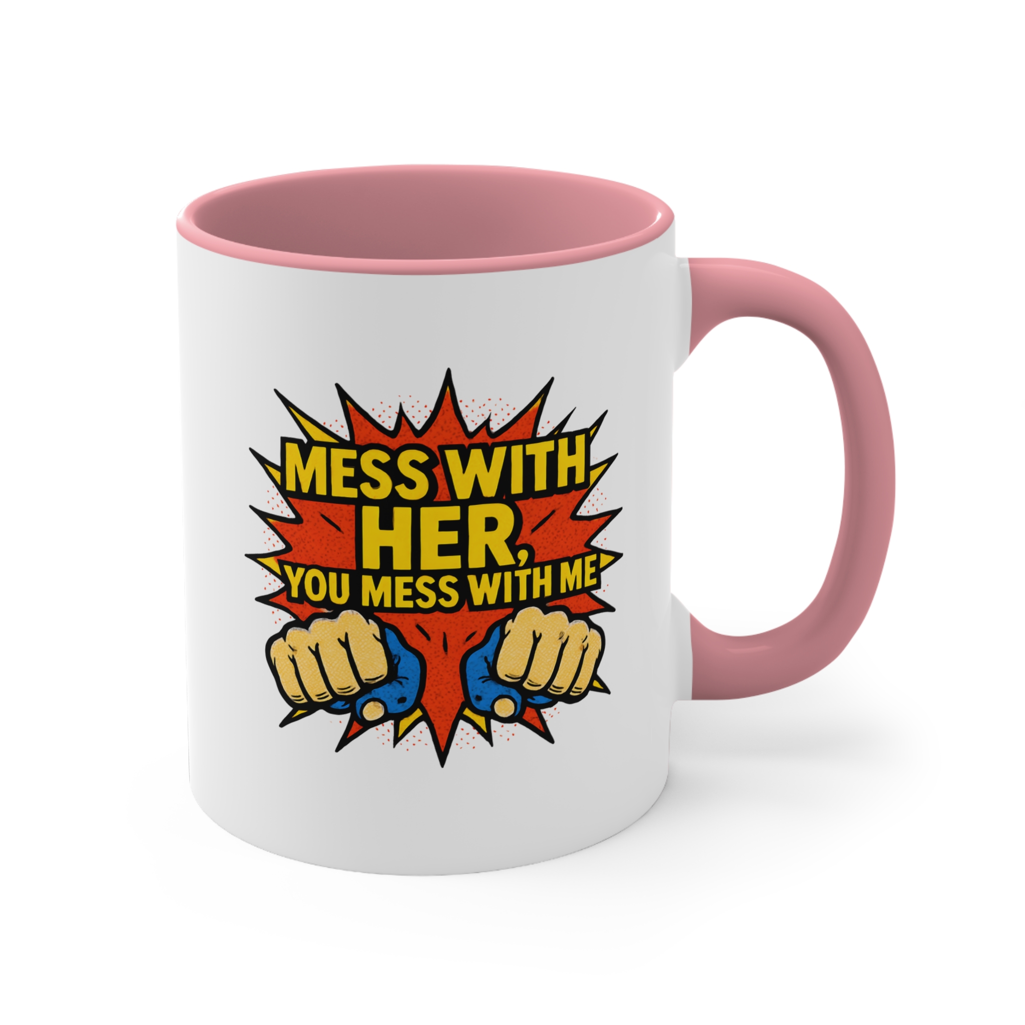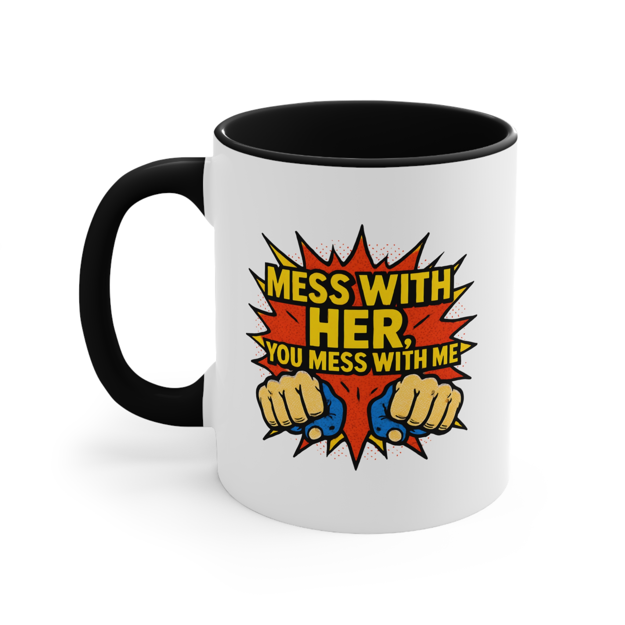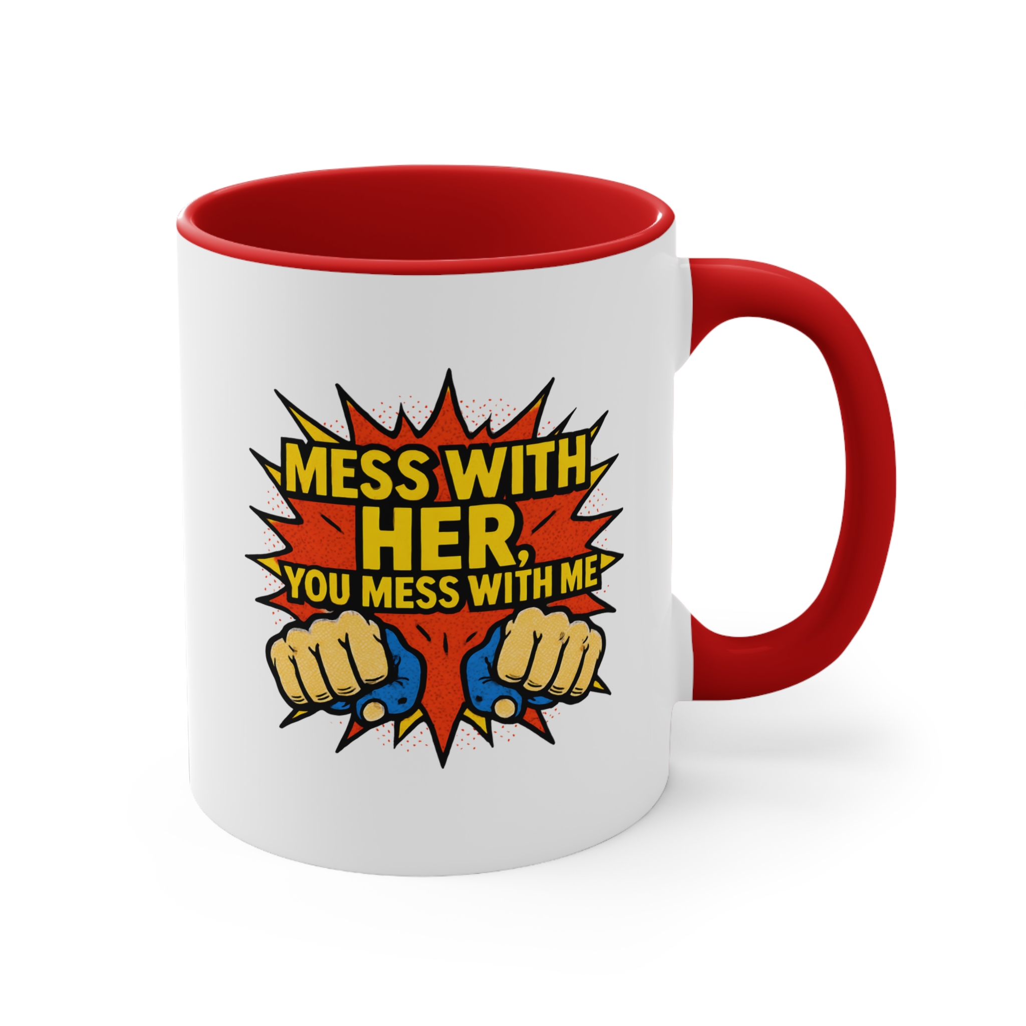 This comic best friend mug shouts “Mess With Her, You Mess With Me” in punchy comic style—perfect for bold, loyal friendships.