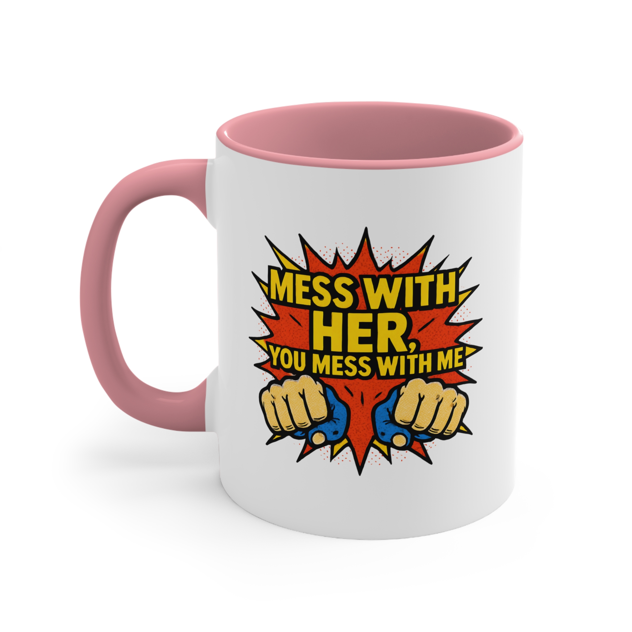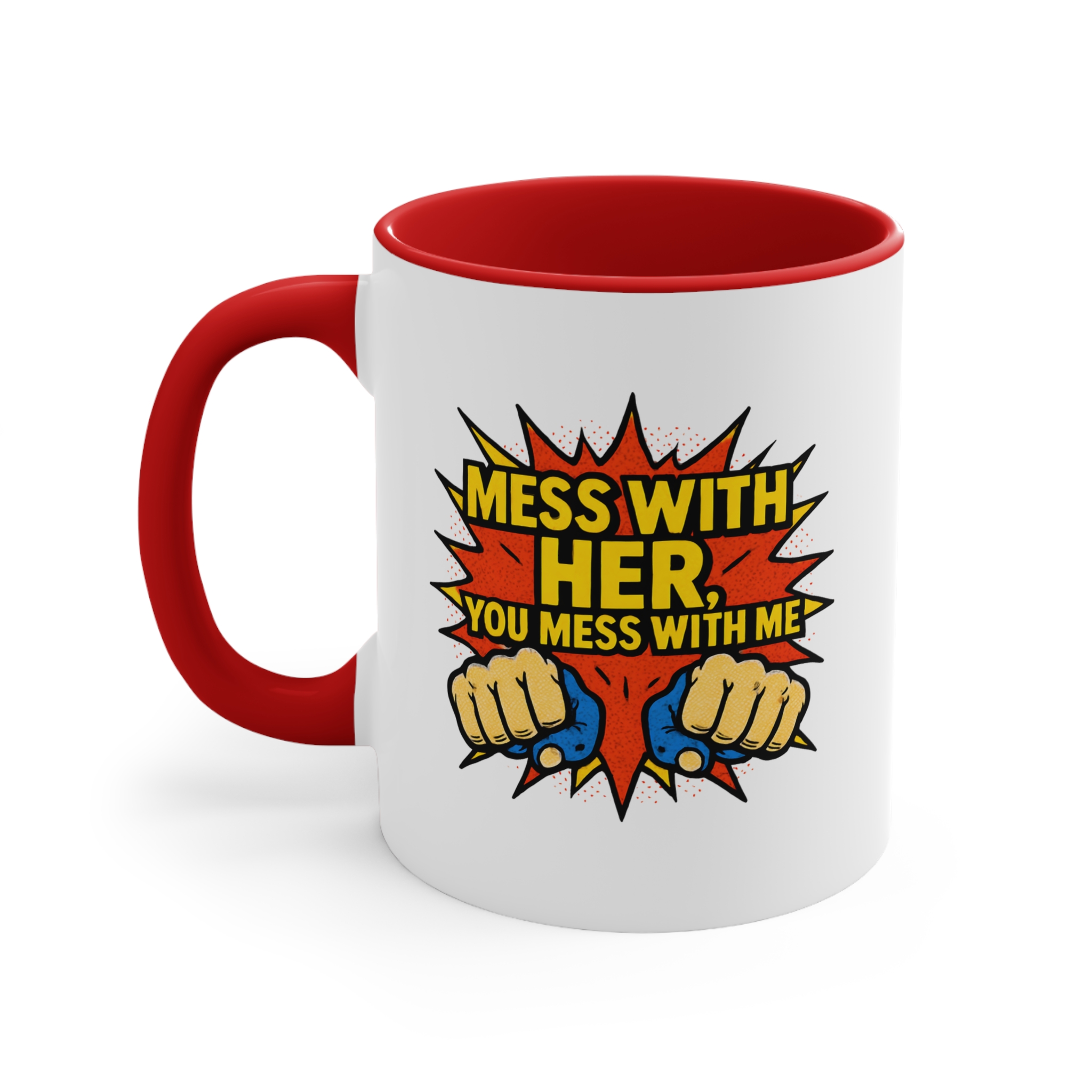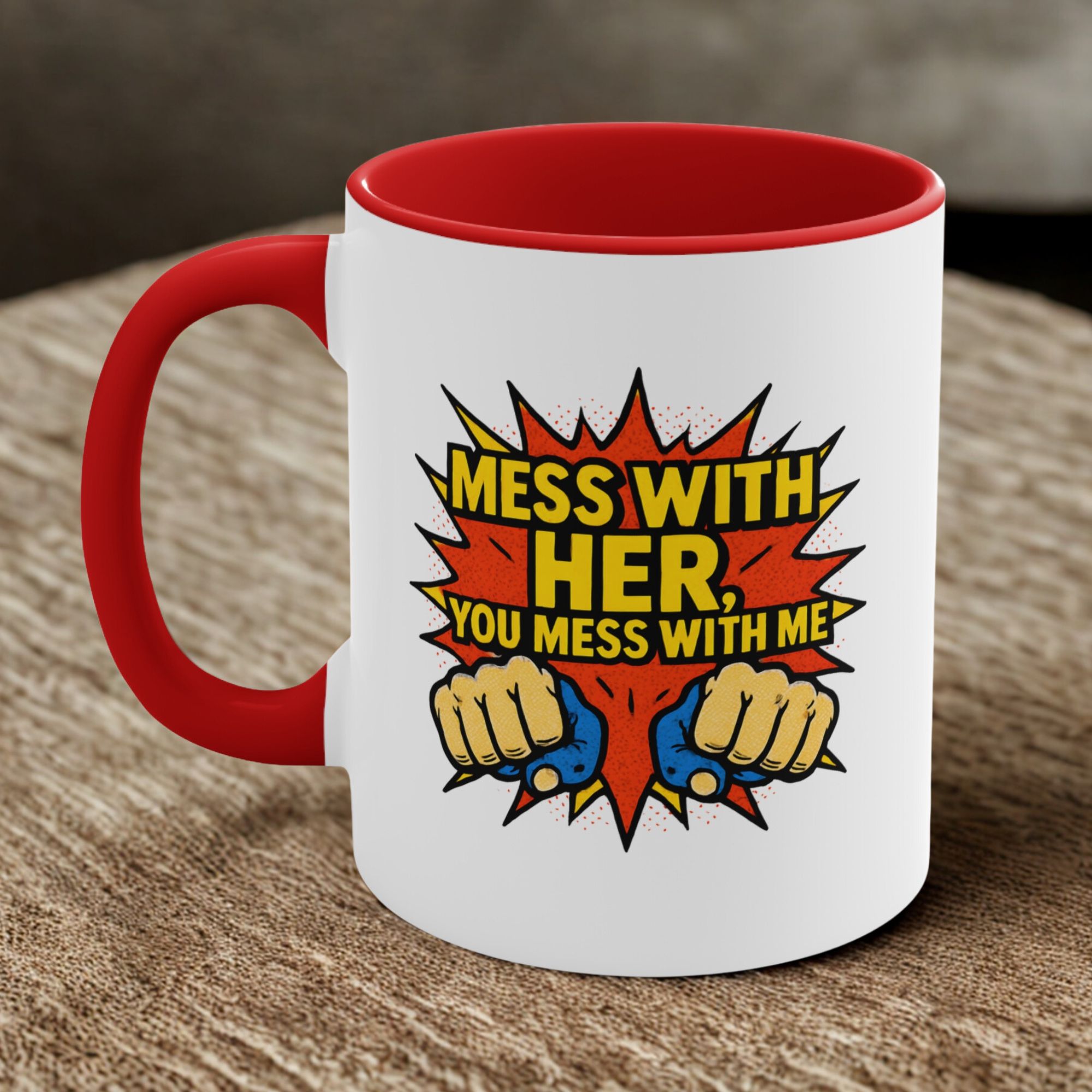 This comic best friend mug shouts “Mess With Her, You Mess With Me” in punchy comic style—perfect for bold, loyal friendships.
