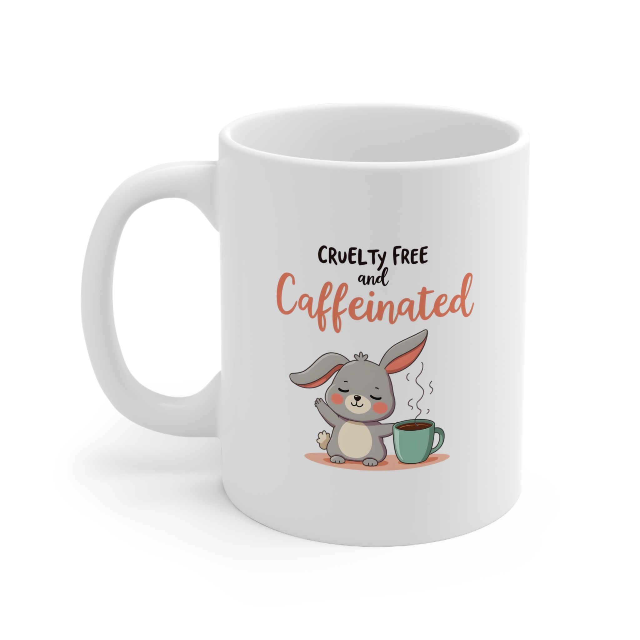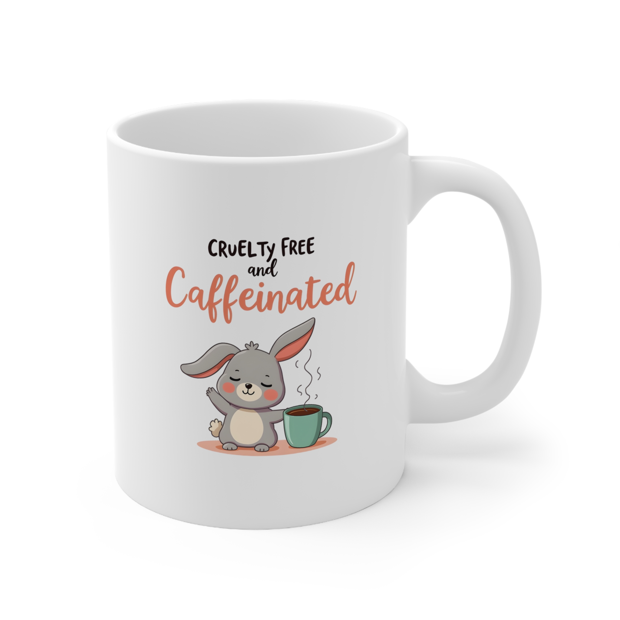Vegan mug featuring a chill bunny, coffee cup, and “Cruelty-Free and Caffeinated” message—gentle and bold all in one.