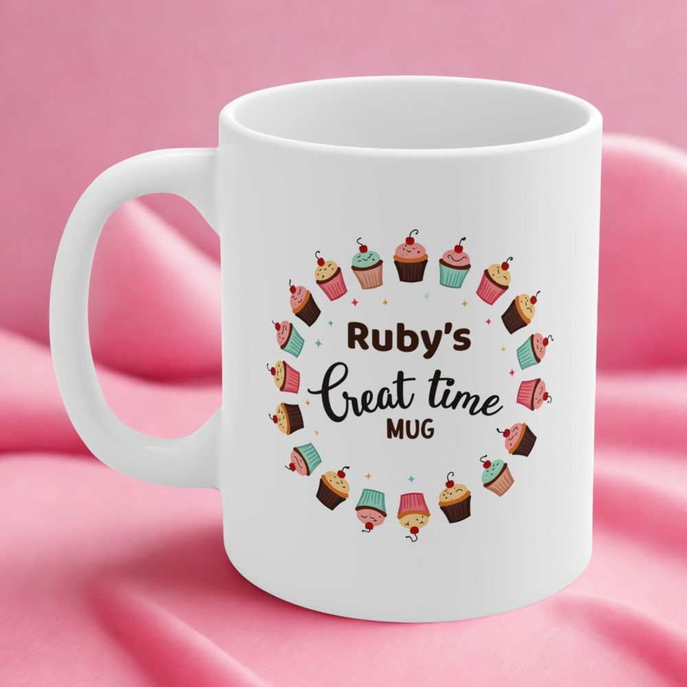 “Cupcake Cutie – [Name]’s Treat Time Mug” in fun, handwritten font