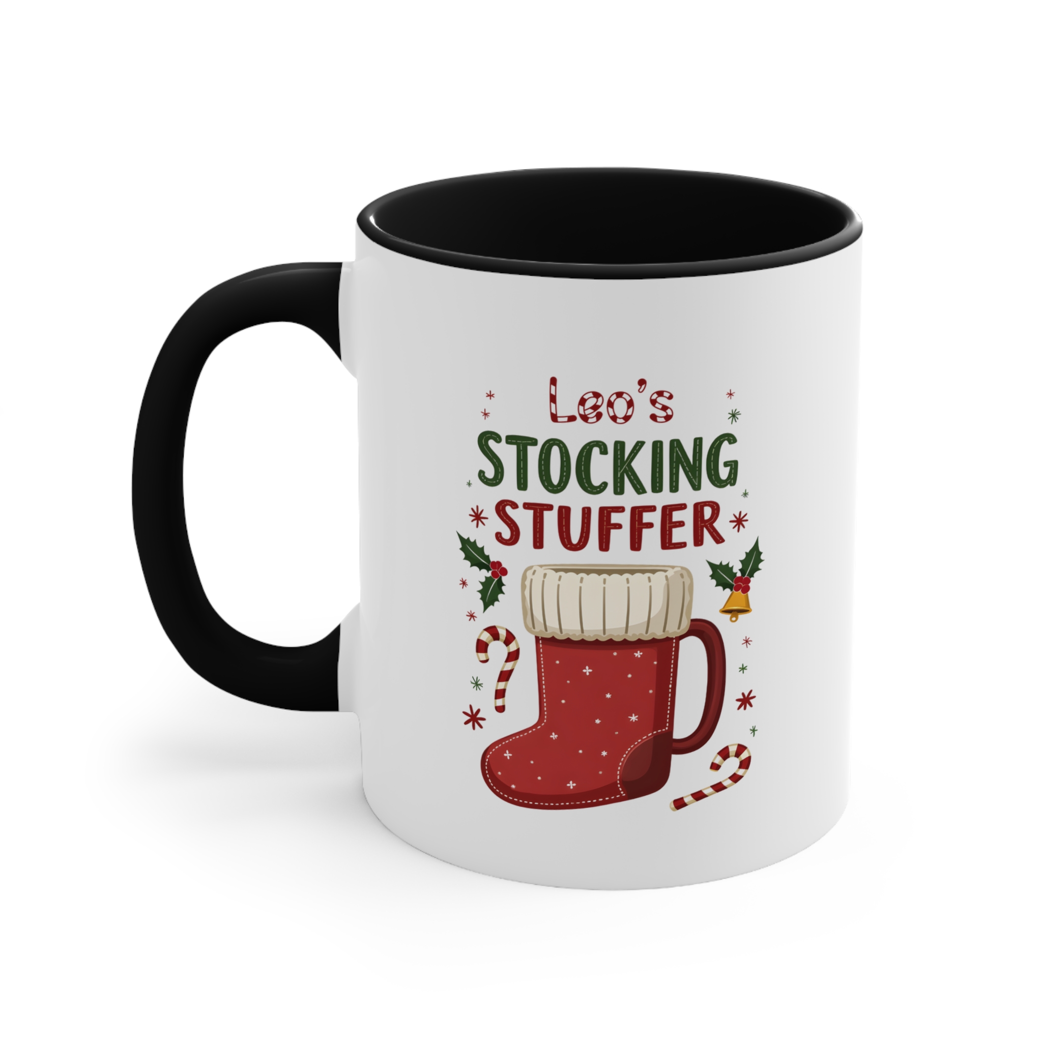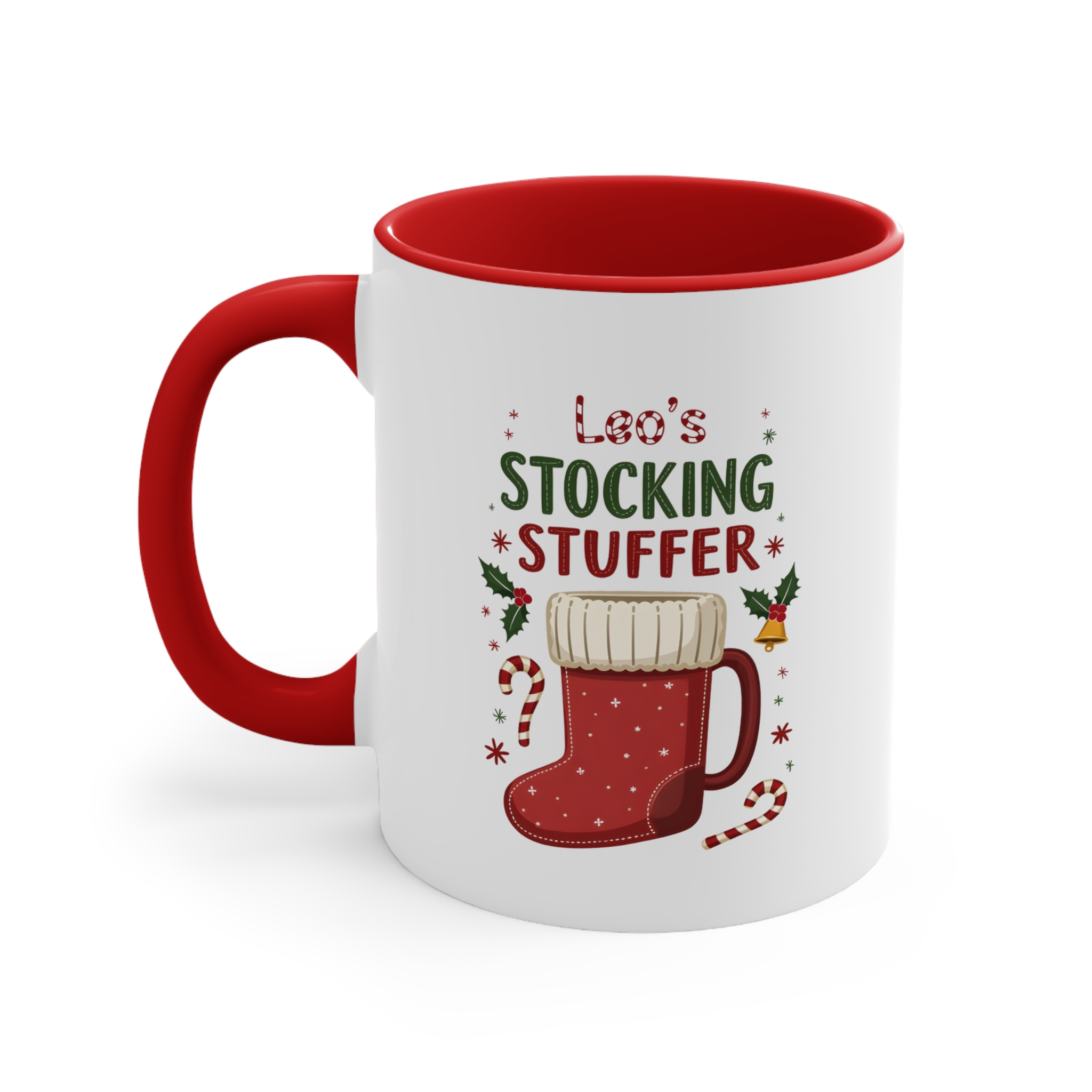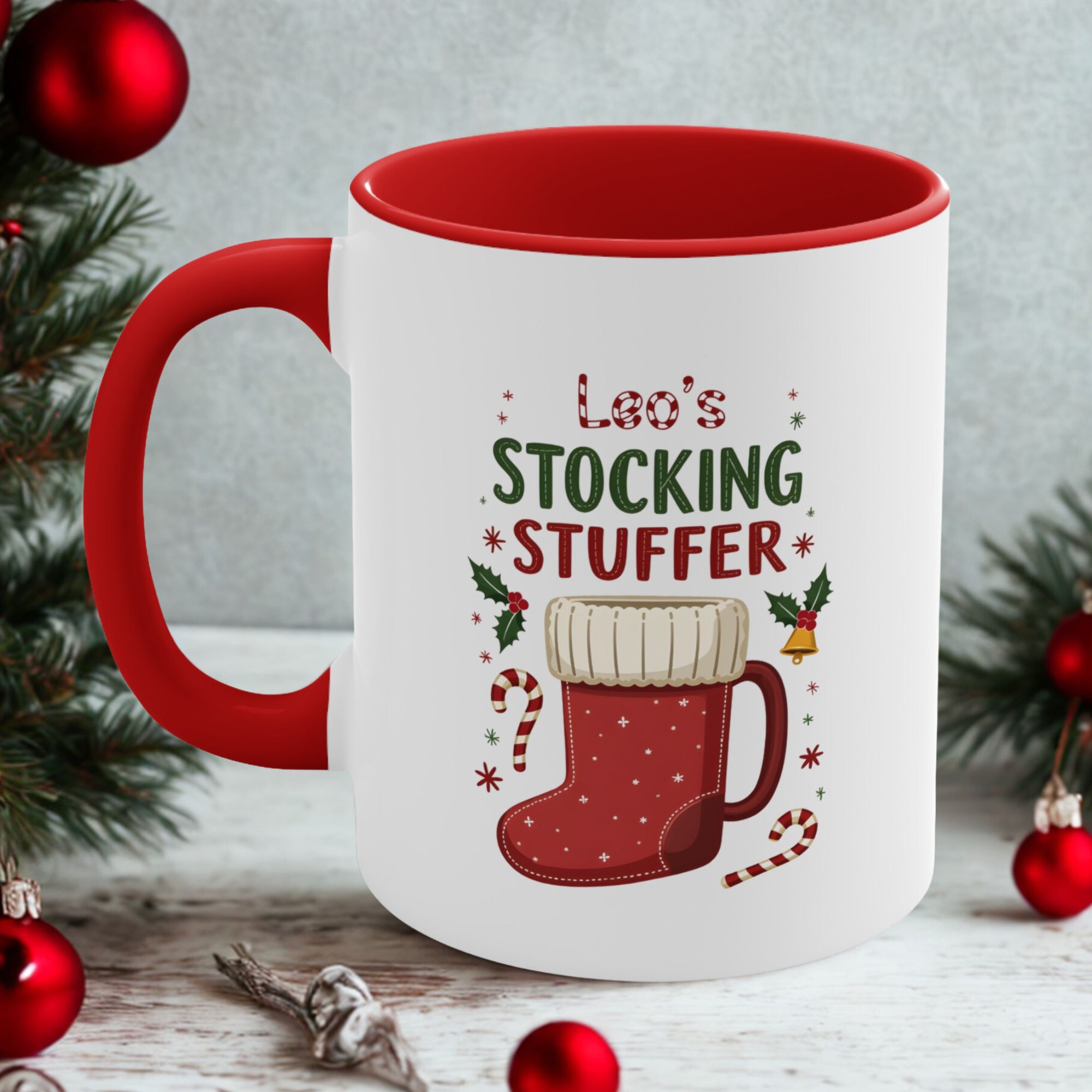 The custom Christmas stocking mug is a festive treat that makes the perfect stocking stuffer. Featuring a cheerful red stocking design decorated with candy canes, holly, and bells, this mug captures the joy of Christmas traditions.