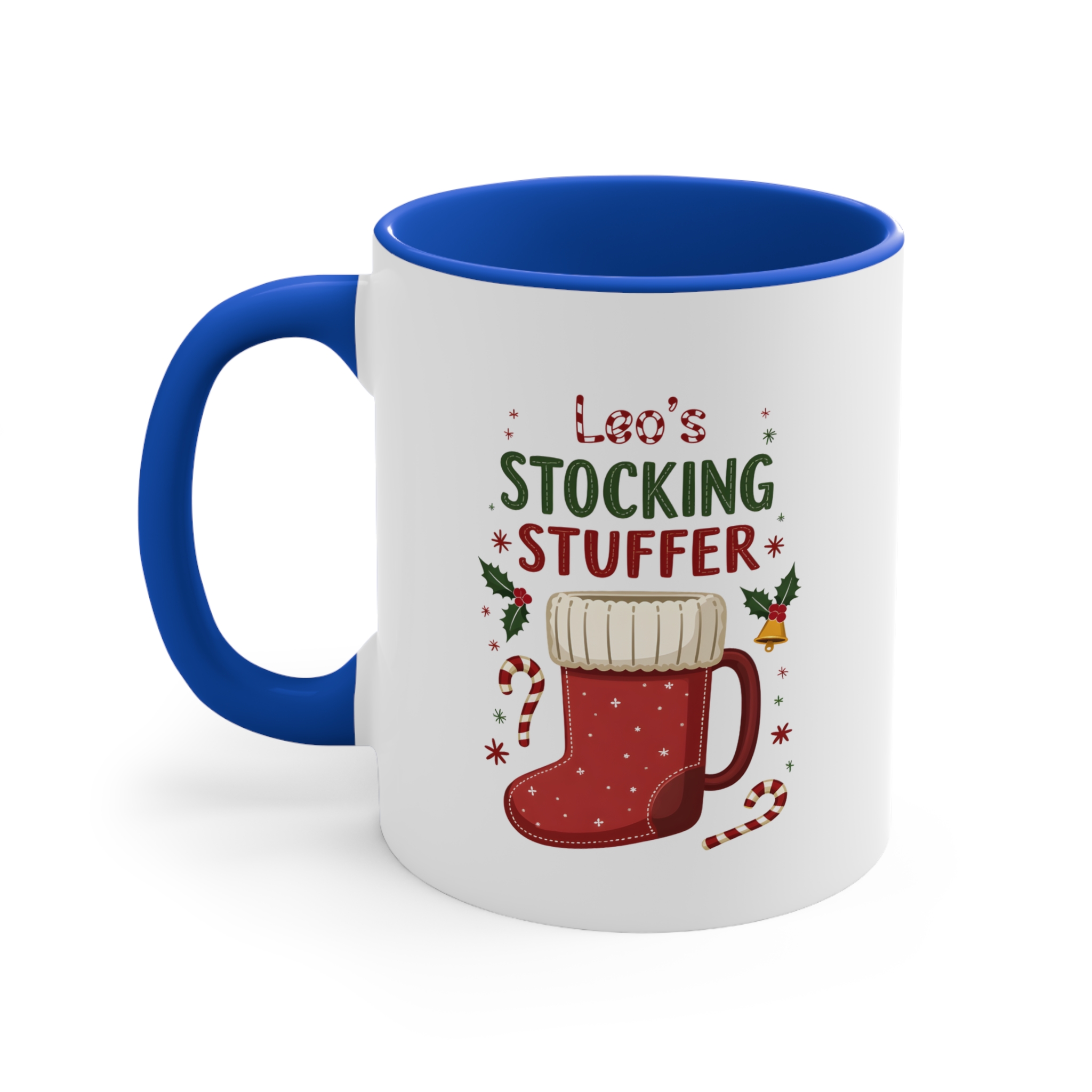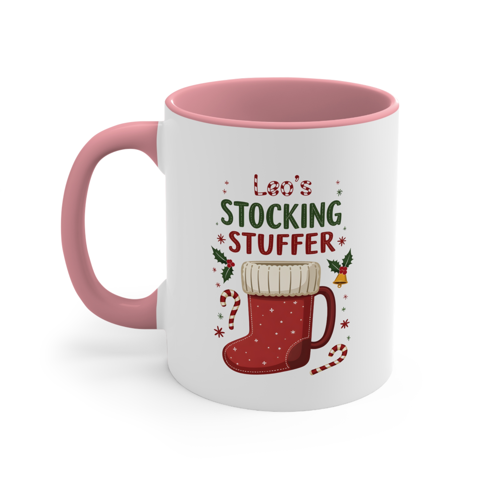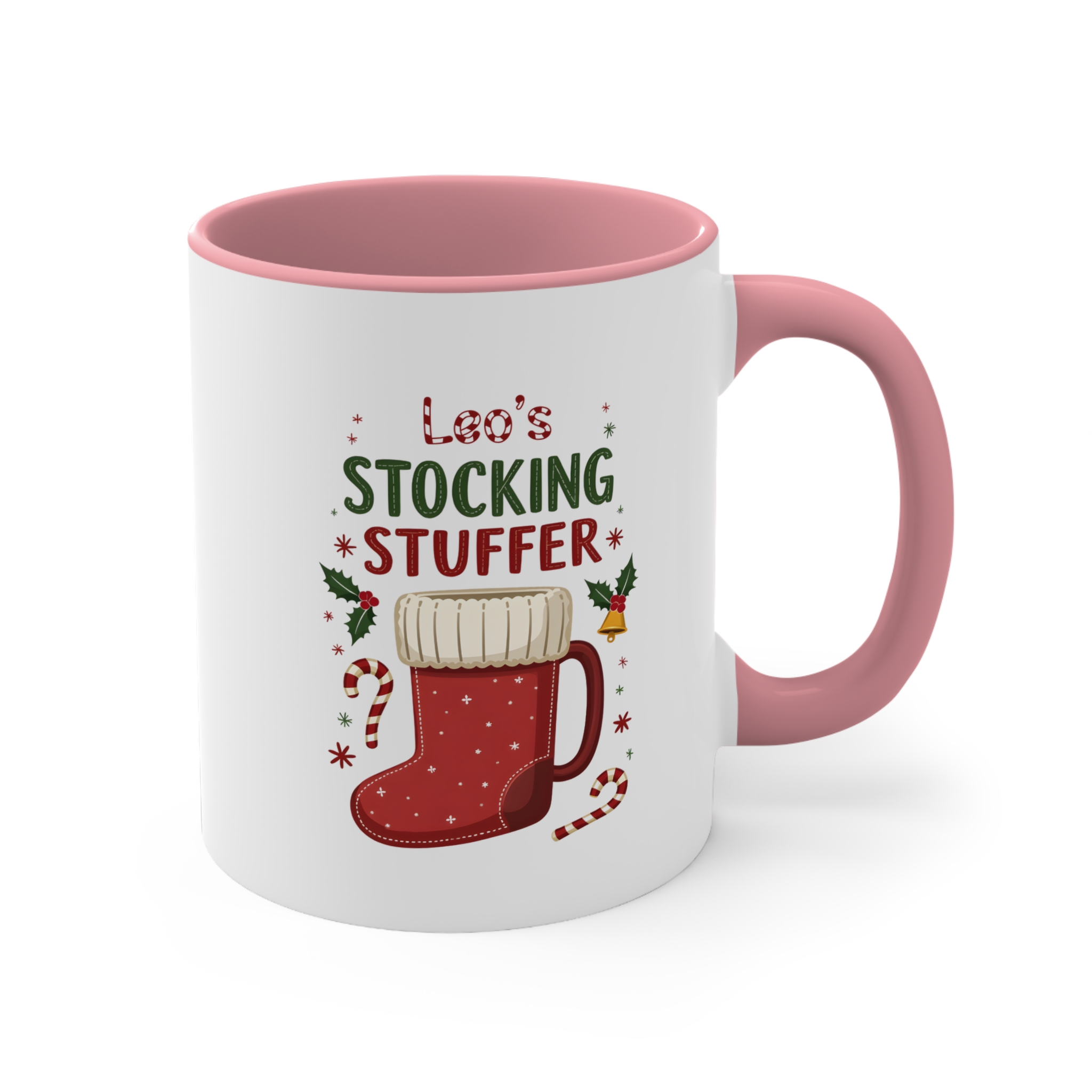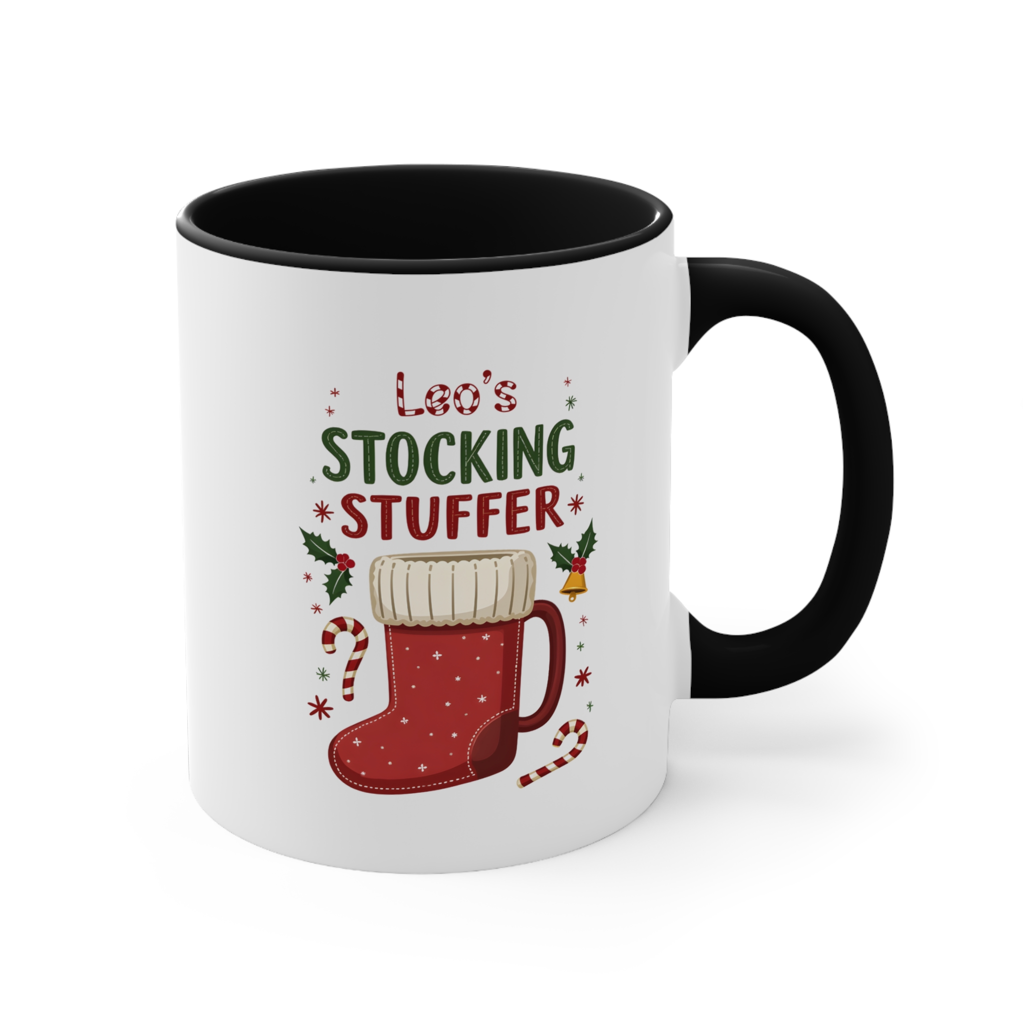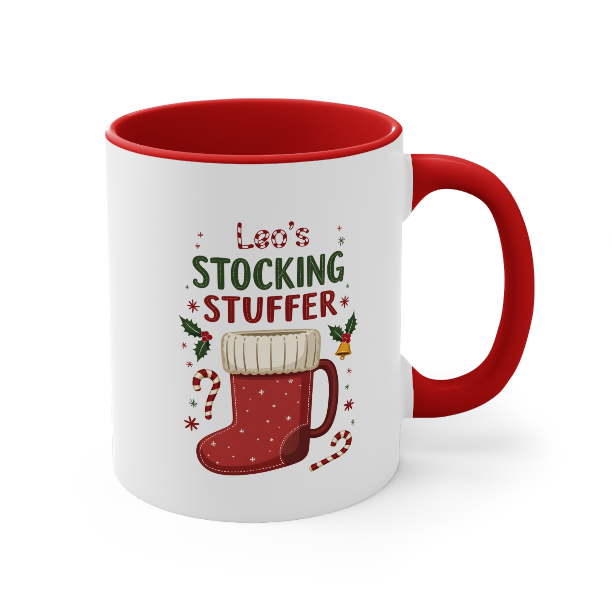 Custom Christmas stocking mug with name design, 11oz ceramic, microwave safe, hand wash recommended, available in 4 accent colours.