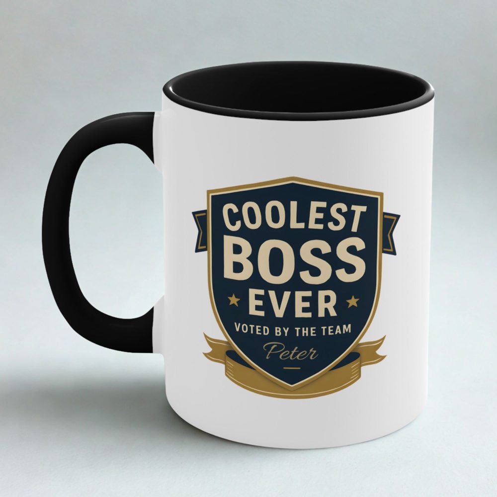 Recognise an exceptional leader with this custom coolest boss ever award mug. Designed like a classic award badge, this mug proudly features the message “Coolest Boss Ever – Voted by the Team,” making it a standout gift for any workplace hero.