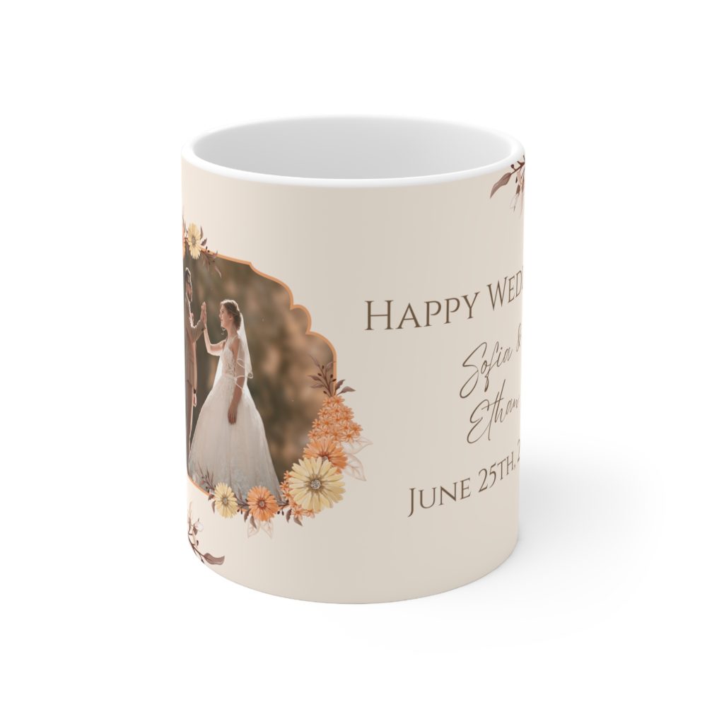 Celebrate a love story with our beautifully designed custom wedding photo mug, a heartfelt gift or keepsake for couples. Featuring a soft pastel background (#fff4e8) and delicate floral accents, this personalised mug perfectly captures the beauty of a special day.