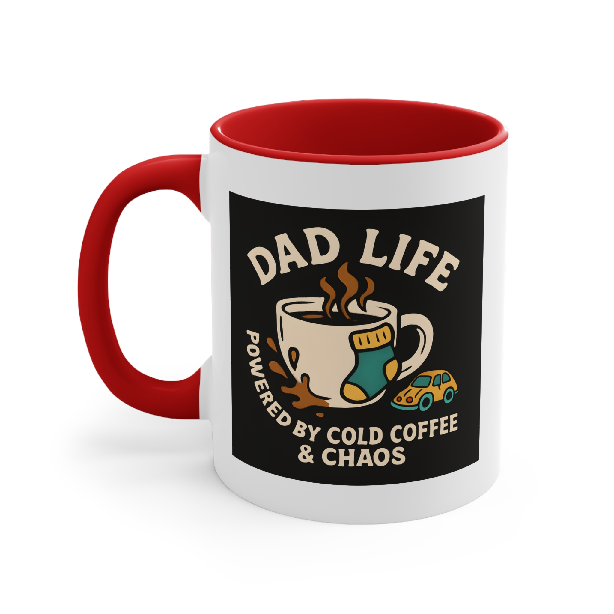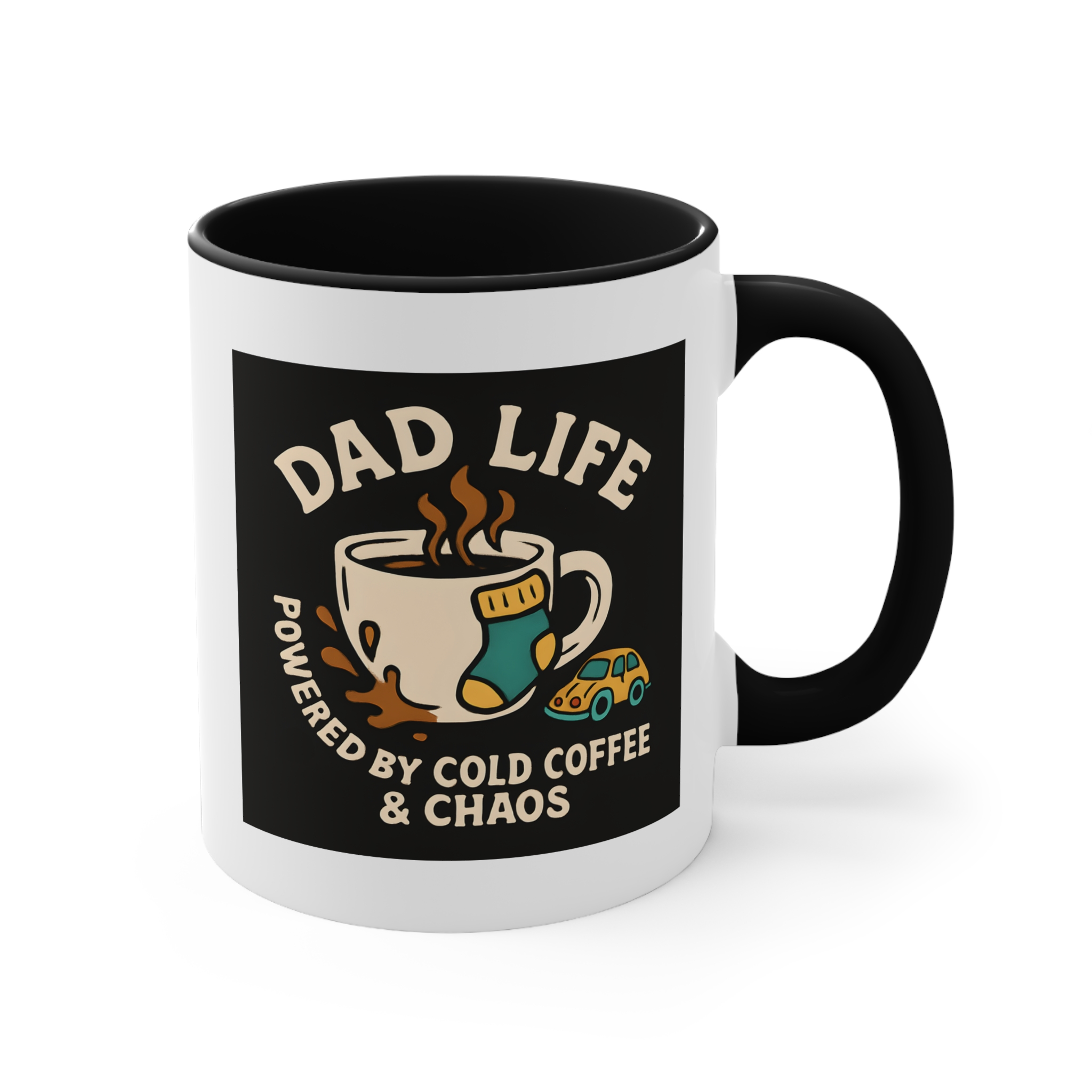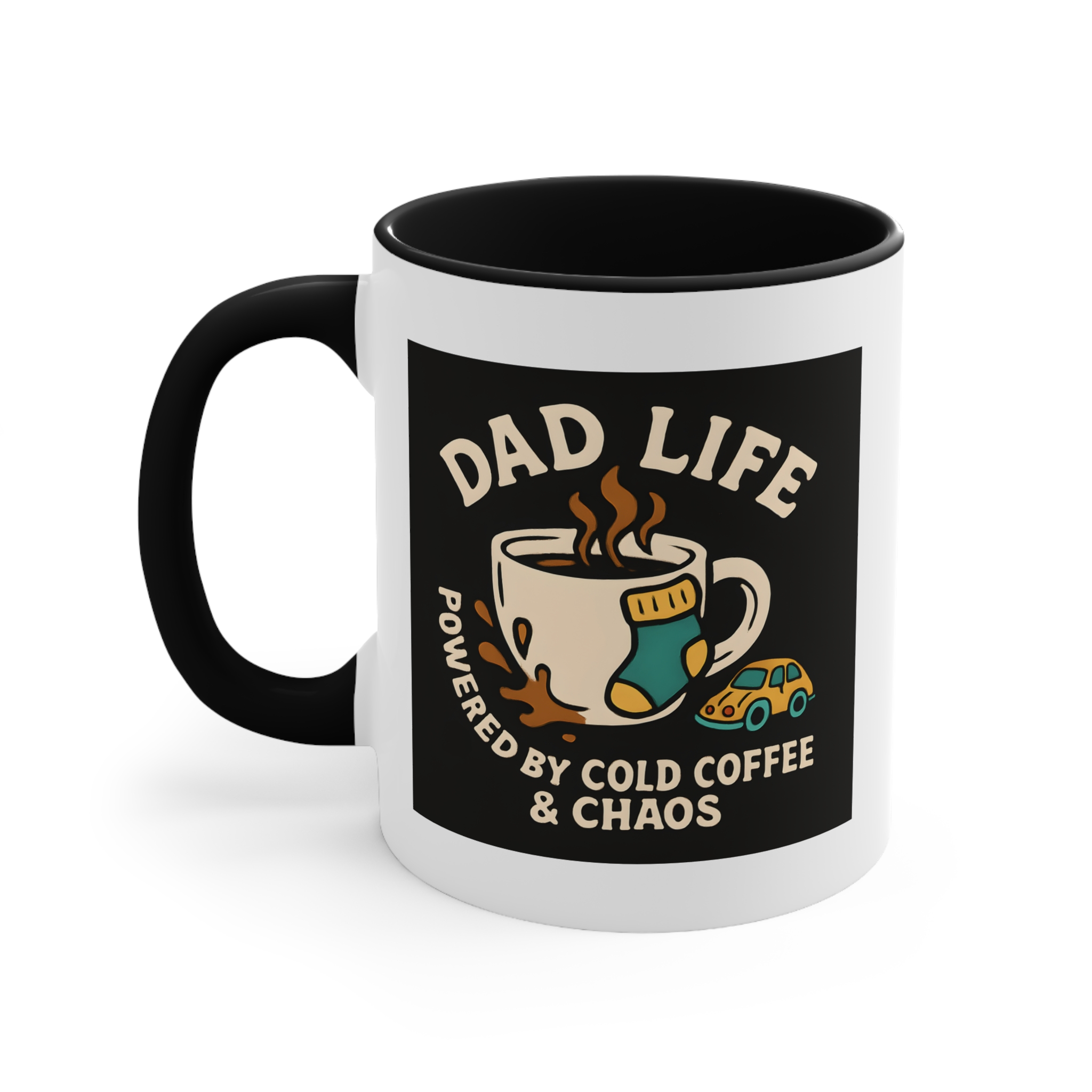 Welcome to the real MVP club — where cold coffee is a lifestyle and chaos is part of the charm. This hilarious Dad Life mug features a steaming cup of coffee surrounded by all-too-familiar dad debris: a lone sock, a tiny toy car, and a splash of coffee on the side. With bold retro-inspired art and the words “Powered by Cold Coffee & Chaos,” this mug is a badge of honour for every hands-on, sleep-deprived, toy-stepping father out there. Ideal for early mornings, late nights, and everything in between.