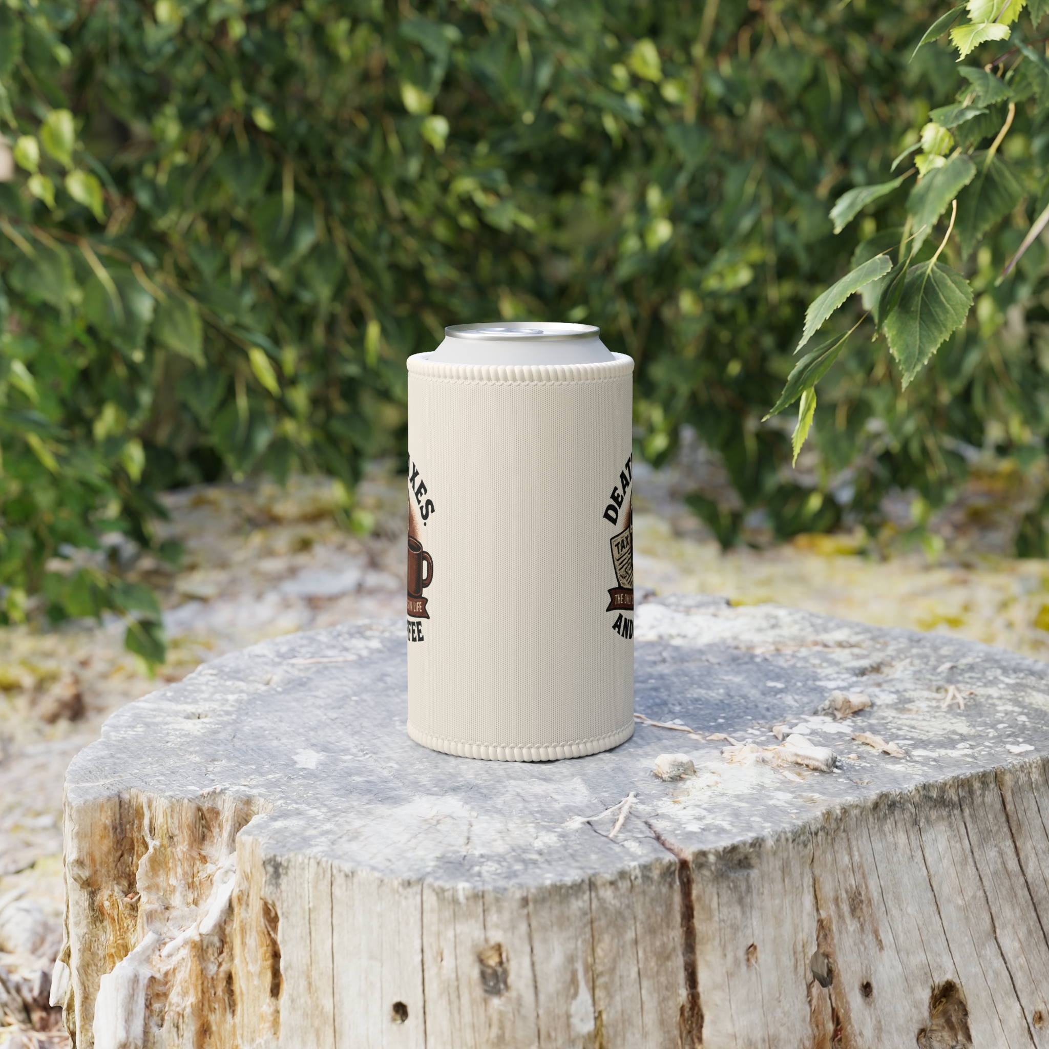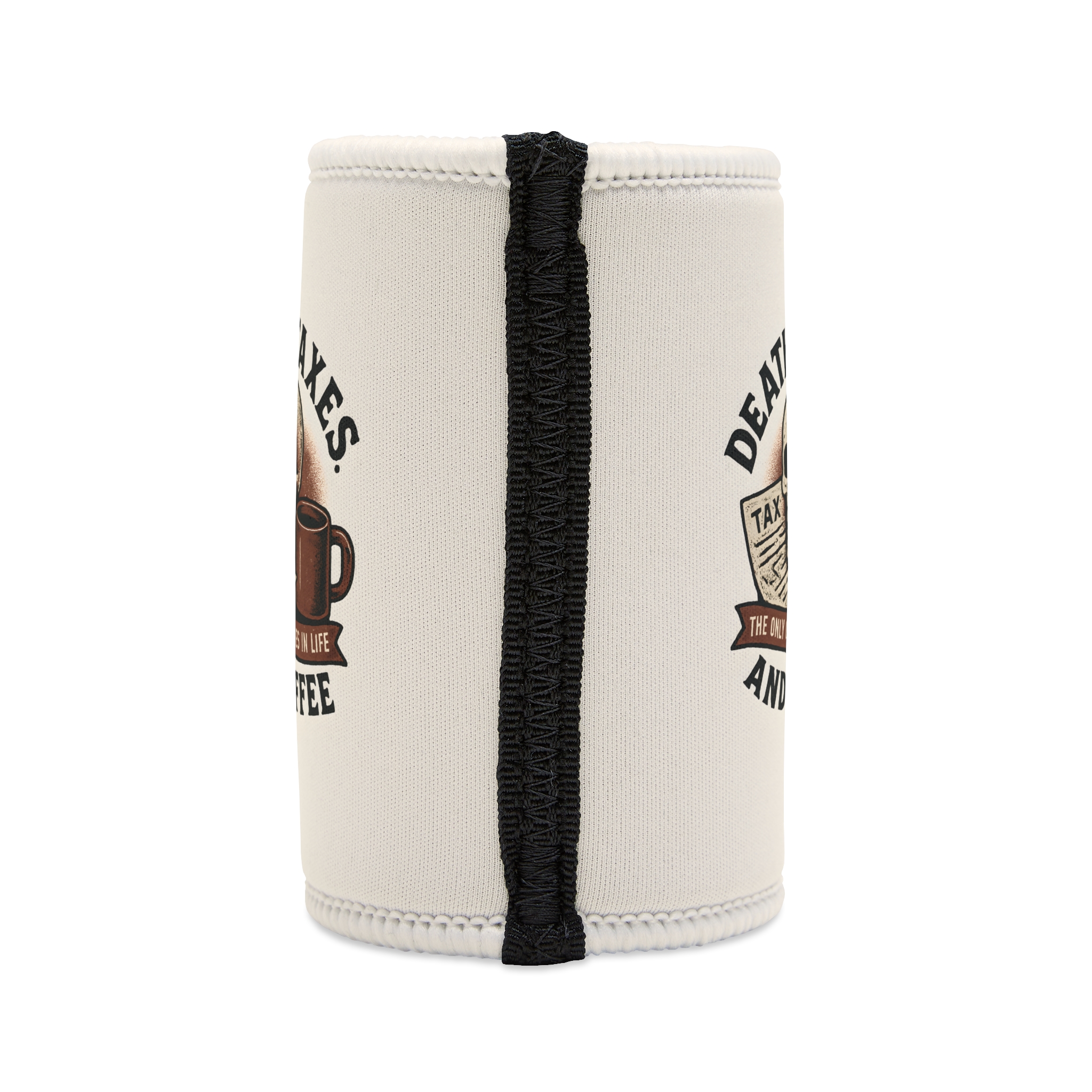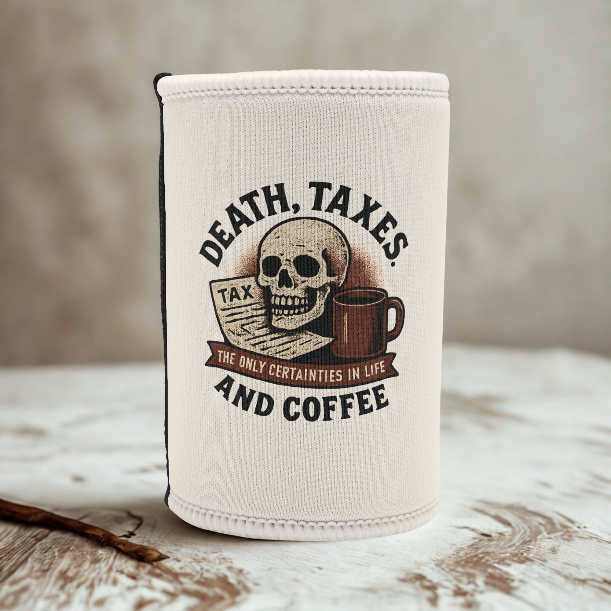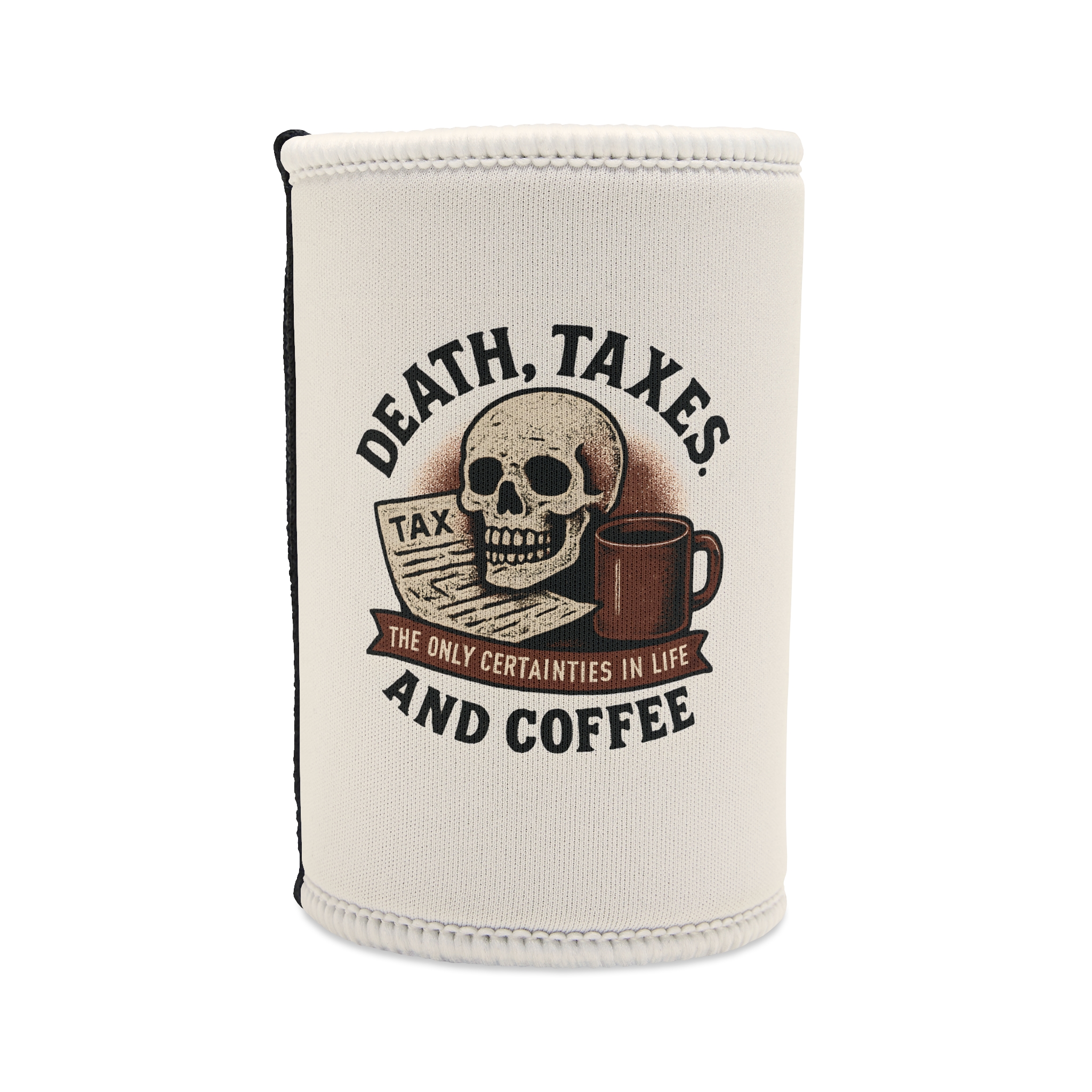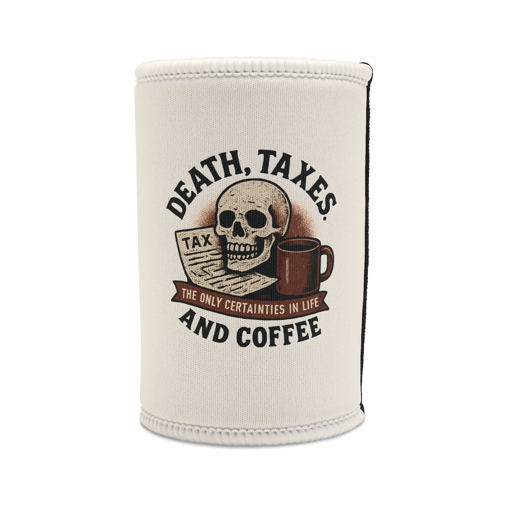 Embrace life’s brutal truths with this “Death, Taxes, and Coffee” stubby cooler. Vintage skull, coffee cup, and tax paper design on soft off-white.
