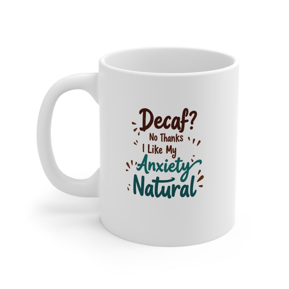 Bold, relatable, and just the right amount of chaotic—this funny coffee mug is perfect for anyone who runs on caffeine and personality. Featuring the hilarious quote “Decaf? No Thanks, I Like My Anxiety Natural,” the design combines a playful handwritten-style font on top with a flowing script below, creating a layered look full of attitude. The earthy coffee browns and creamy tones bring warmth, while a pop of teal adds energy—just like your daily brew. Whether you’re sipping at home, at work, or letting the world know you prefer your nerves shaken and stirred, this mug’s got your back (and your beans).