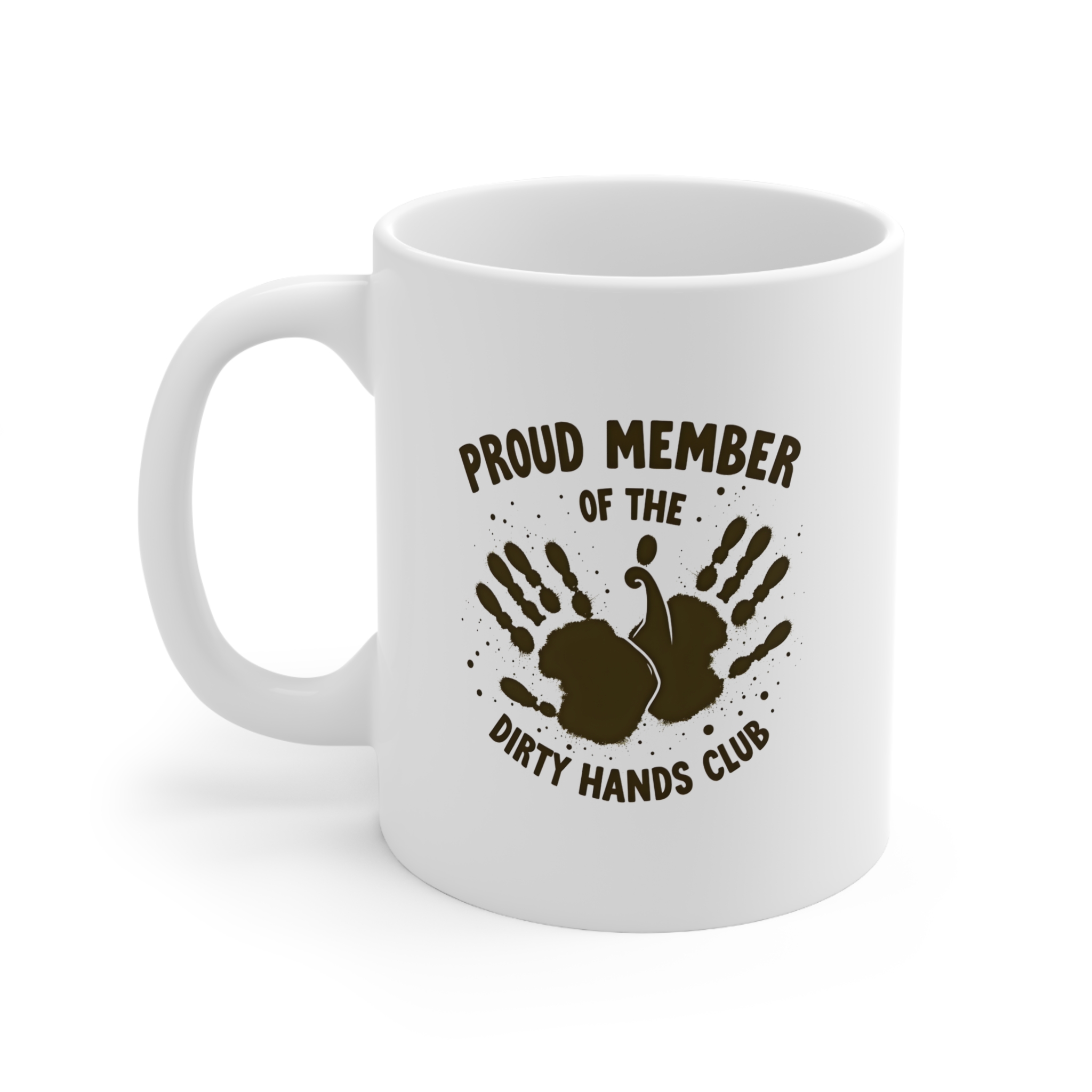 Celebrate your messy hard work with this Dirty Hands Club mug, designed with bold muddy handprints — perfect for gardeners, builders, and proud DIYers.