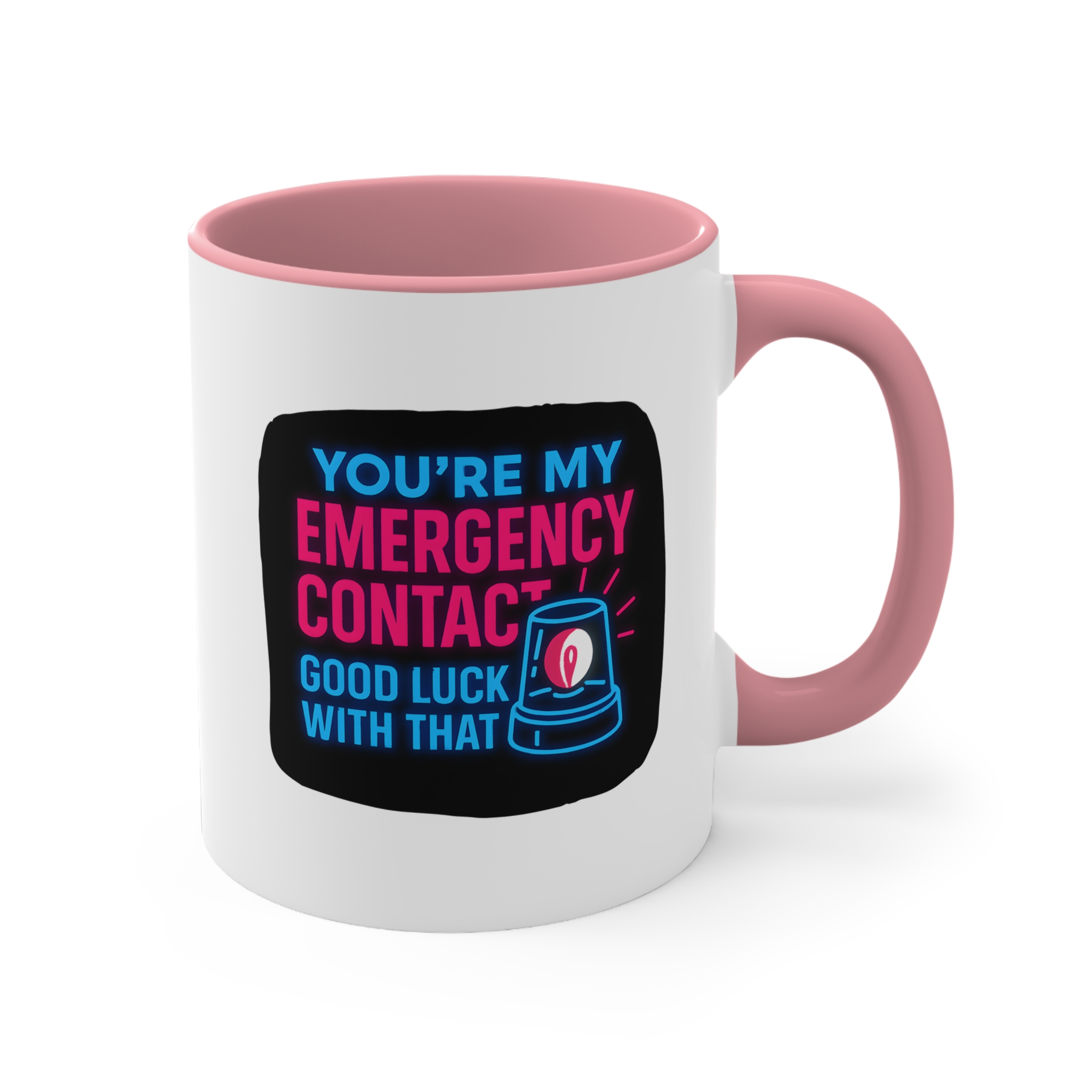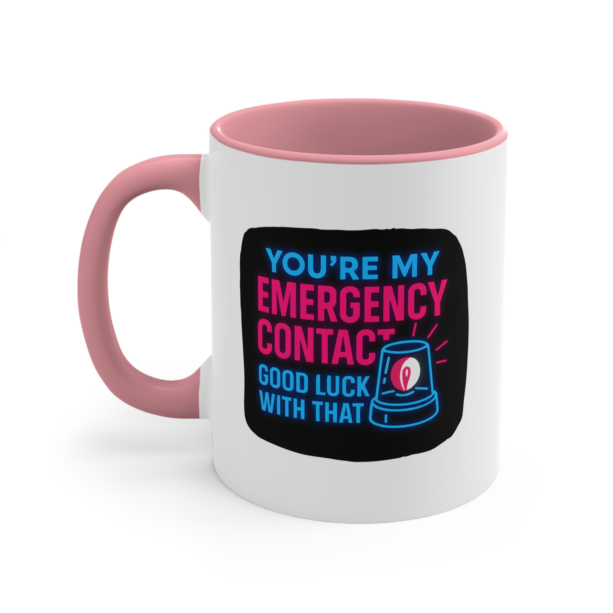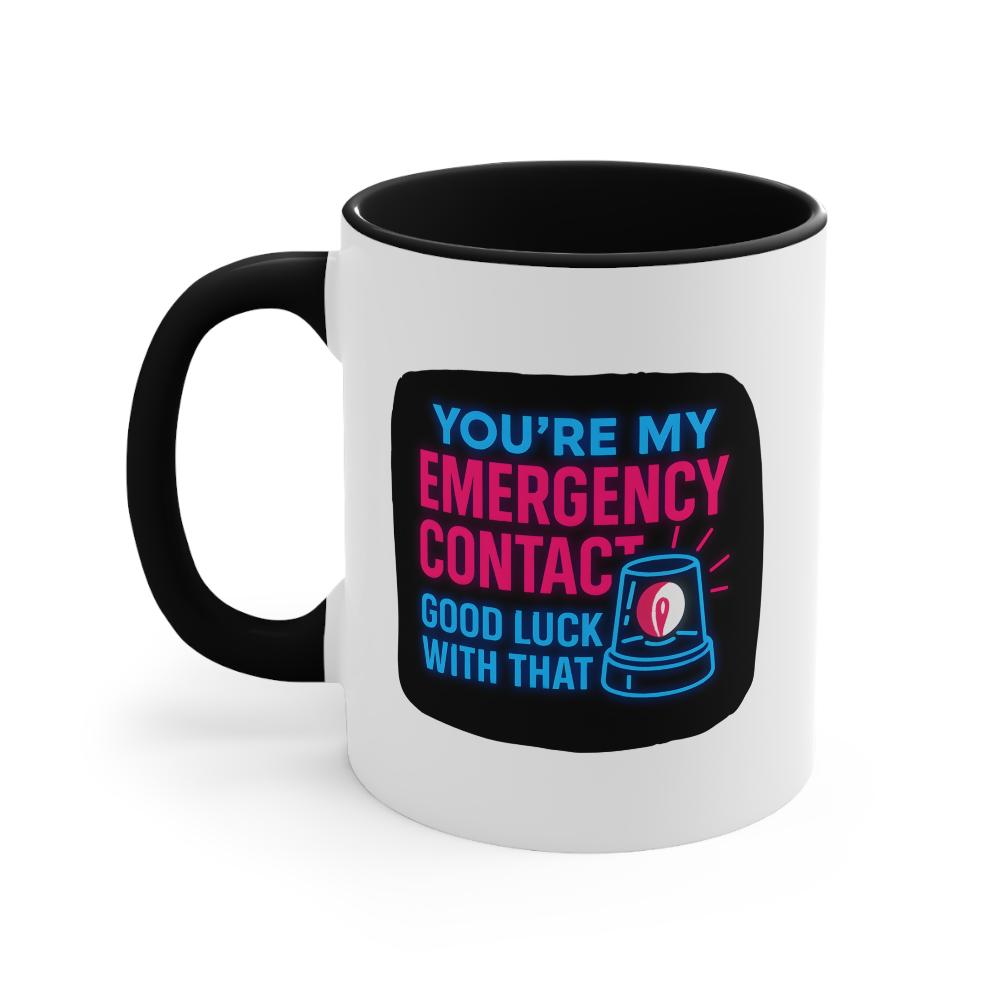 Let’s be honest—if you’re someone’s emergency contact, they’re probably already in trouble. This emergency contact mug brings dark humor and neon flair with the text: “You’re My Emergency Contact – Good Luck With That.”