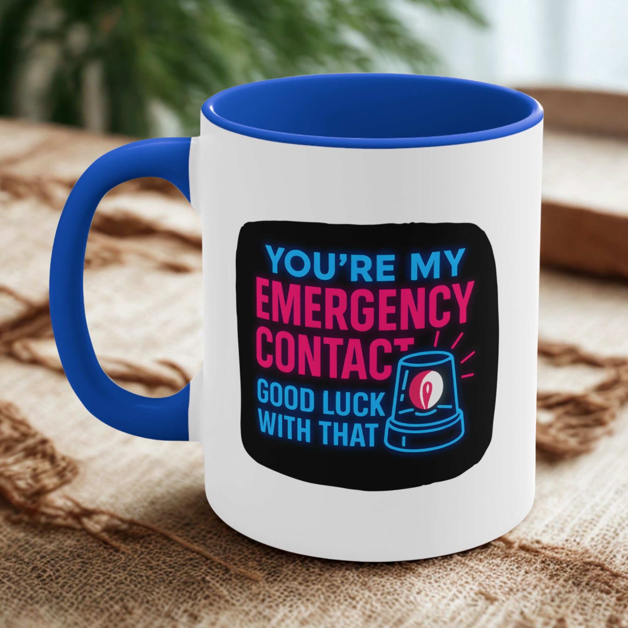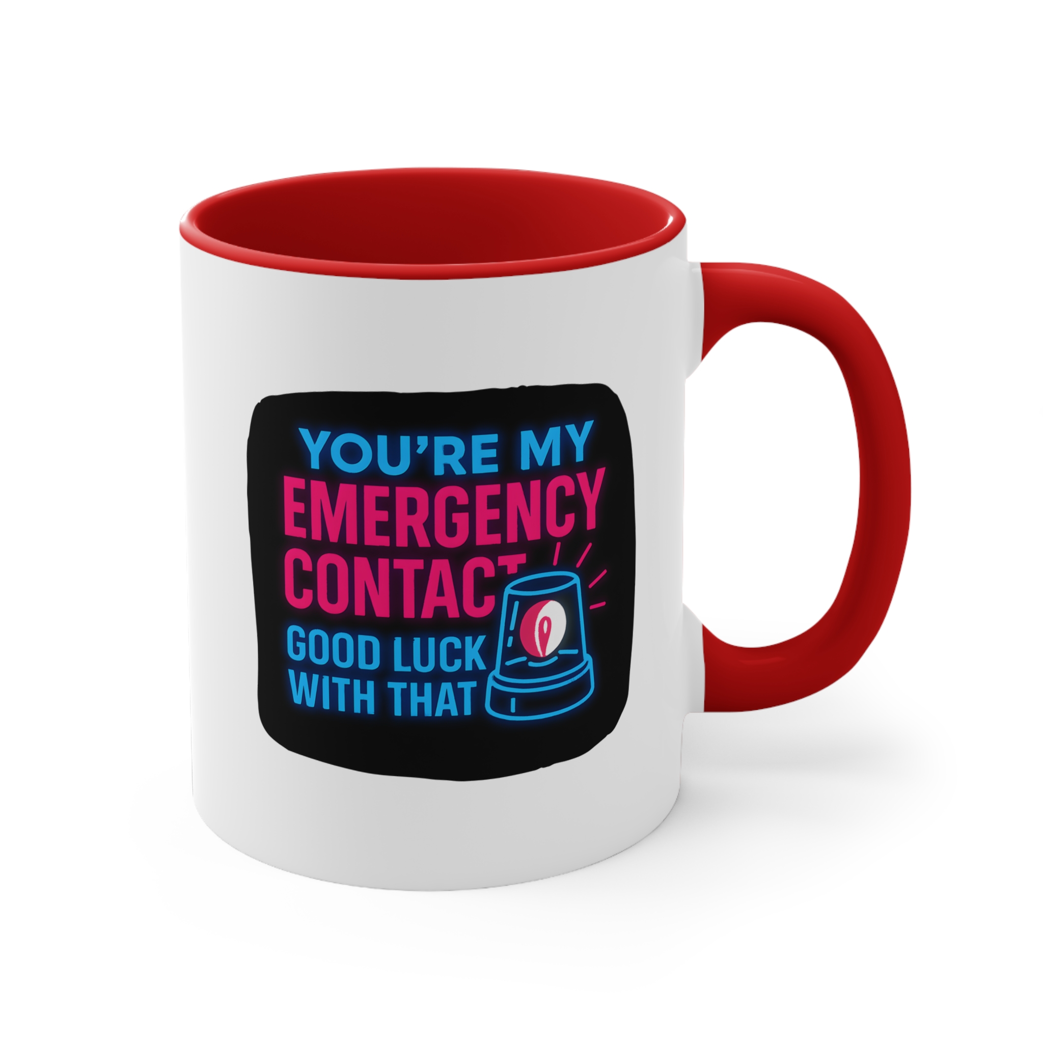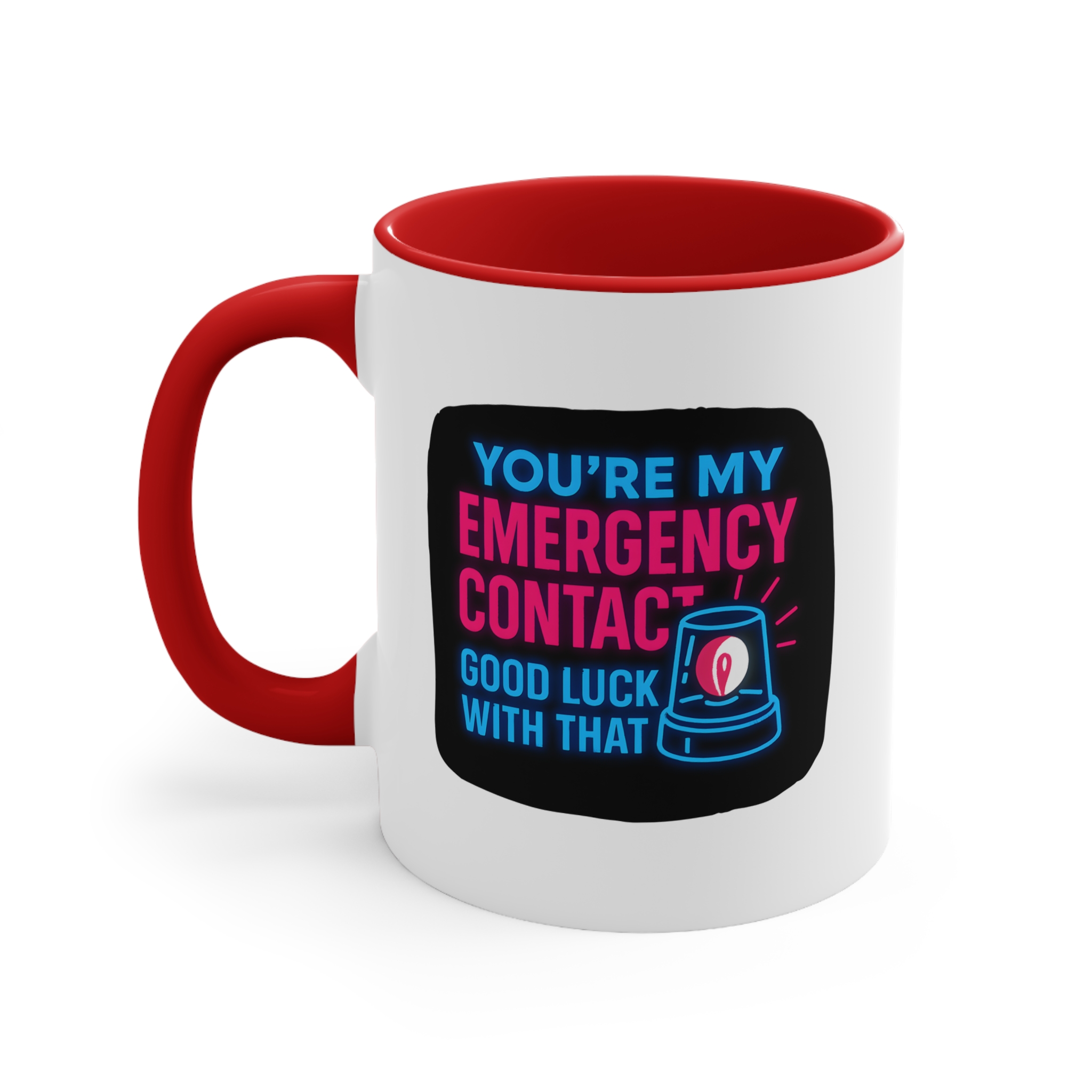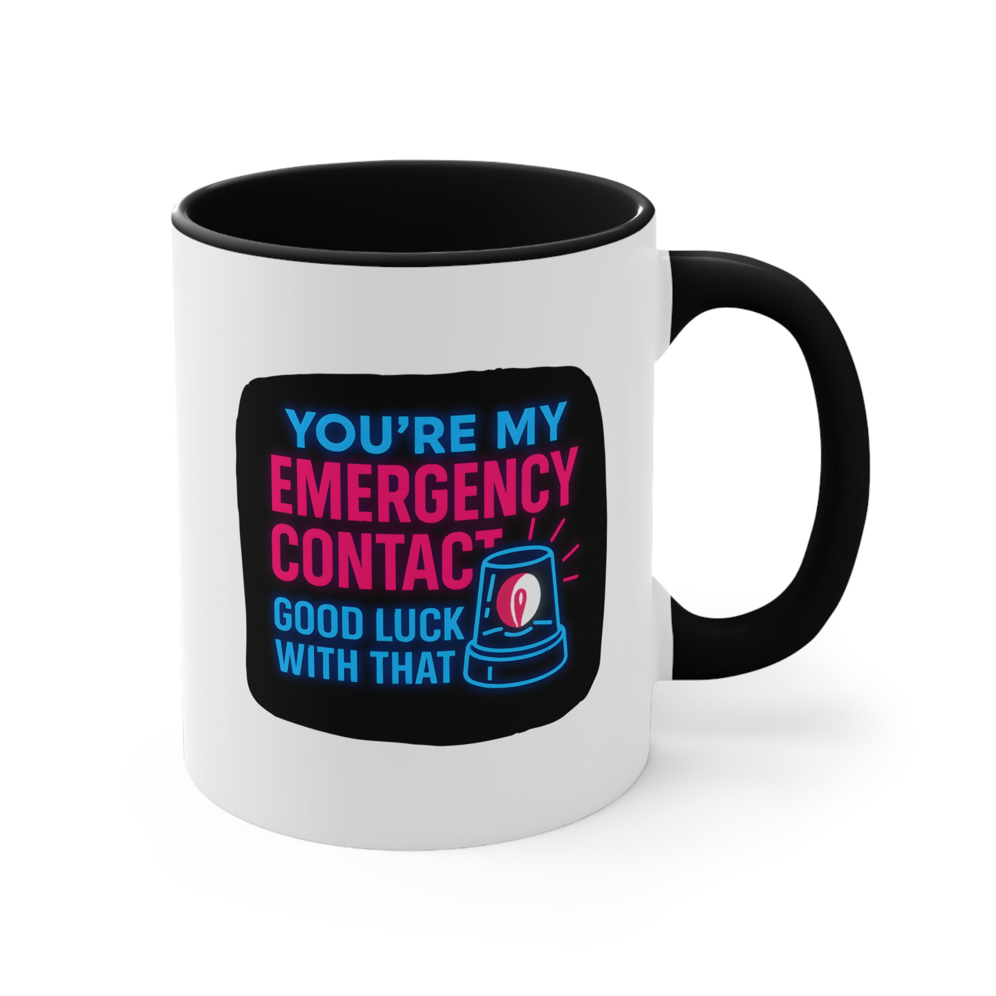 Let’s be honest—if you’re someone’s emergency contact, they’re probably already in trouble. This emergency contact mug brings dark humor and neon flair with the text: “You’re My Emergency Contact – Good Luck With That.”