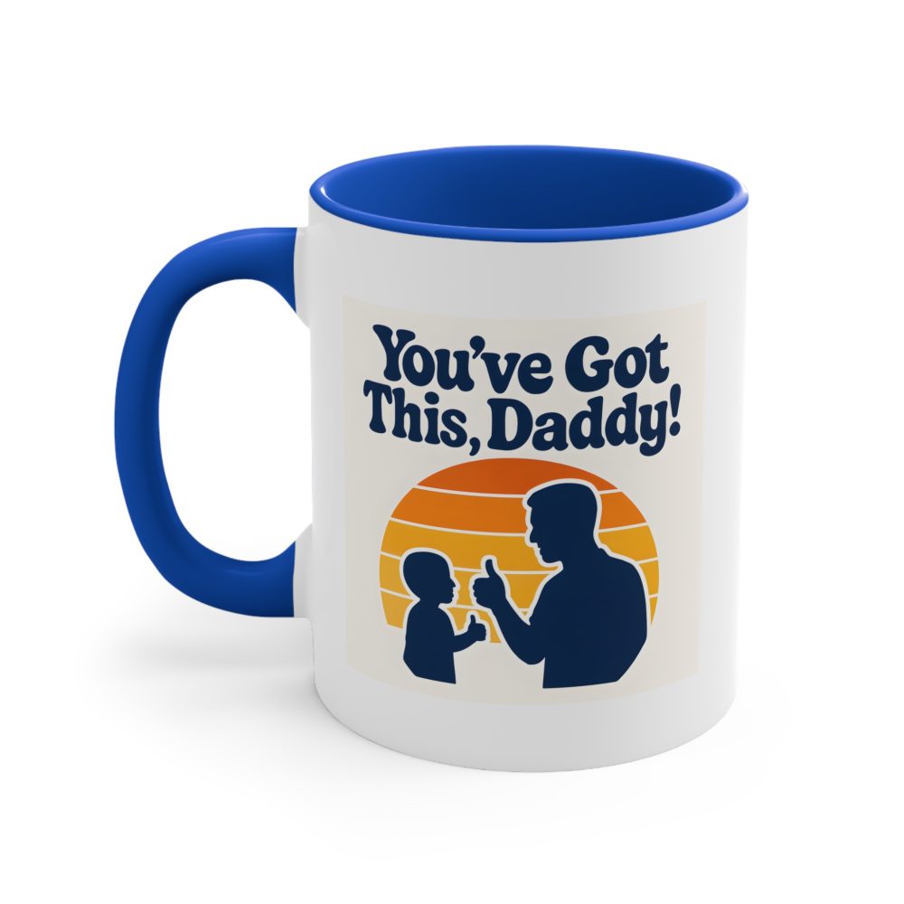 Encouragement dad mug with “You’ve Got This, Daddy!” design. 11oz ceramic with blue accents, dishwasher- and microwave-safe. A perfect motivational gift for dads.