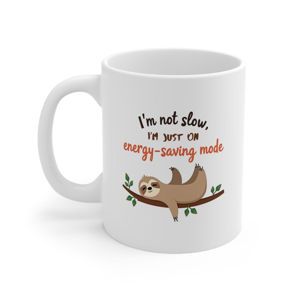Funny “Energy-Saving Mode” sloth mug with whimsical text and chill jungle vibes—perfect for slow sippers and nap advocates.
